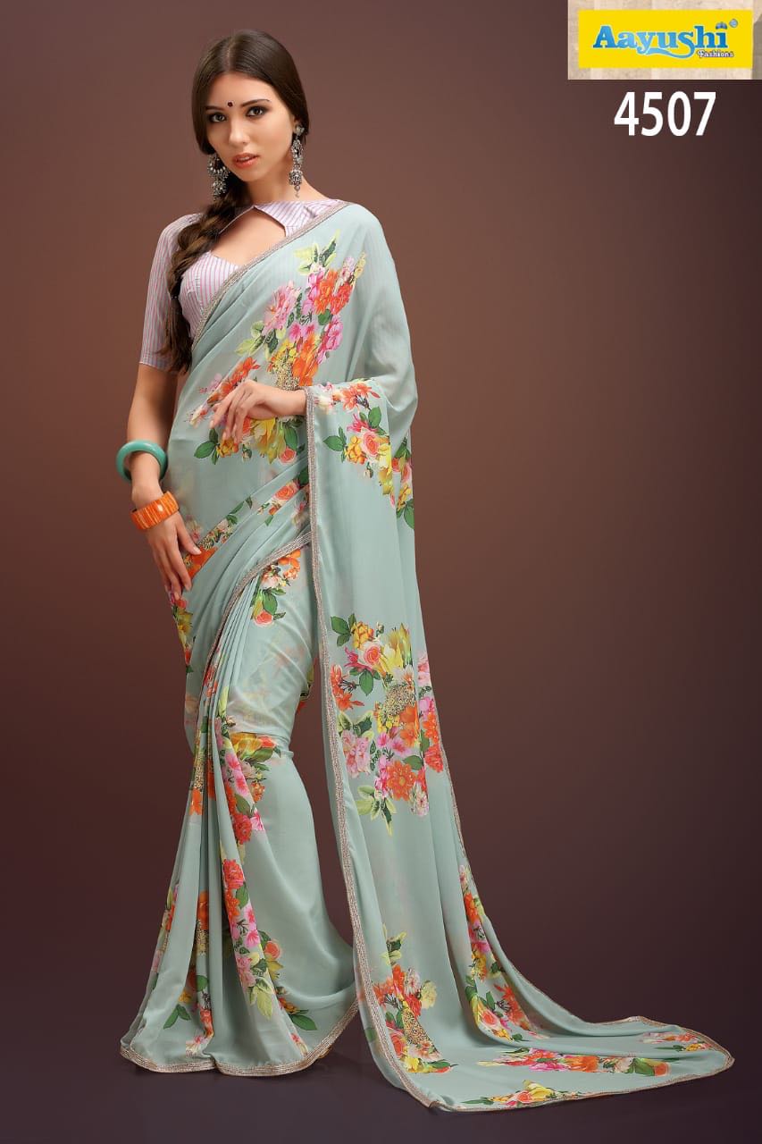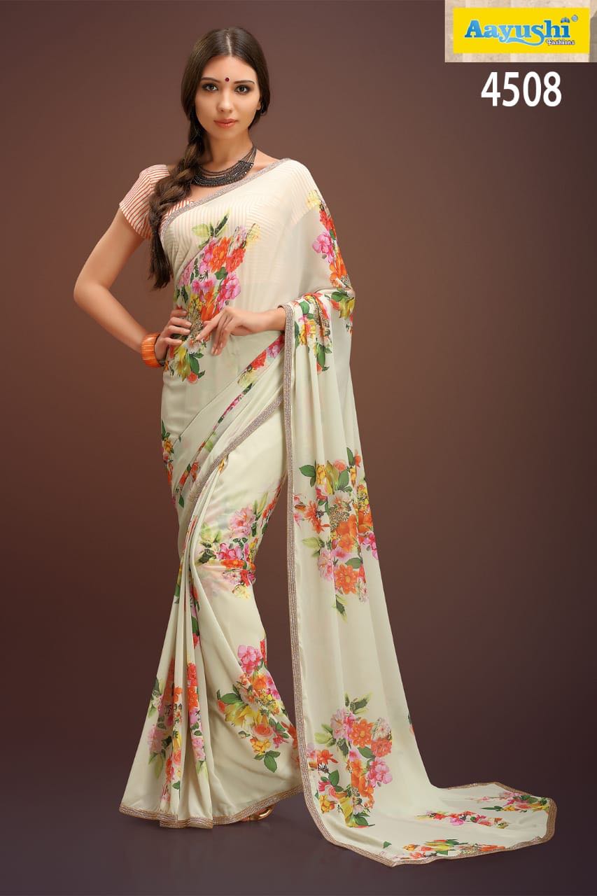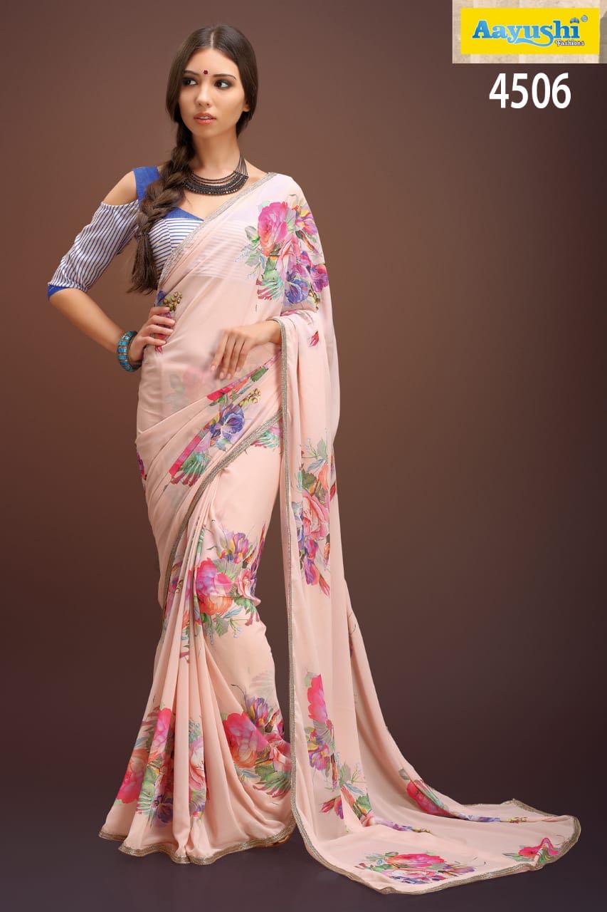 Buy Online Bold And Beautiful Sarees By Aayushi Series 4501 To 4508 Georgette Printed Sarees Wholesale Dealer And Trader Gujarat 8 Pcs of Full Catalogue at Wholesale Price. Looking for Bold And Beautiful Sarees By Aayushi Series 4501 To 4508 Georgette Printed Sarees Wholesale Dealer And Trader Gujarat Full Catalouge at Best Price? Buy Now Bold And Beautiful Sarees By Aayushi Series 4501 To 4508 Georgette Printed Sarees Wholesale Dealer And Trader Gujarat at Wholesale Rate of Rs 9600 with Total 8 Pcs from authroized dealer and supplier of Aayushi fashions Brand. Cost of Each piece is just only Rs 1200 which is very low and affordable price to resale the product in your retail store ,This is Surat based Wholesale Supplier & Dealer of Aayushi fashions Brand. Click on Brand name to Know more about Aayushi fashions Brand's products.Call or Whatsapp on 9898838984 for booking or enquiry