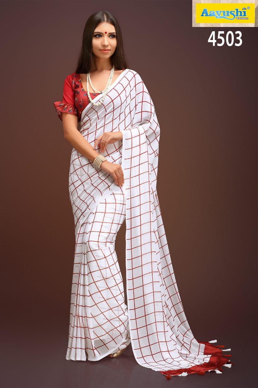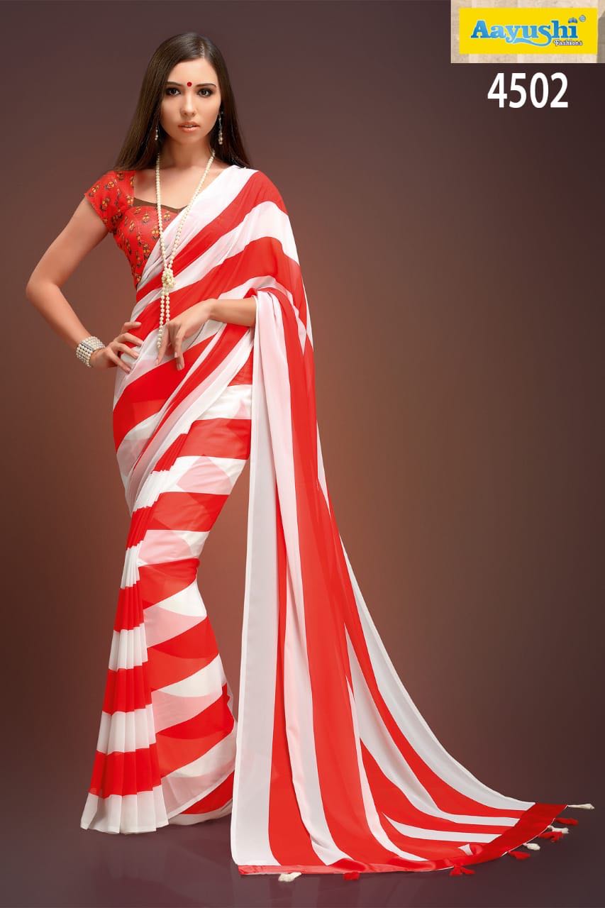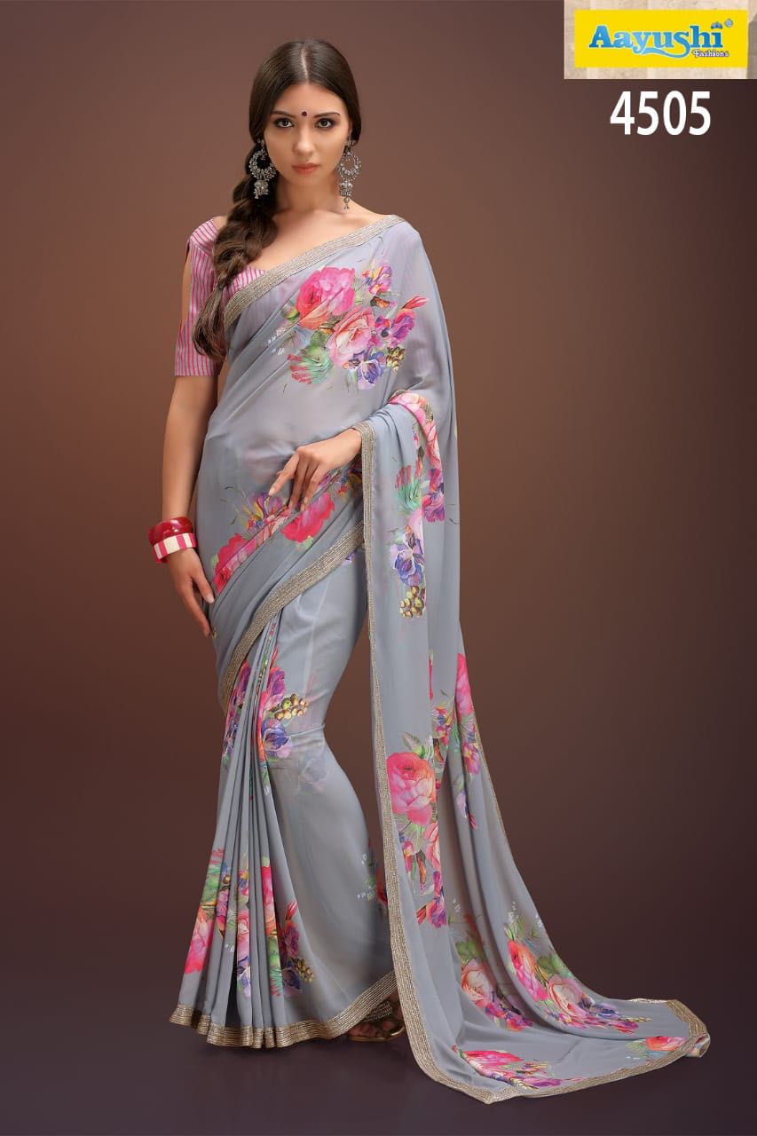 Buy Online Bold And Beautiful Sarees By Aayushi Series 4501 To 4508 Georgette Printed Sarees Wholesale Dealer And Trader Gujarat 8 Pcs of Full Catalogue at Wholesale Price. Looking for Bold And Beautiful Sarees By Aayushi Series 4501 To 4508 Georgette Printed Sarees Wholesale Dealer And Trader Gujarat Full Catalouge at Best Price? Buy Now Bold And Beautiful Sarees By Aayushi Series 4501 To 4508 Georgette Printed Sarees Wholesale Dealer And Trader Gujarat at Wholesale Rate of Rs 9600 with Total 8 Pcs from authroized dealer and supplier of Aayushi fashions Brand. Cost of Each piece is just only Rs 1200 which is very low and affordable price to resale the product in your retail store ,This is Surat based Wholesale Supplier & Dealer of Aayushi fashions Brand. Click on Brand name to Know more about Aayushi fashions Brand's products.Call or Whatsapp on 9898838984 for booking or enquiry