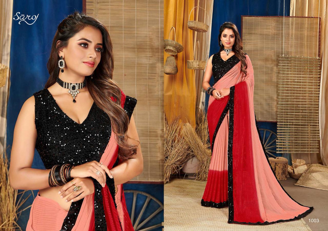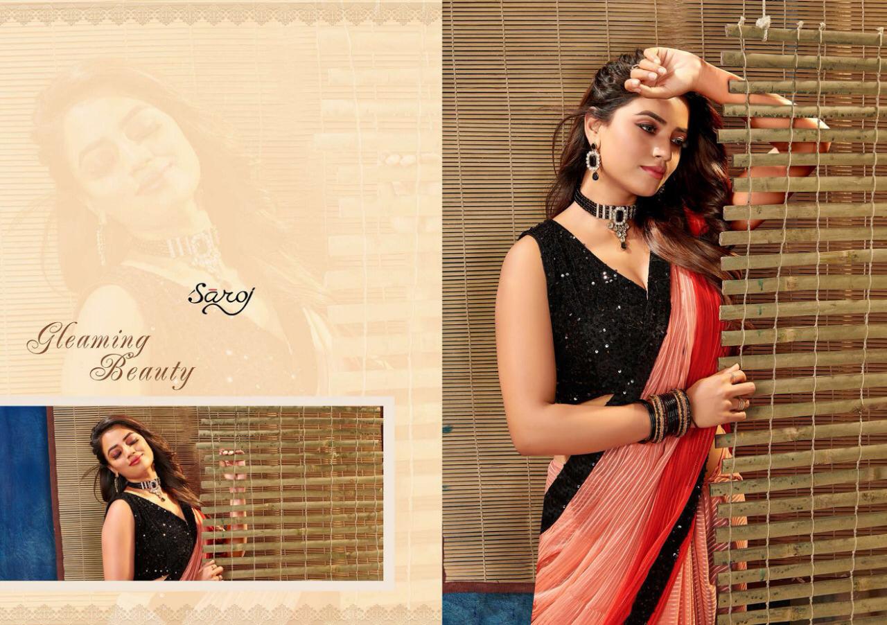 *BOLLYWOOD by saroj * Rate- 1145 per pcs . Set to set . GST 5 Percent Extra Fabric: Georgette with Satin and Jari Lining. Blouse: Silk with Heavy Sequence *(Ready-Made Blouse )*. 6 Design in sef . |