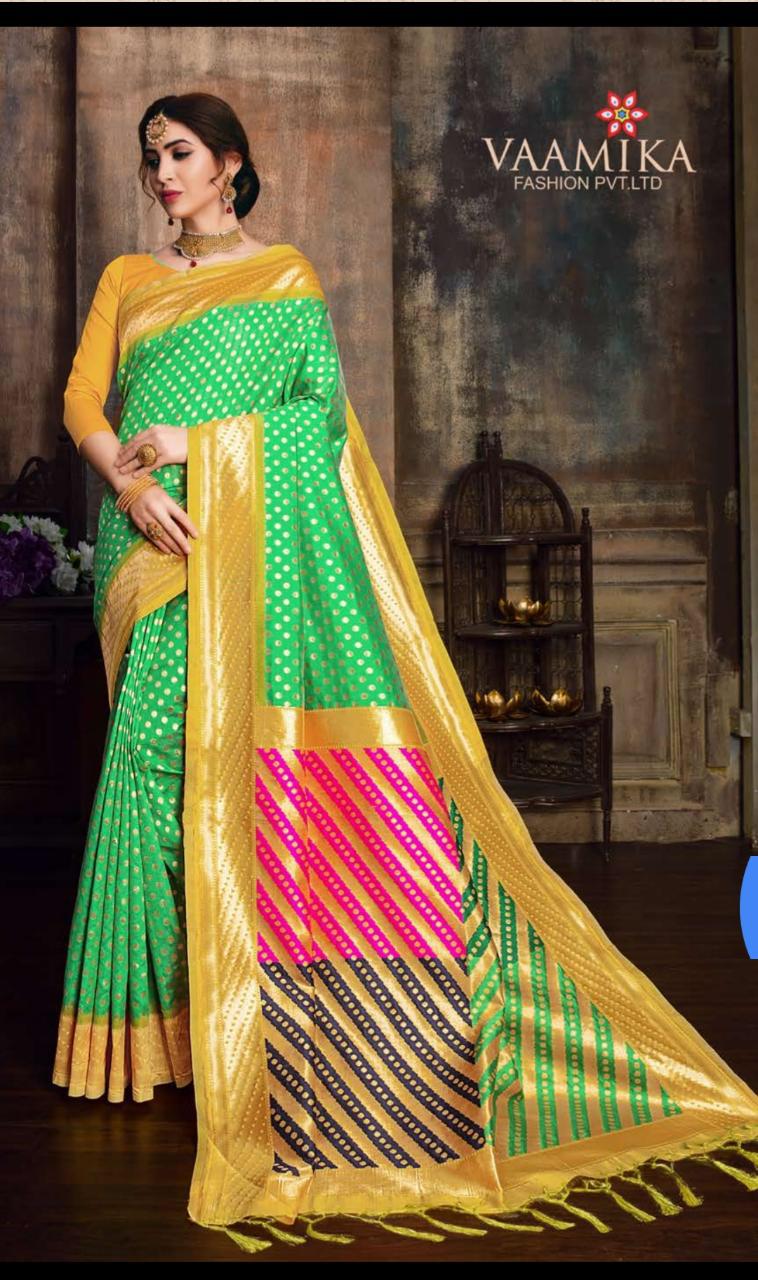 Brand - Vamika. Type -Saree. Catlog name - BOLLYWOOD COLLECITION. Set & Loose. Singles add 100 on cp P Weaving Banarsi silk Fabric. Delivery 2 days |