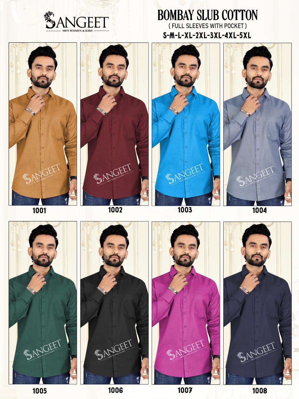 1-*BOMBAY SLUB COTTON* 2-*FULL SLLEVES SHIRT* 3-*S-M-L-XL-XXL-3XL-4XL-5XL* 4-*8-COLOURS* 5-*1-DESIGN* 6-*8-SIZES* 7-*RATE-300/-* |