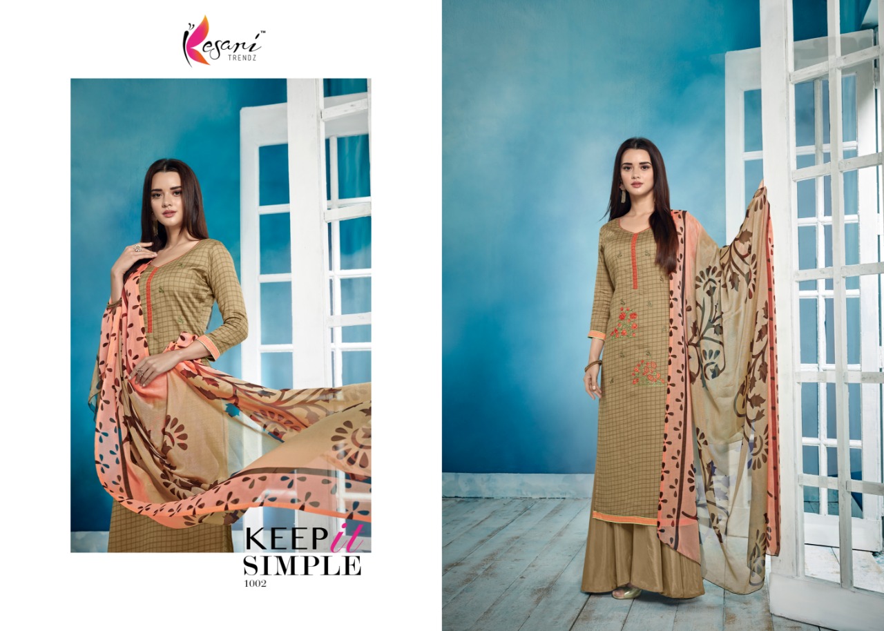 Kesari Trendz has Launched a new catalogue of dress material. Name : Brasso Dupatta Vol 1 Designs : 8 Now New volume "Brasso Dupatta-vo1 *Special brasso print dupatta* fabrics details are given below: Top: pure Cotton Satin ( self Embroidary work) Bottom: Semi Lown Dup: Brasso Print Price: ? 699/- GST 5 Percent Extra. Pettern: straight Daspich: 20-09-2018 BY :- Kesari trendz |