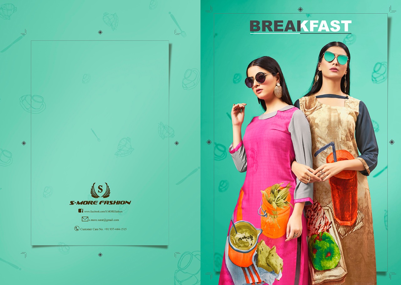 Buy Online Breakfast By S More Fashion Reyon Digital Printed Kurtis Wholesale Supplier Nd Dealer Surat 12 Pcs of Full Catalogue at Wholesale Price. Looking for Breakfast By S More Fashion Reyon Digital Printed Kurtis Wholesale Supplier Nd Dealer Surat Full Catalouge at Best Price? Buy Now Breakfast By S More Fashion Reyon Digital Printed Kurtis Wholesale Supplier Nd Dealer Surat at Wholesale Rate of Rs 3840 with Total 12 Pcs from authroized dealer and supplier of S MORE FASHION Brand. Cost of Each piece is just only Rs 320 which is very low and affordable price to resale the product in your retail store ,This is Surat based Wholesale Supplier & Dealer of S MORE FASHION Brand. Click on Brand name to Know more about S MORE FASHION Brand's products.Call or Whatsapp on 9898838984 for booking or enquiry