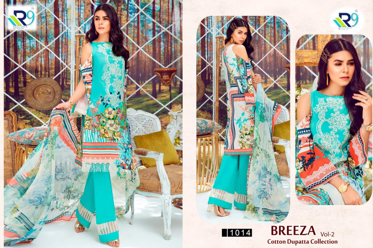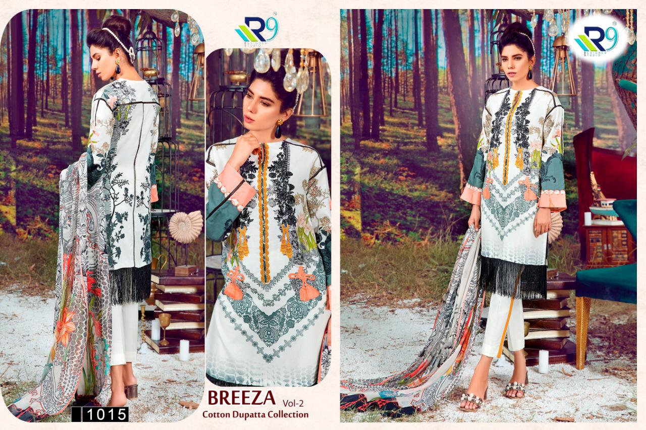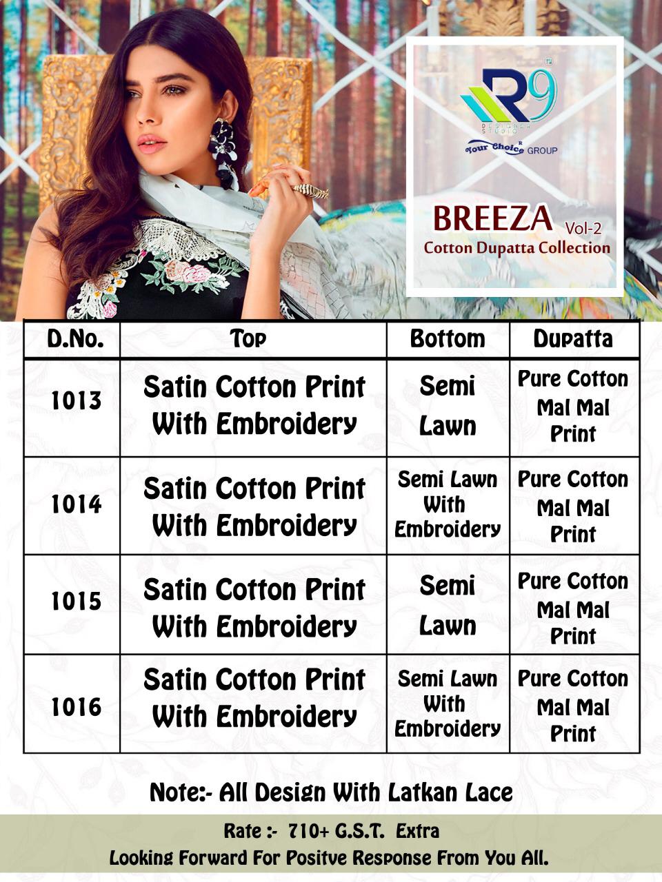 Â?R9Â? brand presents our new catalog new colours & pattern CatalogÂ?Â?Â?- BREEZA-2 fabricsÂ?Â? Top - satin cotton print with embroidery Bottom - semi lawn with embroidery Dupatta -pure cotton mal mal print Rate - 710/- desÂ?Â?Â?Â?-4 pcs only Note:- design with latkan lace limited stock sir LOOKING FORWARD FOR GOOD RESPONSE |