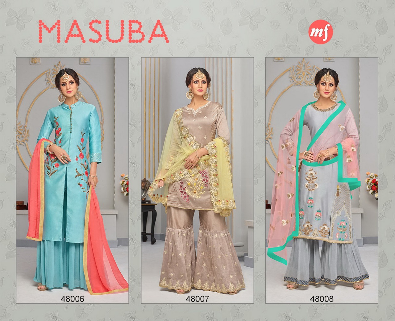 Buy Online Bridal Collection By Mahaveer Fashion Masuba 48006 Series Designer Garara Suit Catlog Wholesale Dealer And Supplier Surat 3 Pcs of Full Catalogue at Wholesale Price. Looking for Bridal Collection By Mahaveer Fashion Masuba 48006 Series Designer Garara Suit Catlog Wholesale Dealer And Supplier Surat Full Catalouge at Best Price? Buy Now Bridal Collection By Mahaveer Fashion Masuba 48006 Series Designer Garara Suit Catlog Wholesale Dealer And Supplier Surat at Wholesale Rate of Rs 3885 with Total 3 Pcs from authroized dealer and supplier of MAHAVEER FASHION Brand. Cost of Each piece is just only Rs 1295 which is very low and affordable price to resale the product in your retail store ,This is Surat based Wholesale Supplier & Dealer of MAHAVEER FASHION Brand. Click on Brand name to Know more about MAHAVEER FASHION Brand's products.Call or Whatsapp on 9898838984 for booking or enquiry