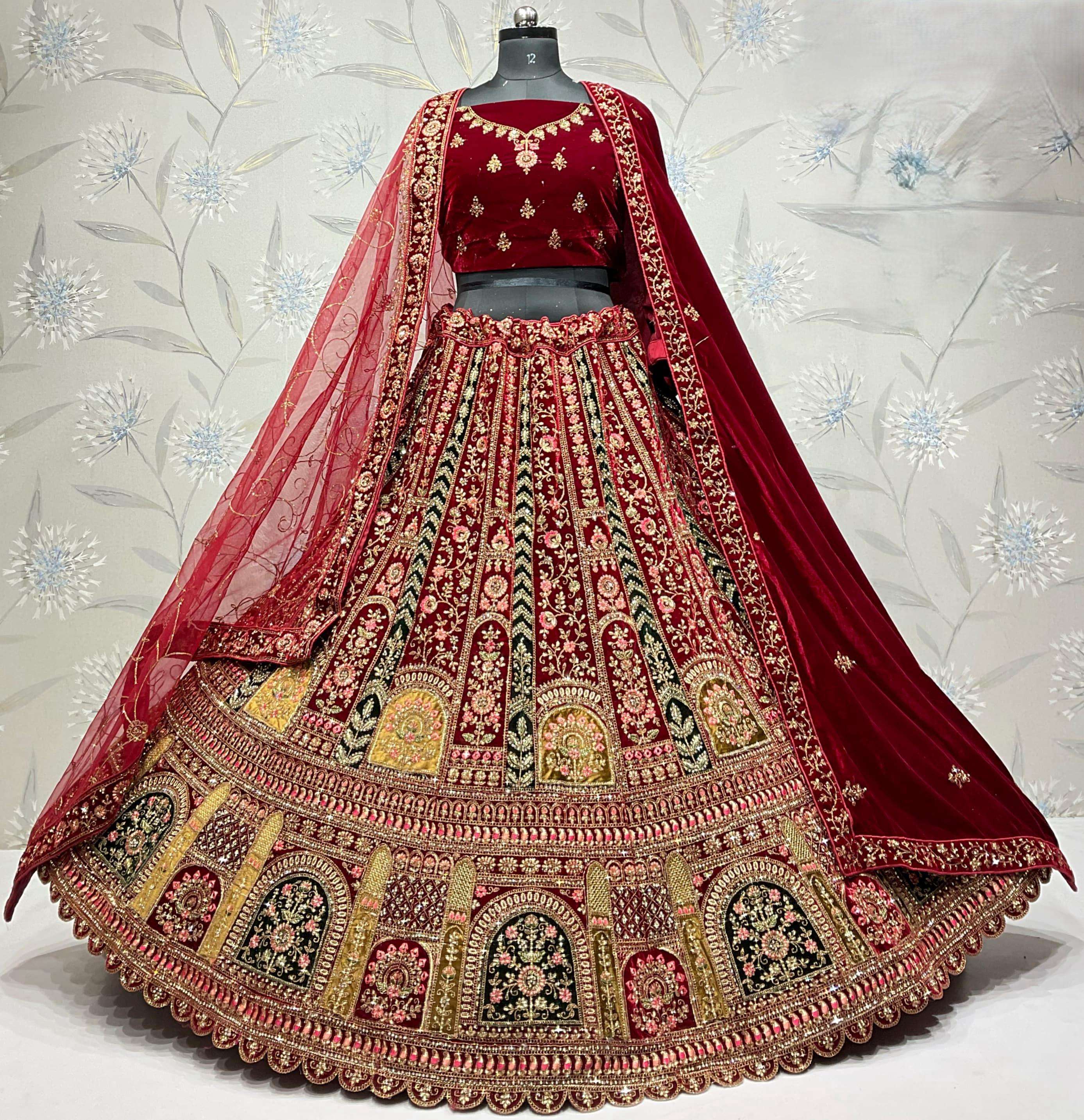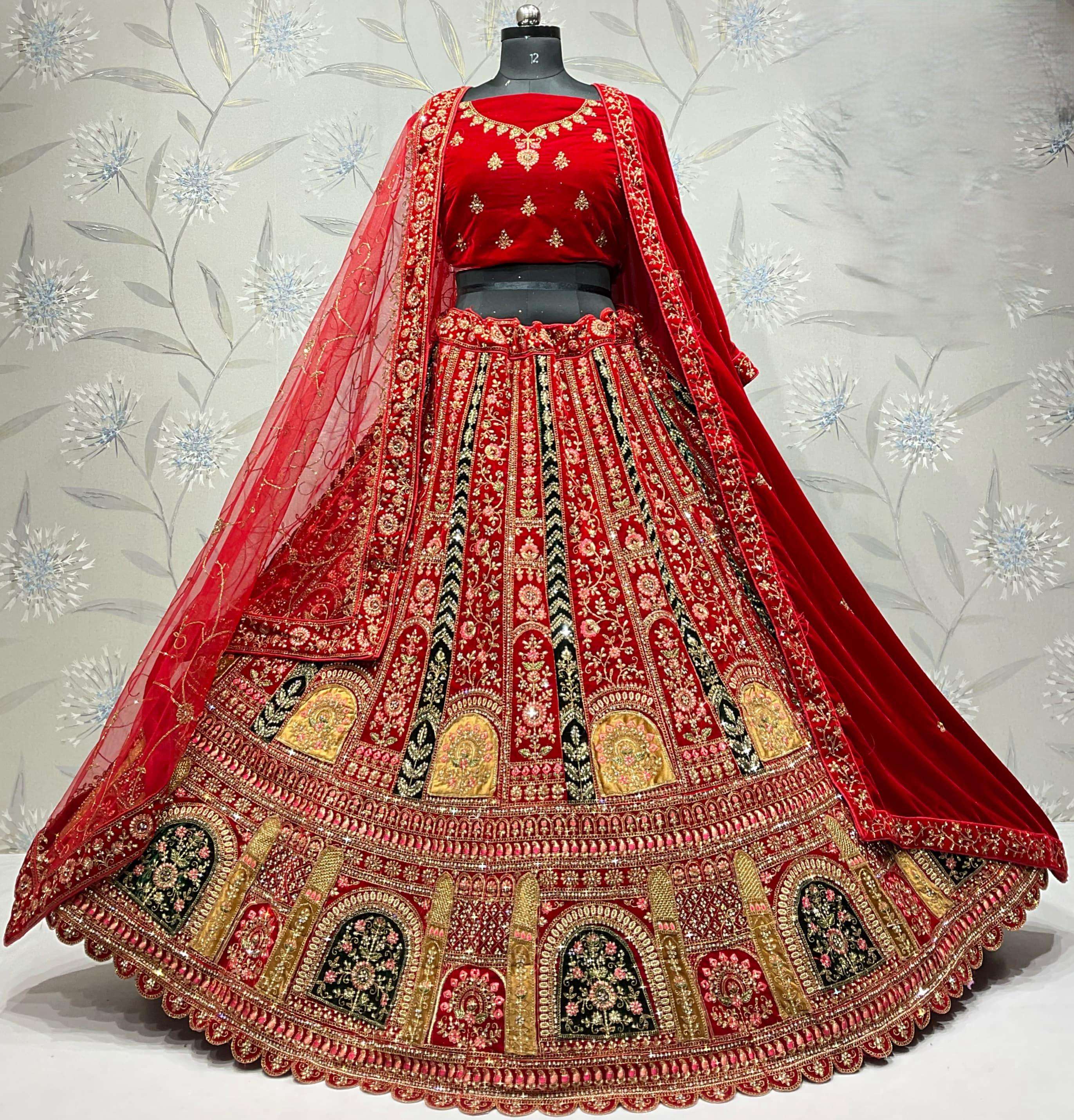 *Fabric and Stitching Details* - *Fabric:* - Lehenga: velvet - Dupatta: net+velvet two - Blouse: velvet - *Stitching:* - Lehenga: Semi-stitched with double shantoon inner and can-can layers - Blouse: Unstitched