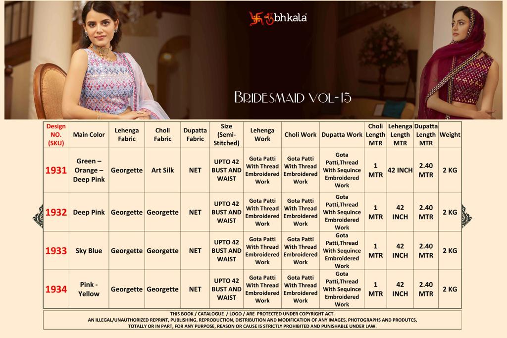 Buy Online Bridesmaid Vol 15 By Shubhkala Exclusive Bridal Lehenga Choli Collection Manufacturer Surat 4 Pcs of Full Catalogue at Wholesale Price. Looking for Bridesmaid Vol 15 By Shubhkala Exclusive Bridal Lehenga Choli Collection Manufacturer Surat Full Catalouge at Best Price? Buy Now Bridesmaid Vol 15 By Shubhkala Exclusive Bridal Lehenga Choli Collection Manufacturer Surat at Wholesale Rate of Rs 14000 with Total 4 Pcs from authroized dealer and supplier of Brand. Cost of Each piece is just only Rs 3500 which is very low and affordable price to resale the product in your retail store ,This is Surat based Wholesale Supplier & Dealer of Brand. Click on Brand name to Know more about Brand's products.Call or Whatsapp on 9898838984 for booking or enquiry