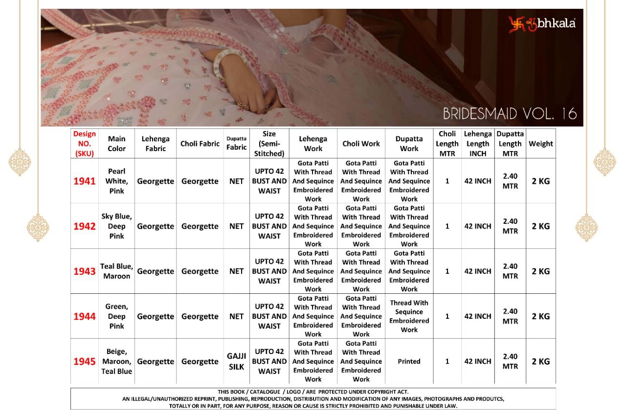 Buy Online Bridesmaid Vol 16 By Shubhkala Lehanga Choli Single And Set Stockiest And Supplier From Surat 5 Pcs of Full Catalogue at Wholesale Price. Looking for Bridesmaid Vol 16 By Shubhkala Lehanga Choli Single And Set Stockiest And Supplier From Surat Full Catalouge at Best Price? Buy Now Bridesmaid Vol 16 By Shubhkala Lehanga Choli Single And Set Stockiest And Supplier From Surat at Wholesale Rate of Rs 17500 with Total 5 Pcs from authroized dealer and supplier of Brand. Cost of Each piece is just only Rs 3500 which is very low and affordable price to resale the product in your retail store ,This is Surat based Wholesale Supplier & Dealer of Brand. Click on Brand name to Know more about Brand's products.Call or Whatsapp on 9898838984 for booking or enquiry