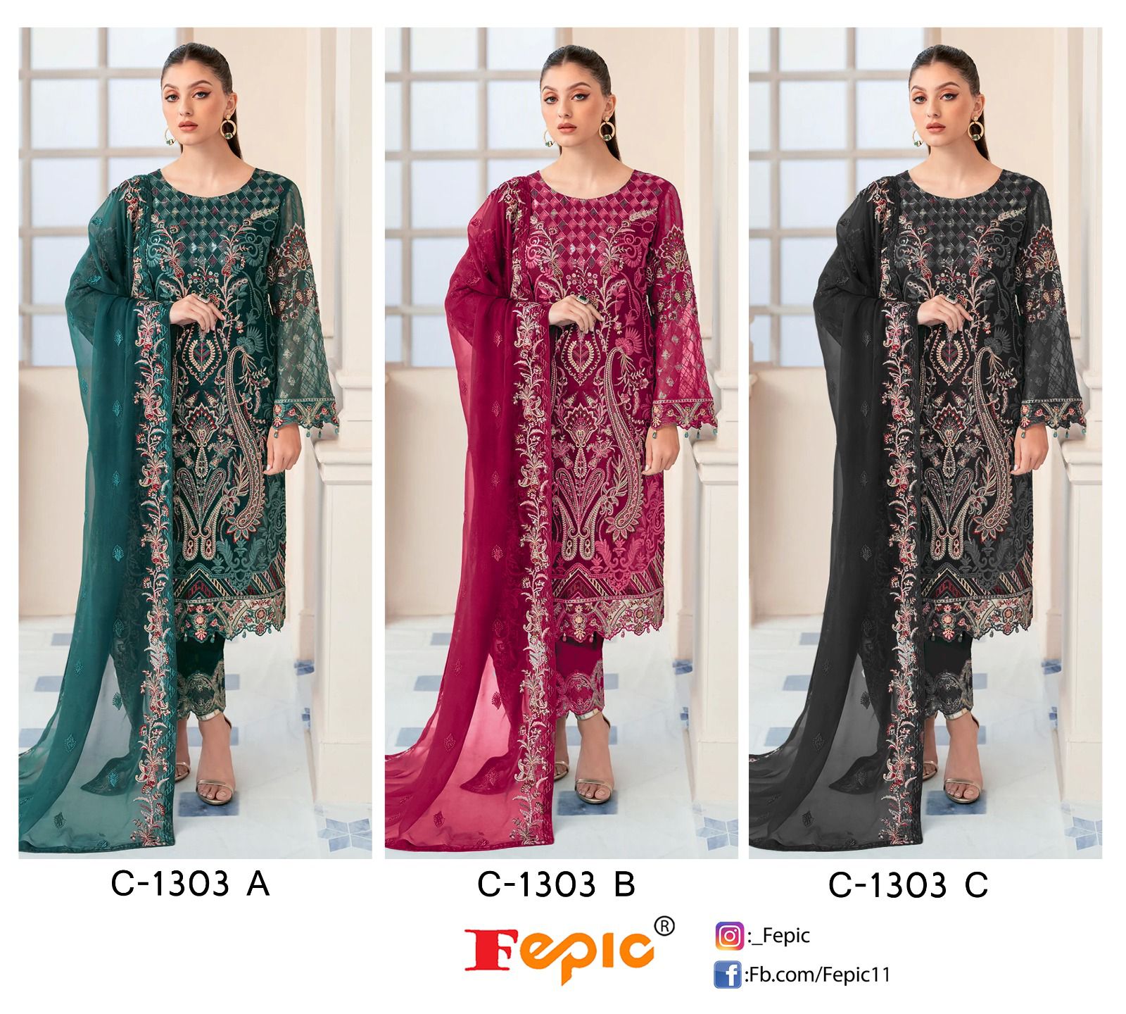Buy Online C 1303 Rosemeen By Fepic Pakistani Suit 3 Pcs of Full Catalogue at Wholesale Price. Looking for C 1303 Rosemeen By Fepic Pakistani Suit Full Catalouge at Best Price? Buy Now C 1303 Rosemeen By Fepic Pakistani Suit at Wholesale Rate of Rs 3843 with Total 3 Pcs from authroized dealer and supplier of FEPIC Brand. Cost of Each piece is just only Rs 1281 which is very low and affordable price to resale the product in your retail store ,This is Surat based Wholesale Supplier & Dealer of FEPIC Brand. Click on Brand name to Know more about FEPIC Brand's products.Call or Whatsapp on 9898838984 for booking or enquiry