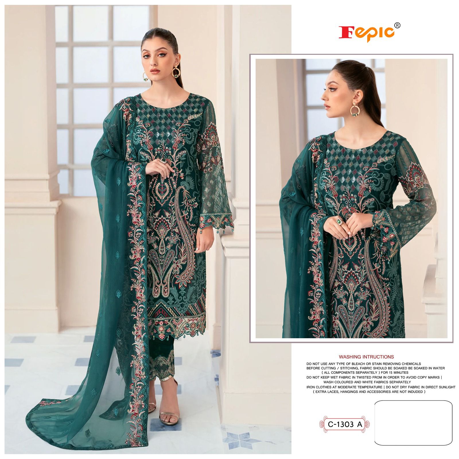 _*BRAND NAME*_:- FEPIC _*CATALOUGE NAME*_:- C 1303 ROSEMEEN BY FEPIC _*D NO*_:- C 1303 _*Top*_:- GEORGETTE EMBROIDERED _*Dupatta*_:- NAZMEEN EMBROIDERED _*Bottom*_:- SANTOON WITH EMBROIDERED PAYAL BUNCHES _*INNER*_:- SANTOON _* RATE*_:-1281/- GST SHIP EXTRA Single 100+ |