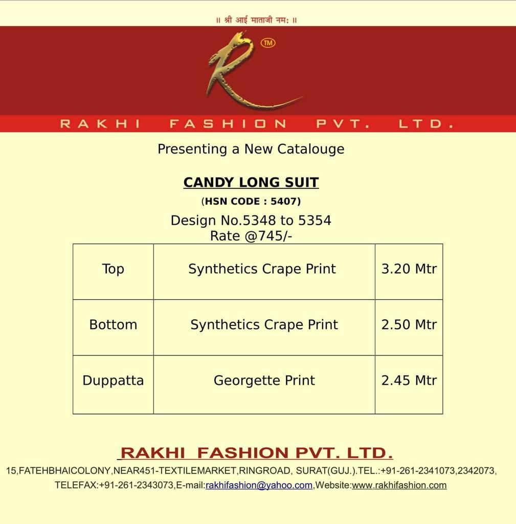 Buy Online Candy Long Suits By Rakhi 5348 Series Fancy Crepe Printed Salwar Kameez Catlog Wholesale Dealer Surat 14 Pcs of Full Catalogue at Wholesale Price. Looking for Candy Long Suits By Rakhi 5348 Series Fancy Crepe Printed Salwar Kameez Catlog Wholesale Dealer Surat Full Catalouge at Best Price? Buy Now Candy Long Suits By Rakhi 5348 Series Fancy Crepe Printed Salwar Kameez Catlog Wholesale Dealer Surat at Wholesale Rate of Rs 10430 with Total 14 Pcs from authroized dealer and supplier of Brand. Cost of Each piece is just only Rs 745 which is very low and affordable price to resale the product in your retail store ,This is Surat based Wholesale Supplier & Dealer of Brand. Click on Brand name to Know more about Brand's products.Call or Whatsapp on 9898838984 for booking or enquiry