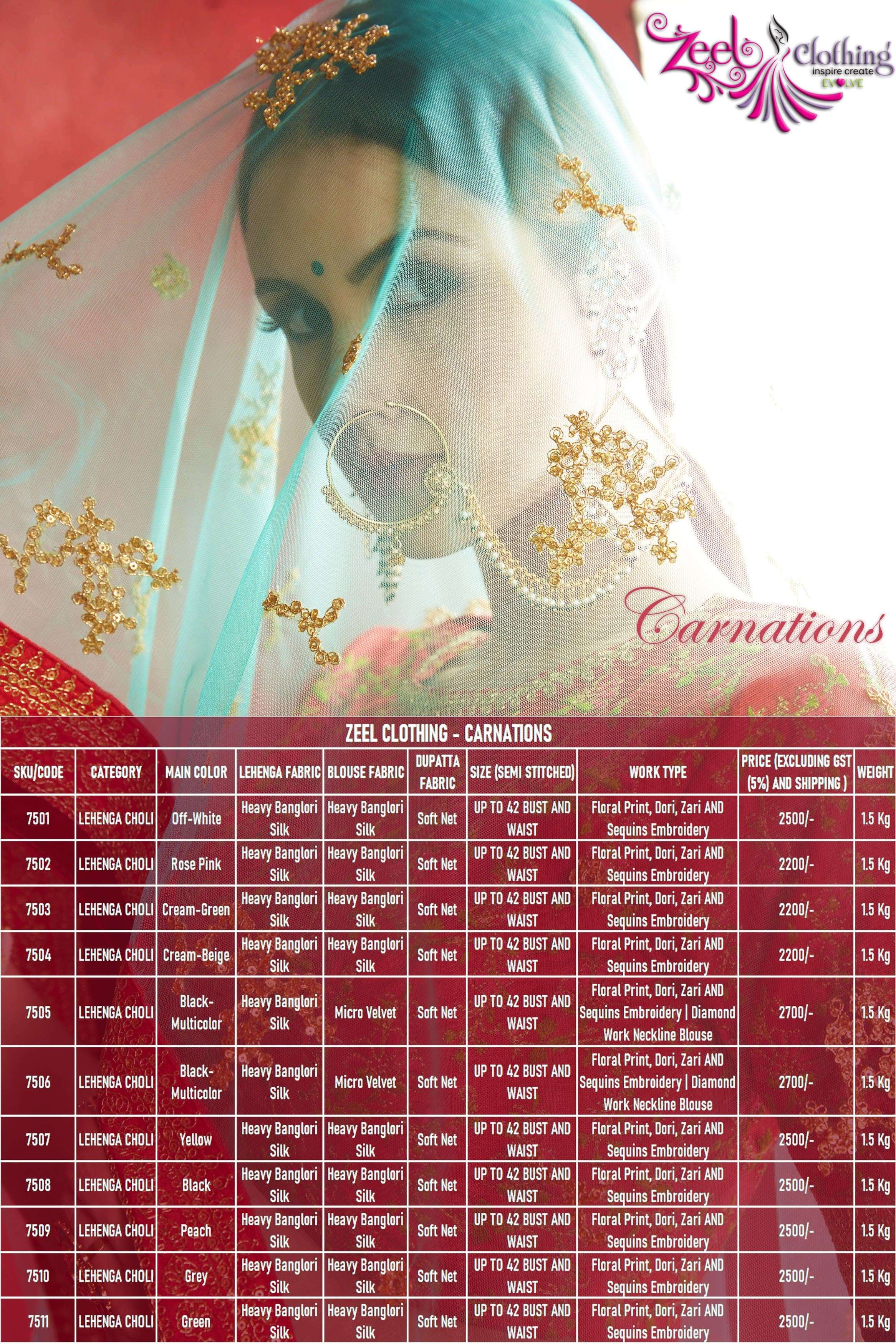Buy Online CARNATIONS VOL 1 by Zeel Clothing Lehenga collection manufacturers surat 11 Pcs of Full Catalogue at Wholesale Price. Looking for CARNATIONS VOL 1 by Zeel Clothing Lehenga collection manufacturers surat Full Catalouge at Best Price? Buy Now CARNATIONS VOL 1 by Zeel Clothing Lehenga collection manufacturers surat at Wholesale Rate of Rs 0 with Total 11 Pcs from authroized dealer and supplier of Zeel Clothing Brand. Cost of Each piece is just only Rs 0 which is very low and affordable price to resale the product in your retail store ,This is Surat based Wholesale Supplier & Dealer of Zeel Clothing Brand. Click on Brand name to Know more about Zeel Clothing Brand's products.Call or Whatsapp on 9898838984 for booking or enquiry