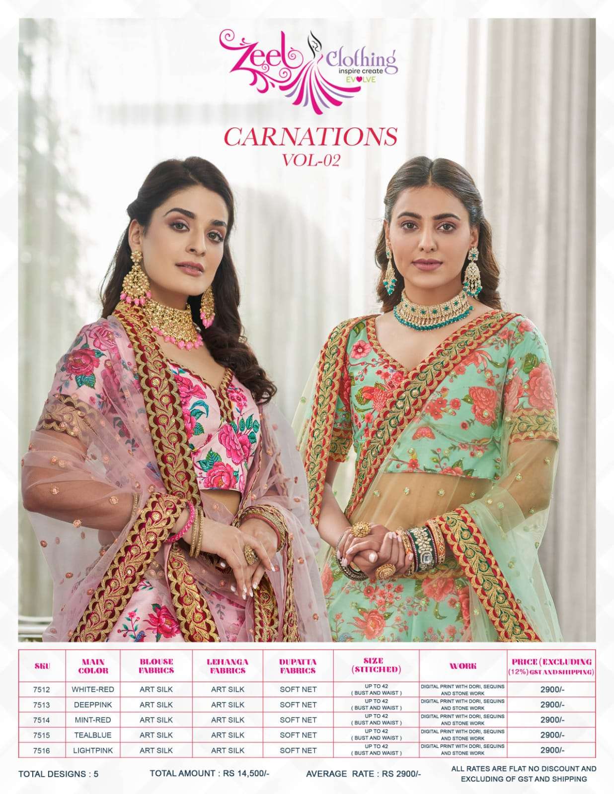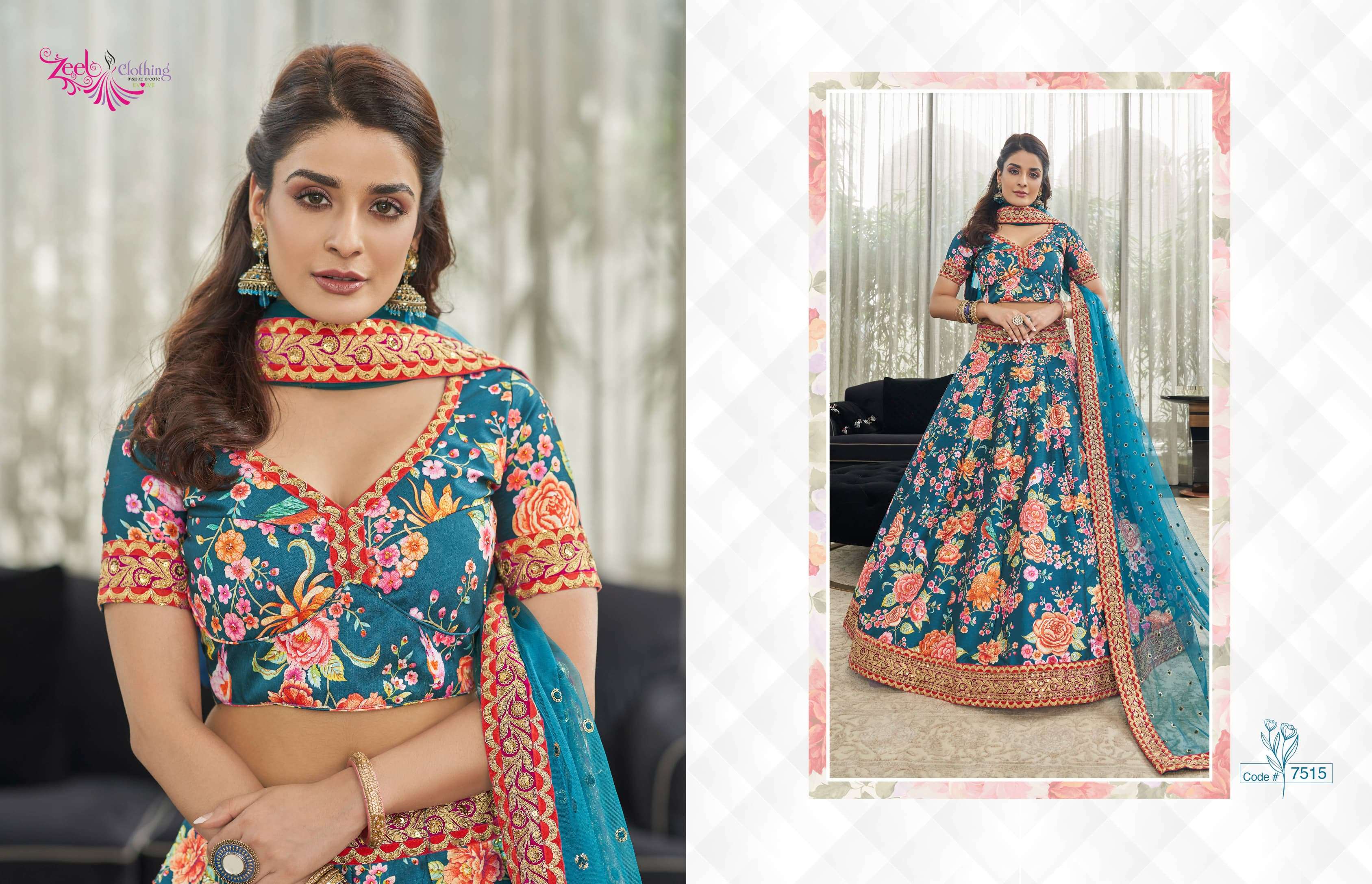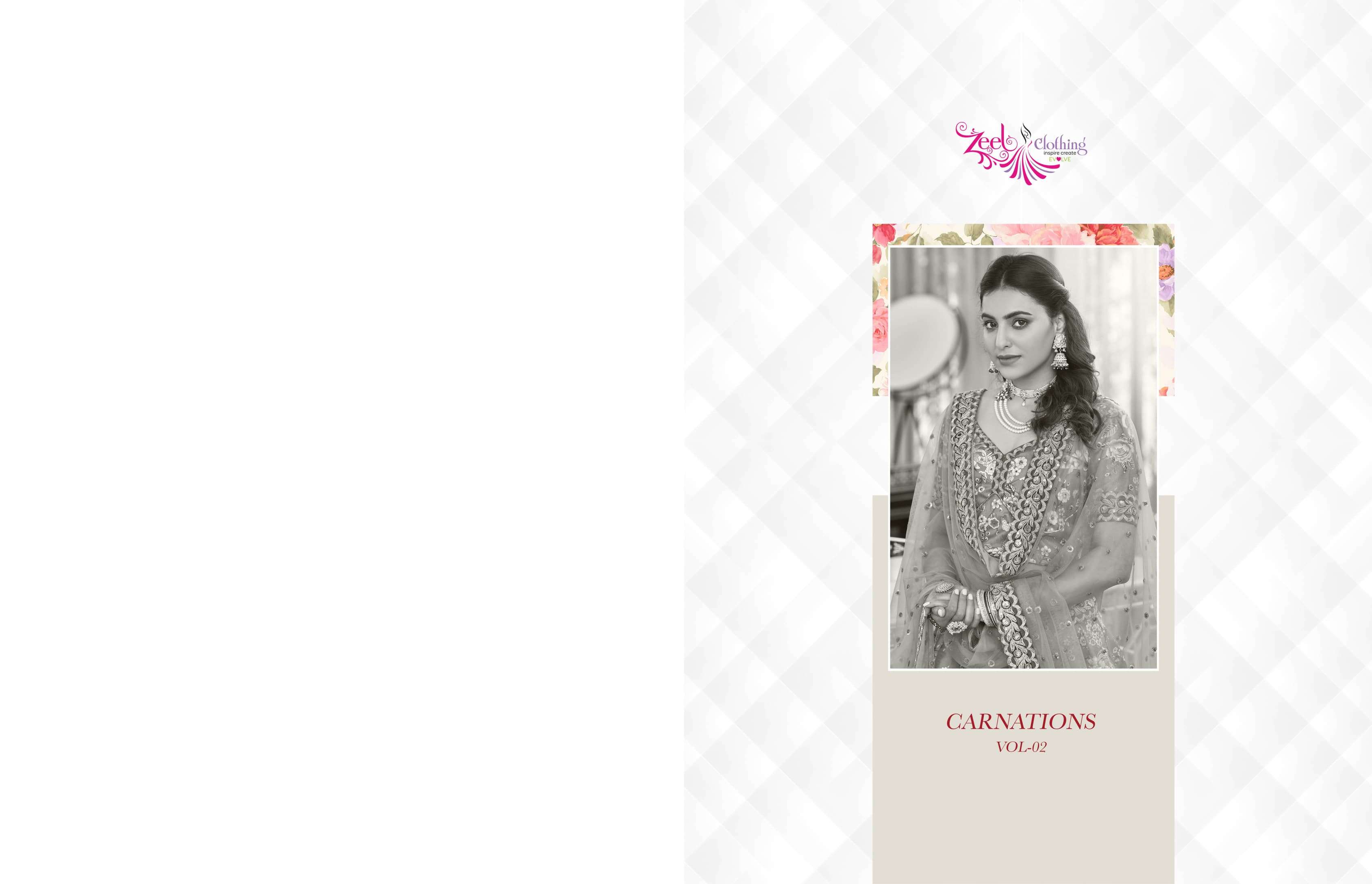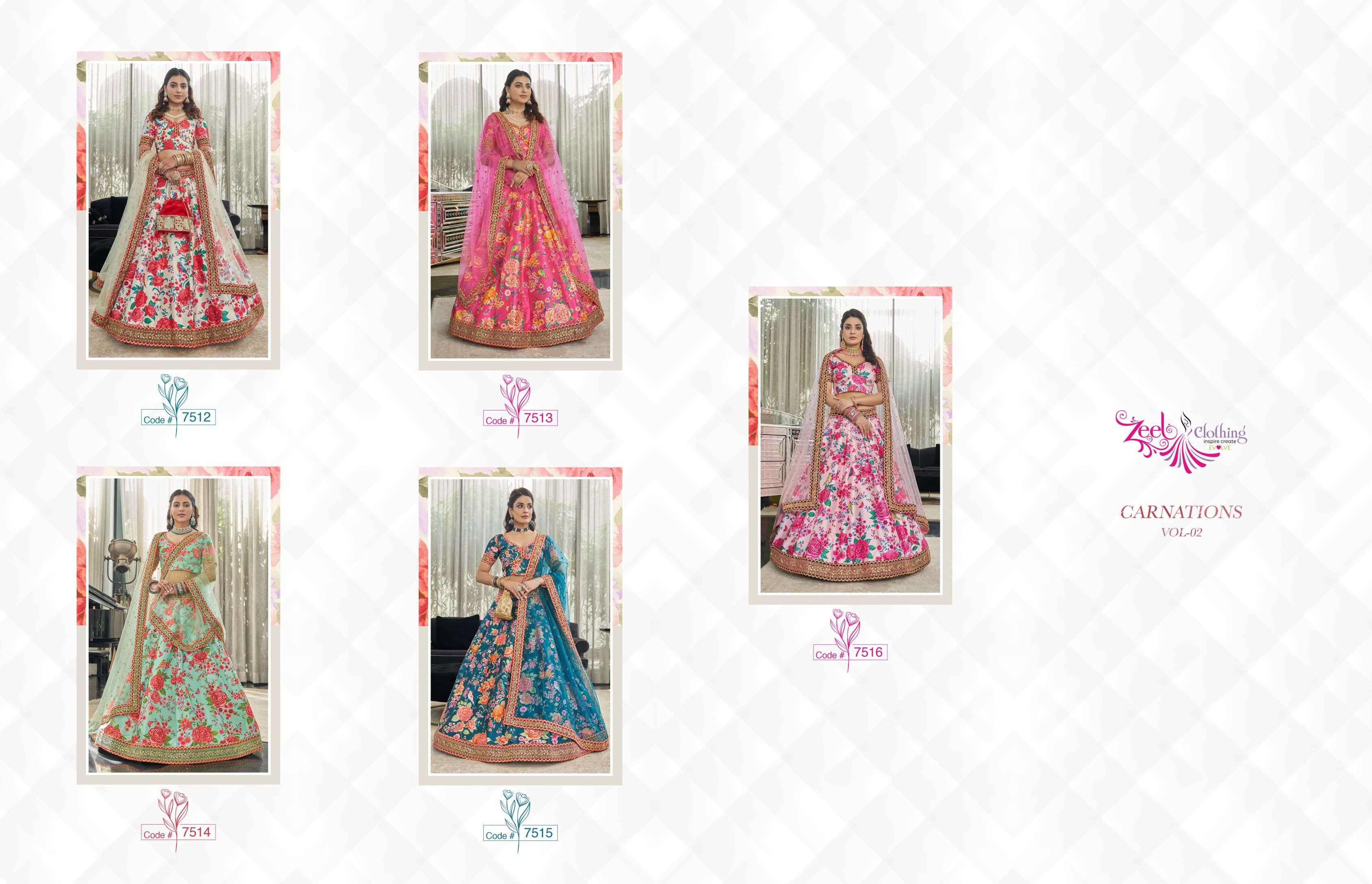 Buy Online CARNATIONS VOL 2 by Zeel Clothing lehenga collection manufacturer Surat 5 Pcs of Full Catalogue at Wholesale Price. Looking for CARNATIONS VOL 2 by Zeel Clothing lehenga collection manufacturer Surat Full Catalouge at Best Price? Buy Now CARNATIONS VOL 2 by Zeel Clothing lehenga collection manufacturer Surat at Wholesale Rate of Rs 14500 with Total 5 Pcs from authroized dealer and supplier of Zeel Clothing Brand. Cost of Each piece is just only Rs 2900 which is very low and affordable price to resale the product in your retail store ,This is Surat based Wholesale Supplier & Dealer of Zeel Clothing Brand. Click on Brand name to Know more about Zeel Clothing Brand's products.Call or Whatsapp on 9898838984 for booking or enquiry