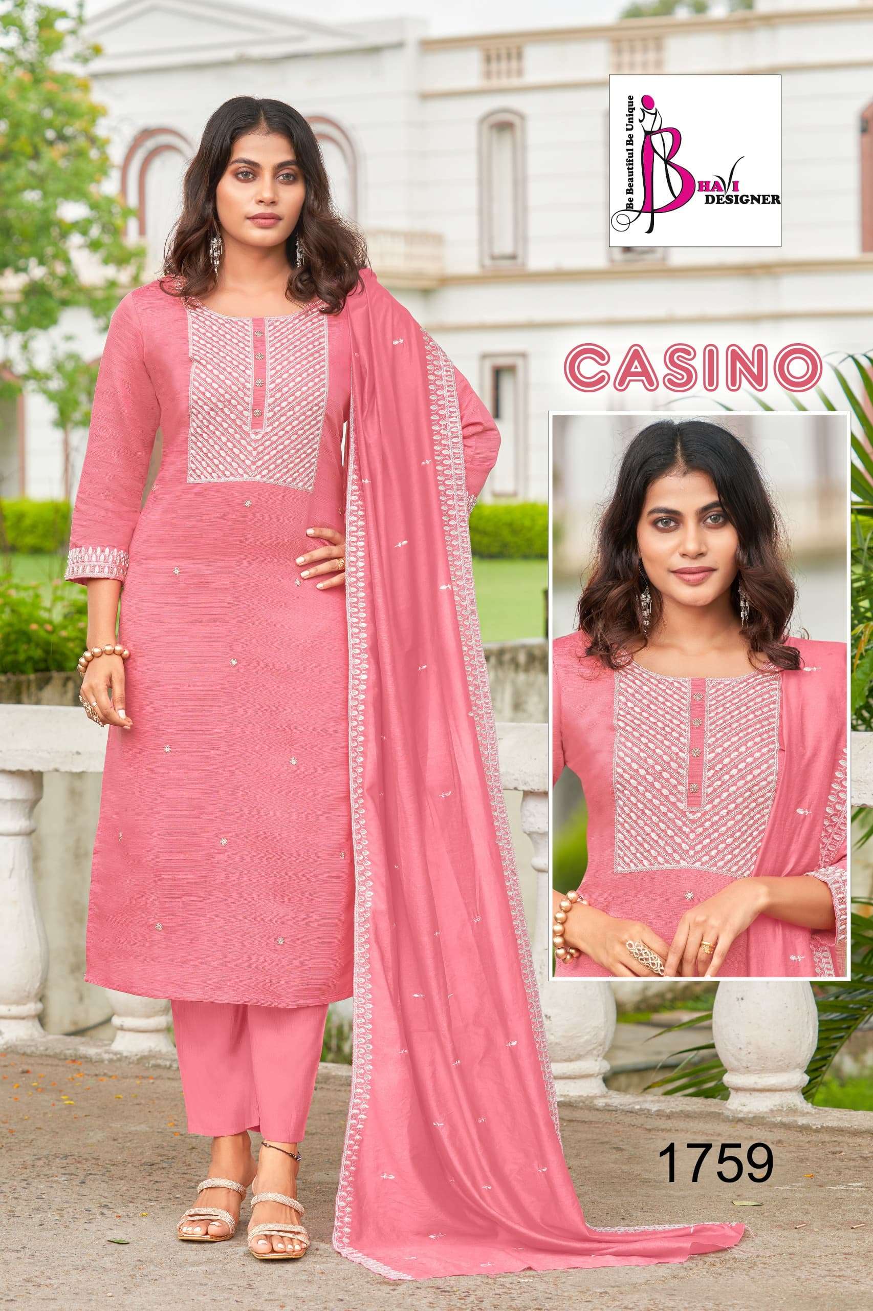 Buy Online CASINO BY BHAVI DESIGNER FORMAL KURTI BOTTOM DUPATTA COLLECTION 4 Pcs of Full Catalogue at Wholesale Price. Looking for CASINO BY BHAVI DESIGNER FORMAL KURTI BOTTOM DUPATTA COLLECTION Full Catalouge at Best Price? Buy Now CASINO BY BHAVI DESIGNER FORMAL KURTI BOTTOM DUPATTA COLLECTION at Wholesale Rate of Rs 5800 with Total 4 Pcs from authroized dealer and supplier of BRAND'S Brand. Cost of Each piece is just only Rs 1450 which is very low and affordable price to resale the product in your retail store ,This is Surat based Wholesale Supplier & Dealer of BRAND'S Brand. Click on Brand name to Know more about BRAND'S Brand's products.Call or Whatsapp on 9898838984 for booking or enquiry