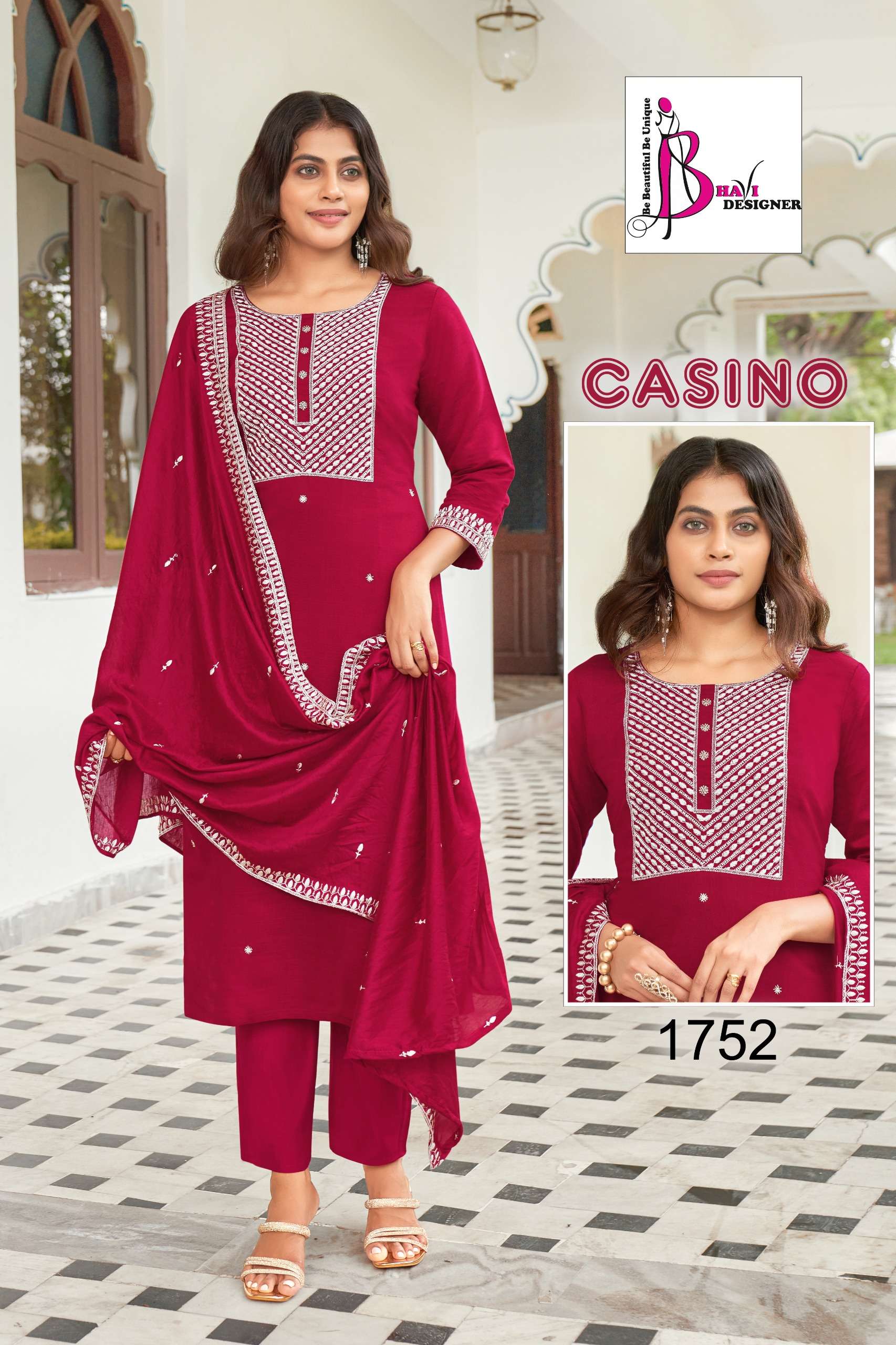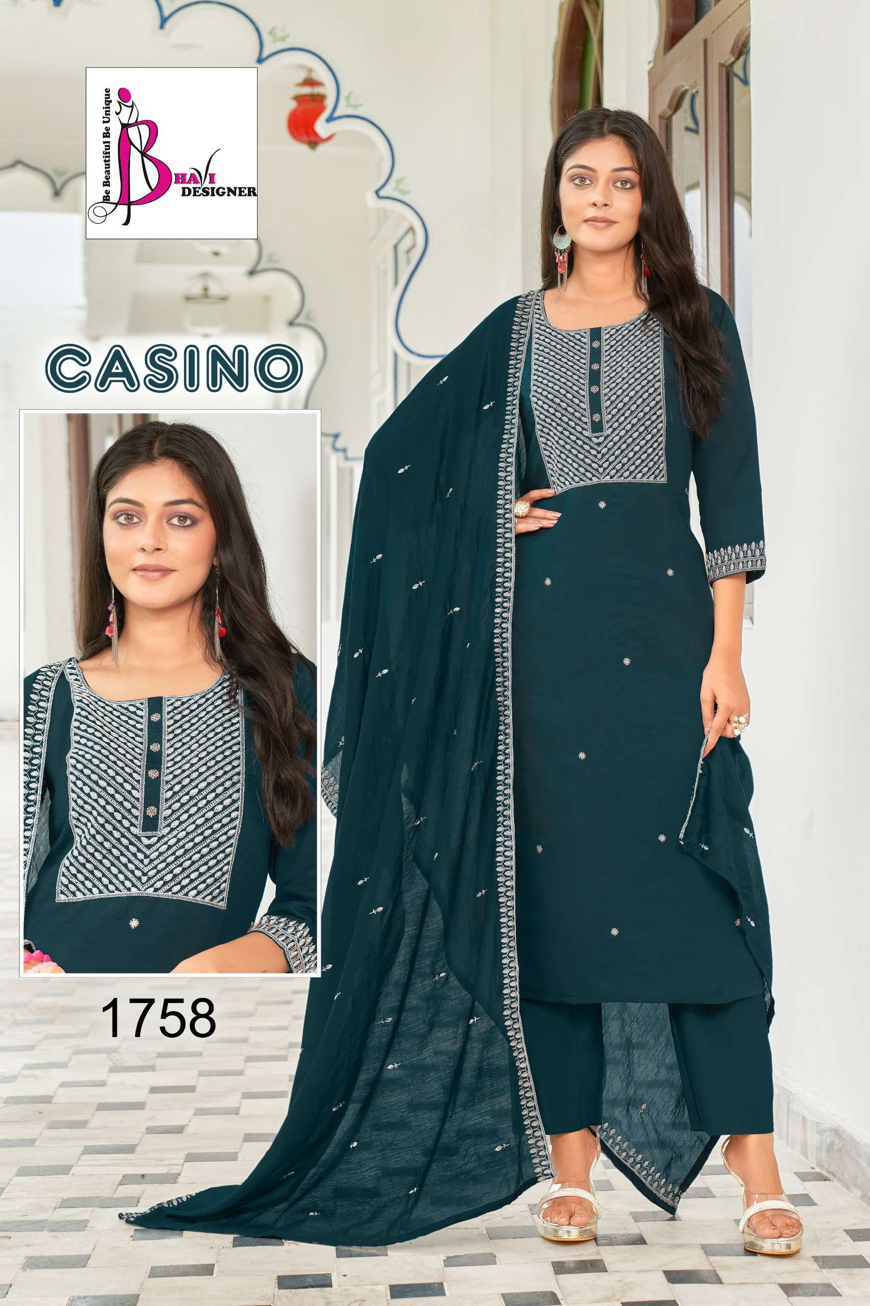 Buy Online CASINO by Bhavi designer suit collection manufacturer surat 4 Pcs of Full Catalogue at Wholesale Price. Looking for CASINO by Bhavi designer suit collection manufacturer surat Full Catalouge at Best Price? Buy Now CASINO by Bhavi designer suit collection manufacturer surat at Wholesale Rate of Rs 5800 with Total 4 Pcs from authroized dealer and supplier of BHAVI DESIGNER Brand. Cost of Each piece is just only Rs 1450 which is very low and affordable price to resale the product in your retail store ,This is Surat based Wholesale Supplier & Dealer of BHAVI DESIGNER Brand. Click on Brand name to Know more about BHAVI DESIGNER Brand's products.Call or Whatsapp on 9898838984 for booking or enquiry