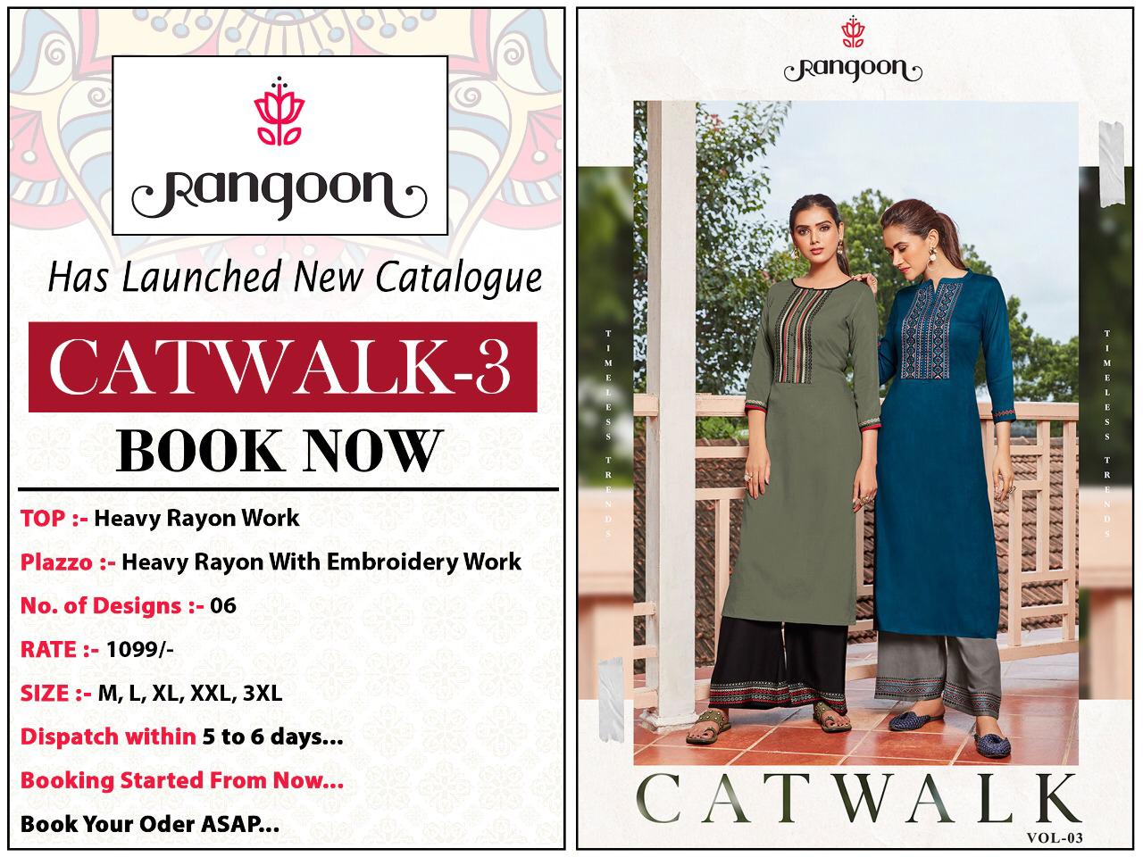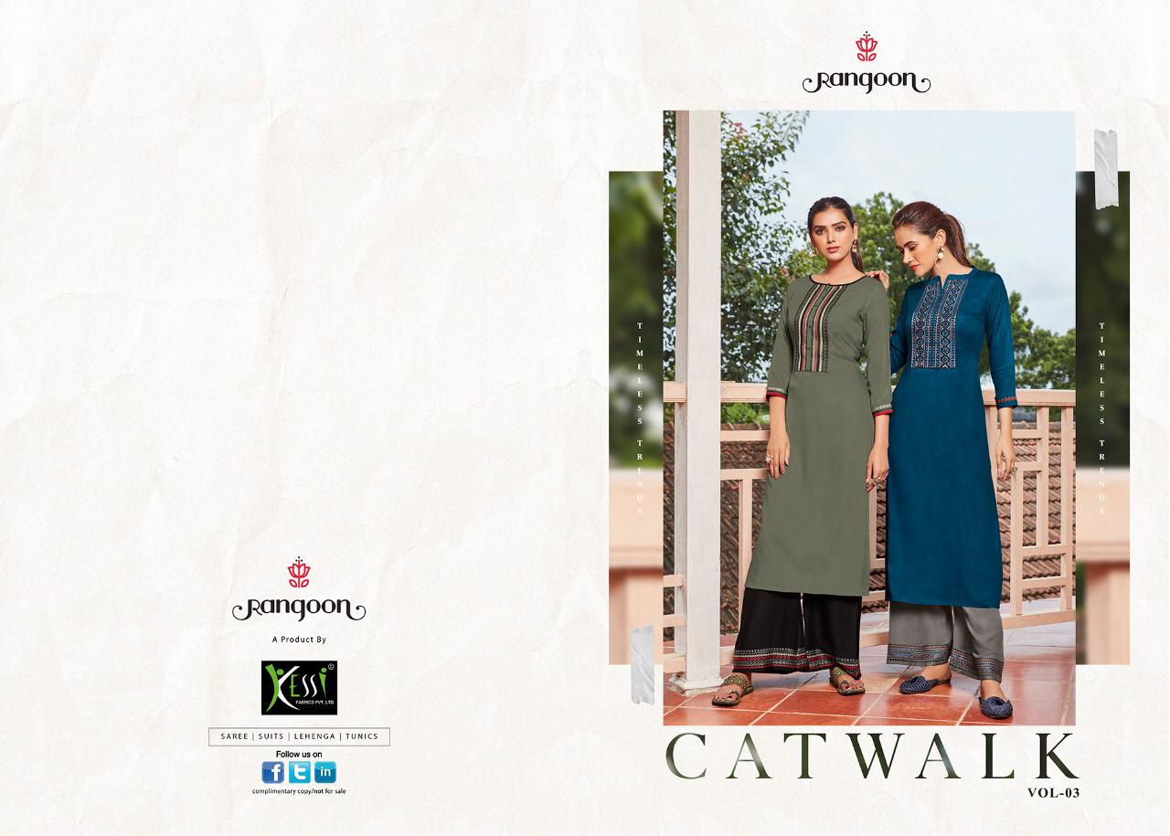 Buy Online Catwalk Vol 3 By Rangoon Kurtis With Bottom Wholesale Supplier And Dealer Surat 6 Pcs of Full Catalogue at Wholesale Price. Looking for Catwalk Vol 3 By Rangoon Kurtis With Bottom Wholesale Supplier And Dealer Surat Full Catalouge at Best Price? Buy Now Catwalk Vol 3 By Rangoon Kurtis With Bottom Wholesale Supplier And Dealer Surat at Wholesale Rate of Rs 3900 with Total 6 Pcs from authroized dealer and supplier of RANGOON Brand. Cost of Each piece is just only Rs 650 which is very low and affordable price to resale the product in your retail store ,This is Surat based Wholesale Supplier & Dealer of RANGOON Brand. Click on Brand name to Know more about RANGOON Brand's products.Call or Whatsapp on 9898838984 for booking or enquiry