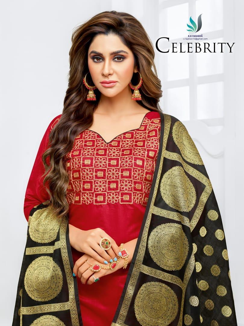 _R R FASHION_ *CELEBRITY* TOP:-MODAL SILK WITH EMBROIDERY BOTTOM :- COTTON DUPATTA :- BANARAS JEQUARD RATE :- 675/- |