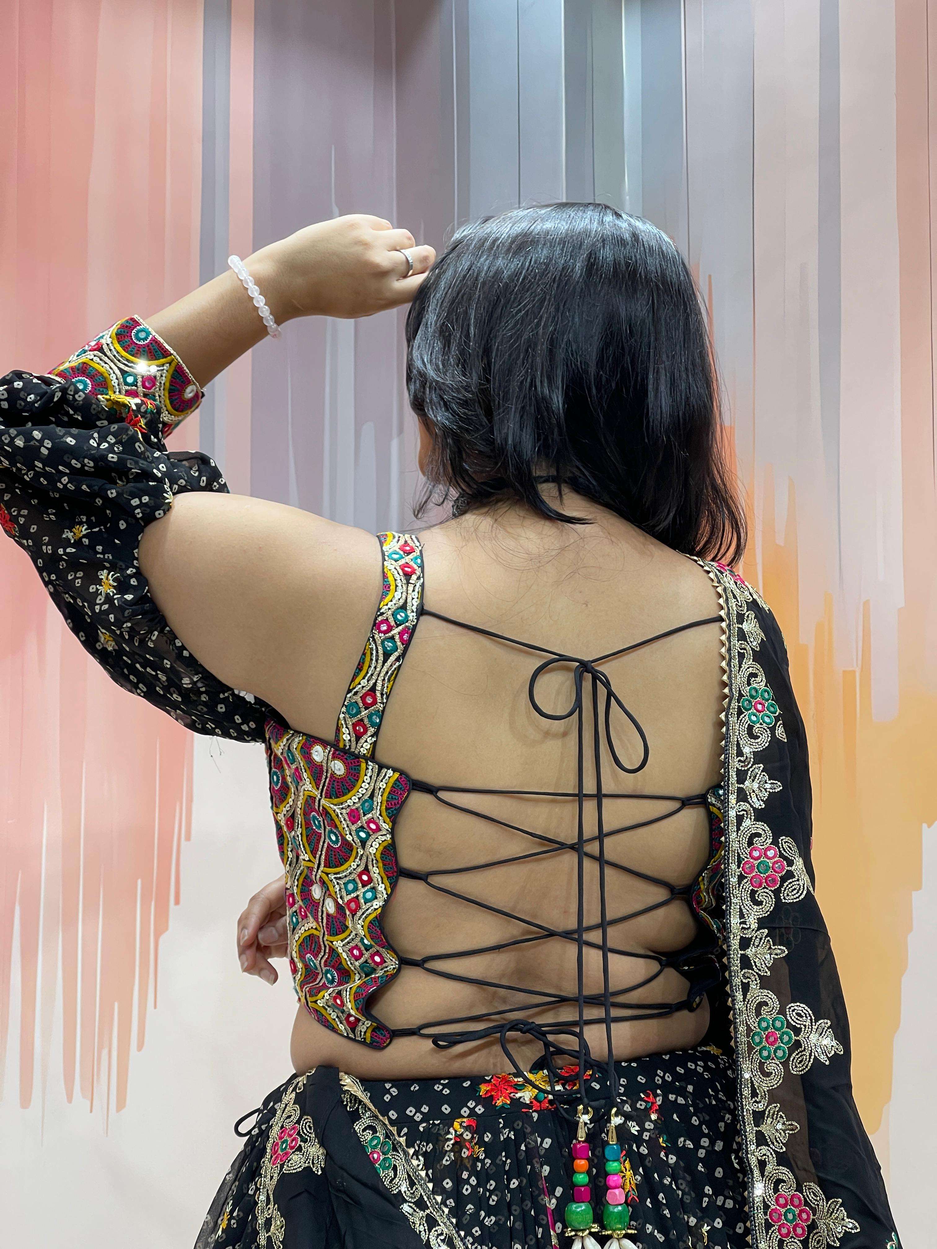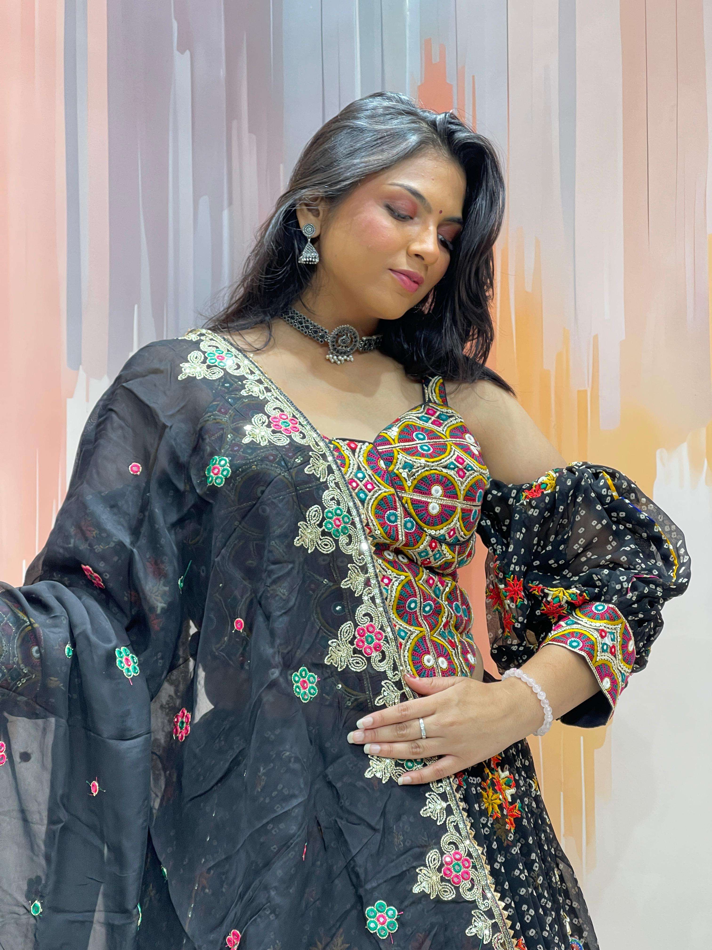 *Vintage Concept Ballon Puff Long sleeve Heavy Designer Celebrity Collection Georgette Gamthi kutch work Full ghera approx 8-9 Mtrs Rajwadi fusion style Chaniya Choli*