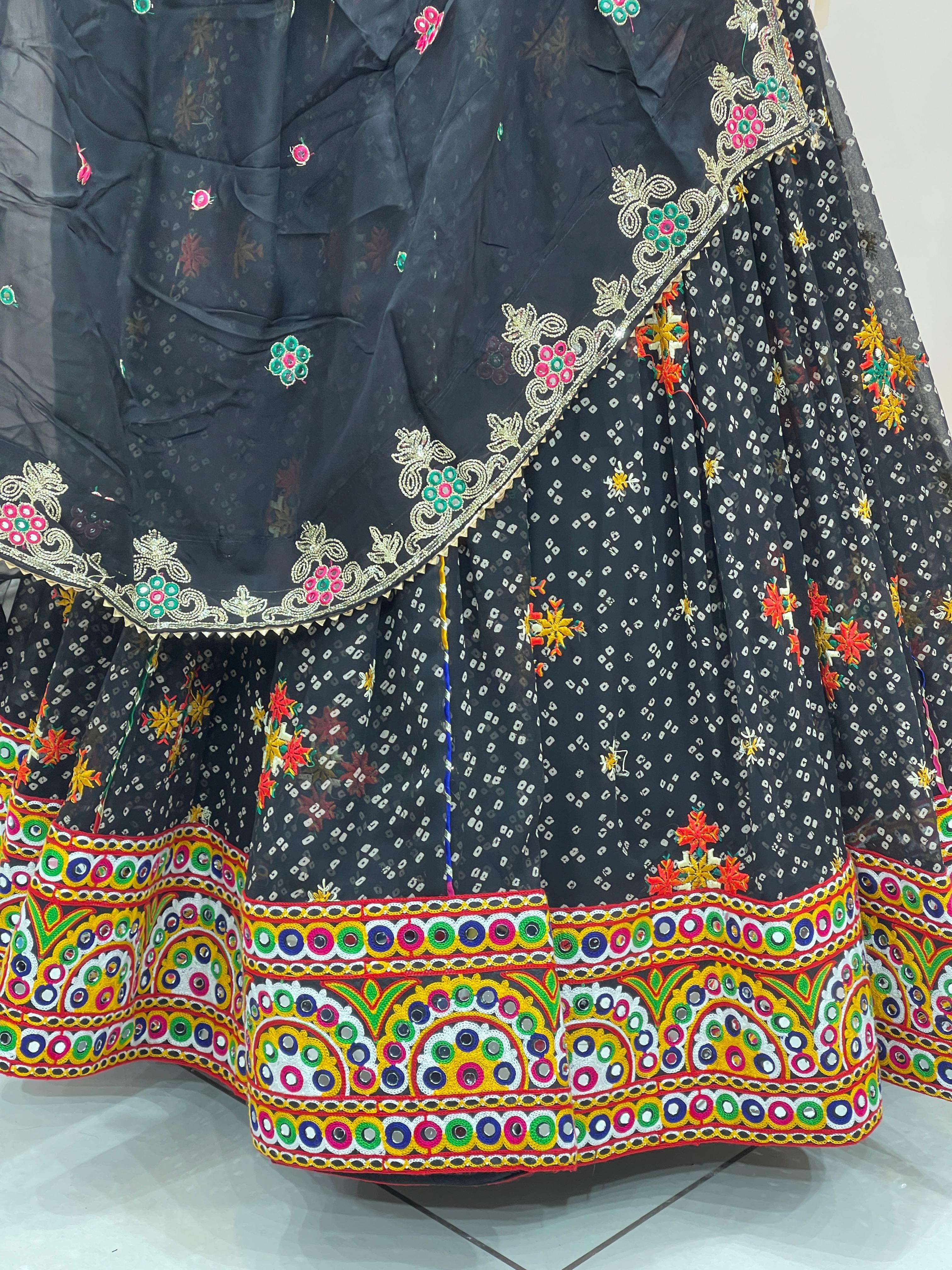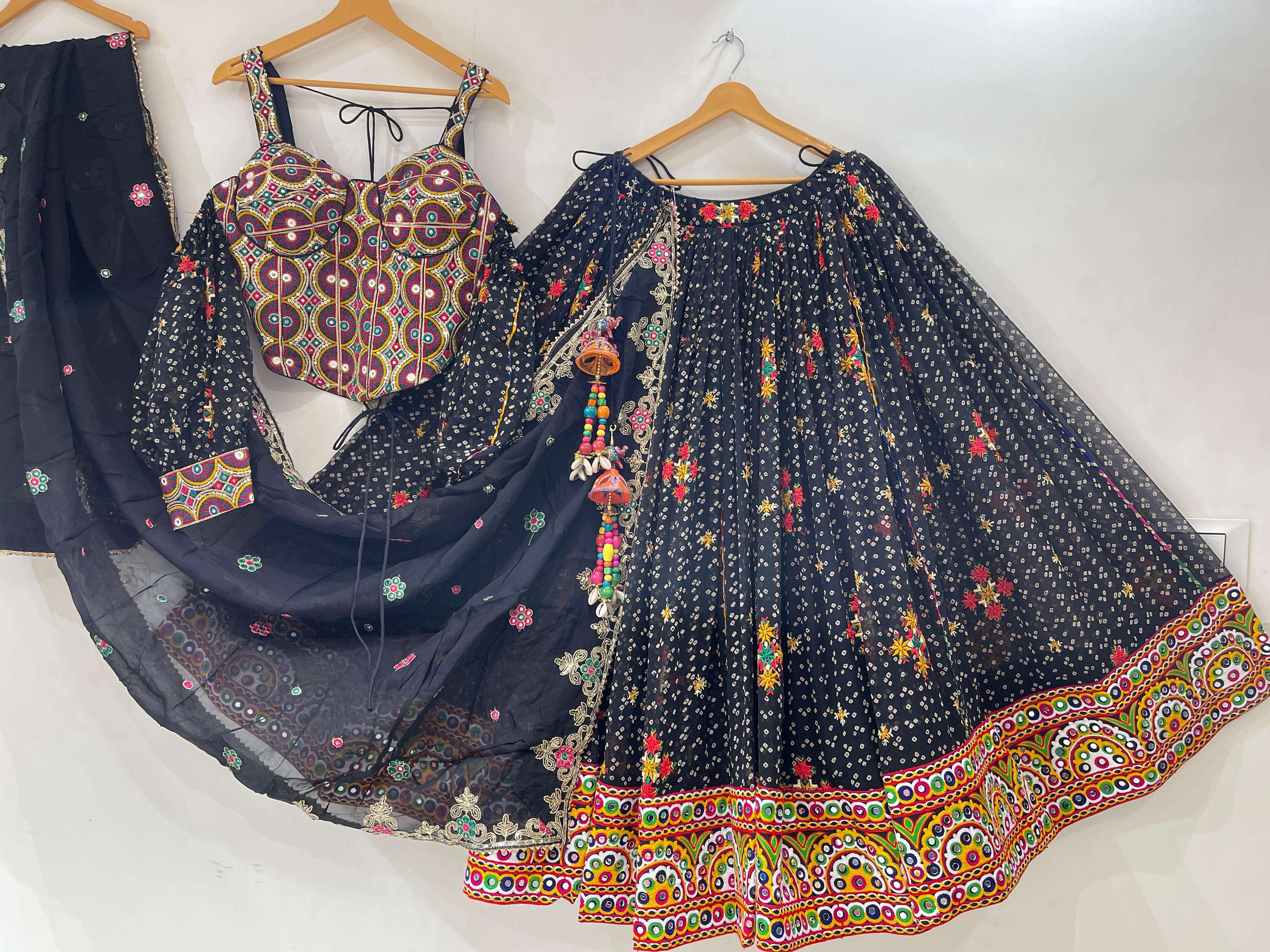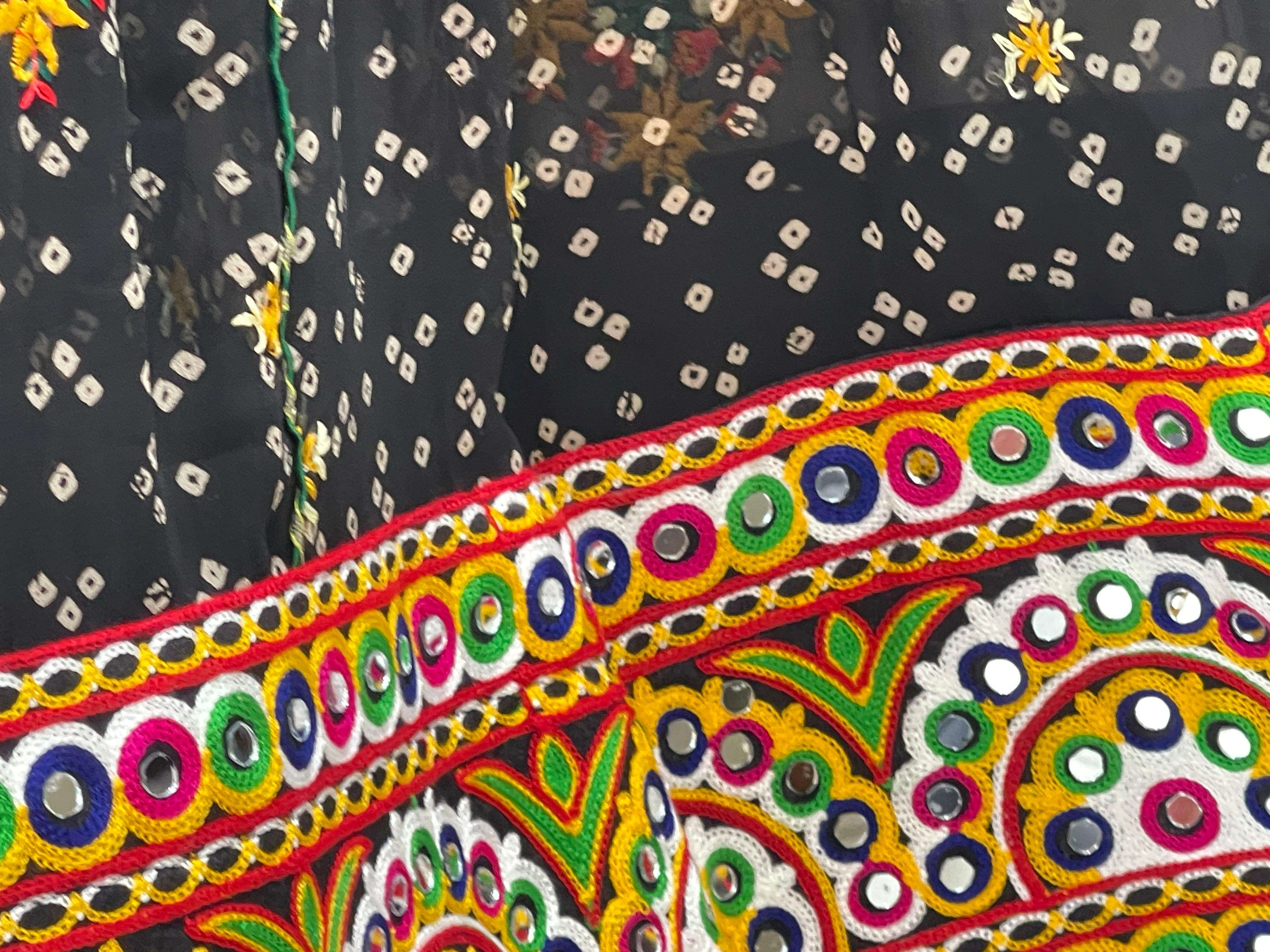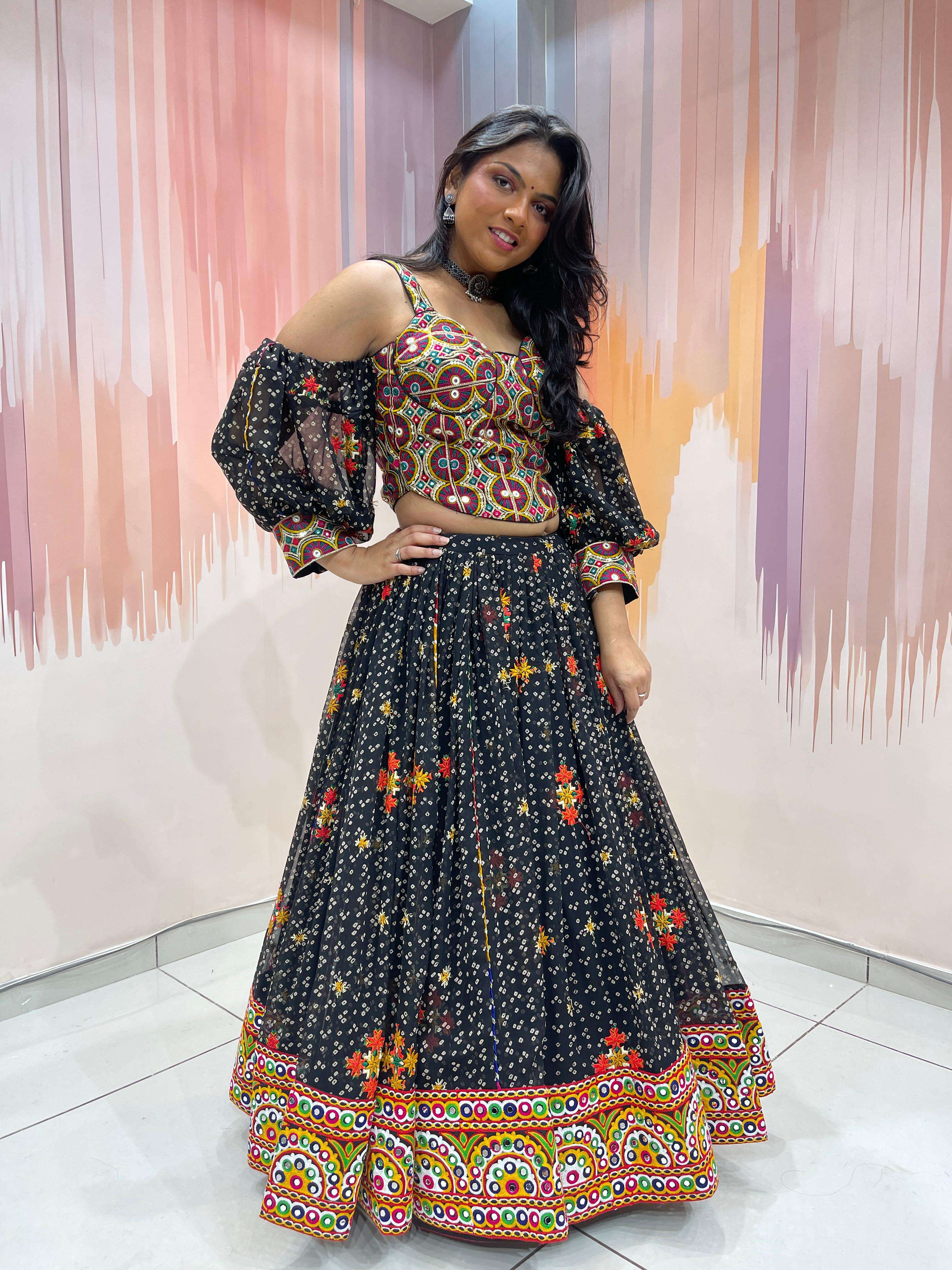 *Skirt/bottom*: *Soft Chiffon Small floral mix & match dotted Printed Colour full 8-9 mtrs flair with heavy kutchi mirror work borders gives perfect look to lehenga* *Length 40/41”* *Upto 42-44” waist*
