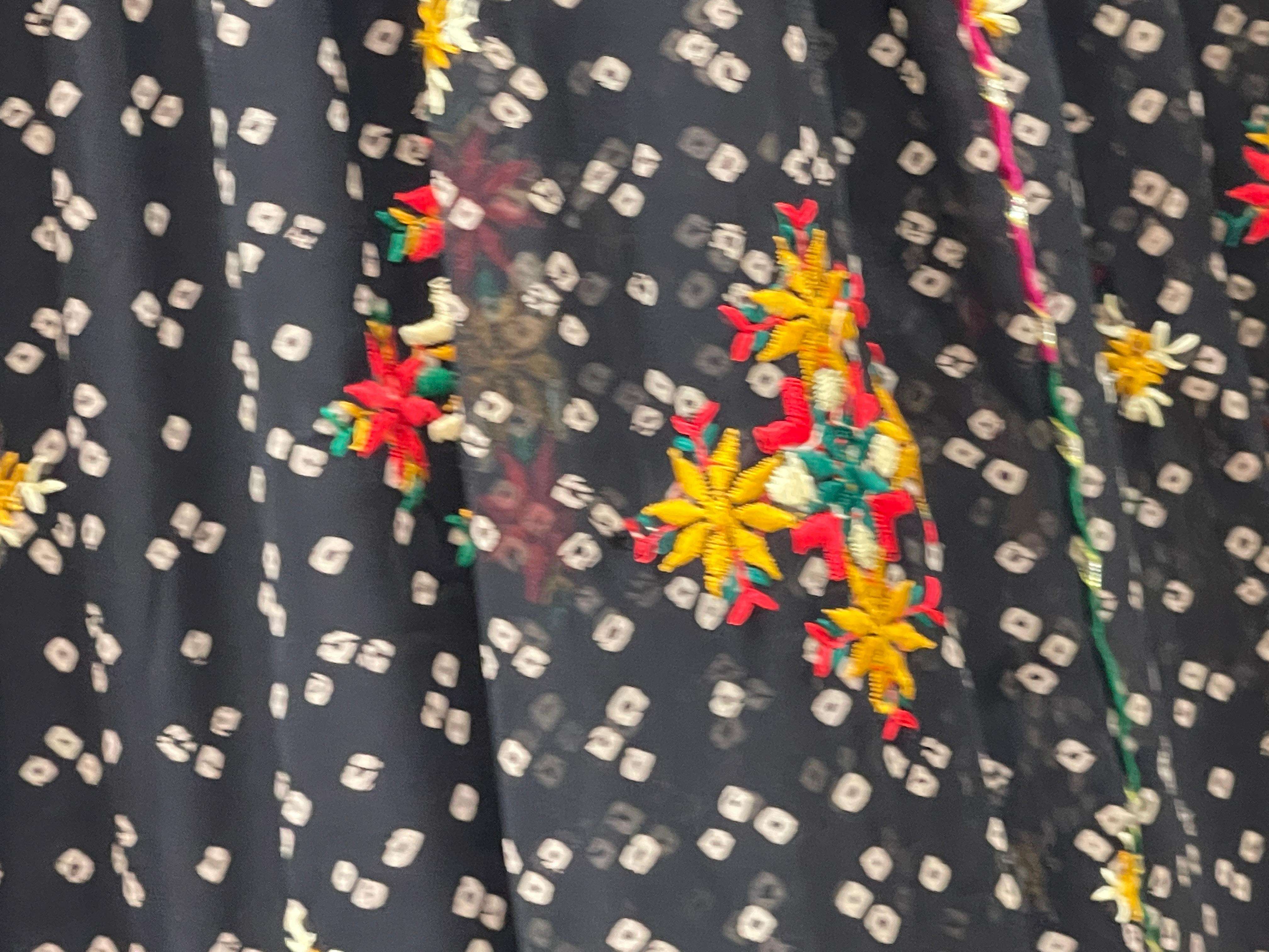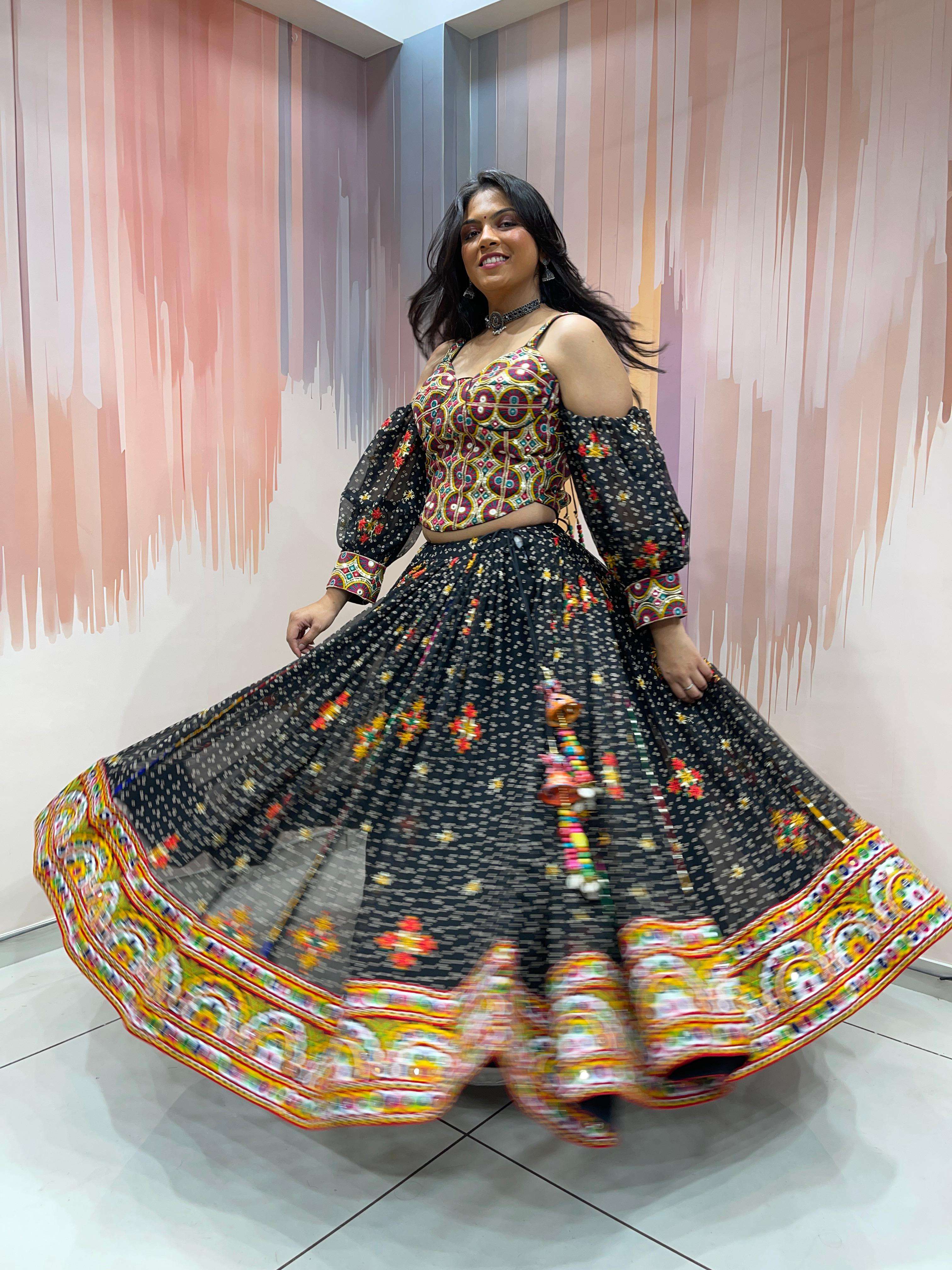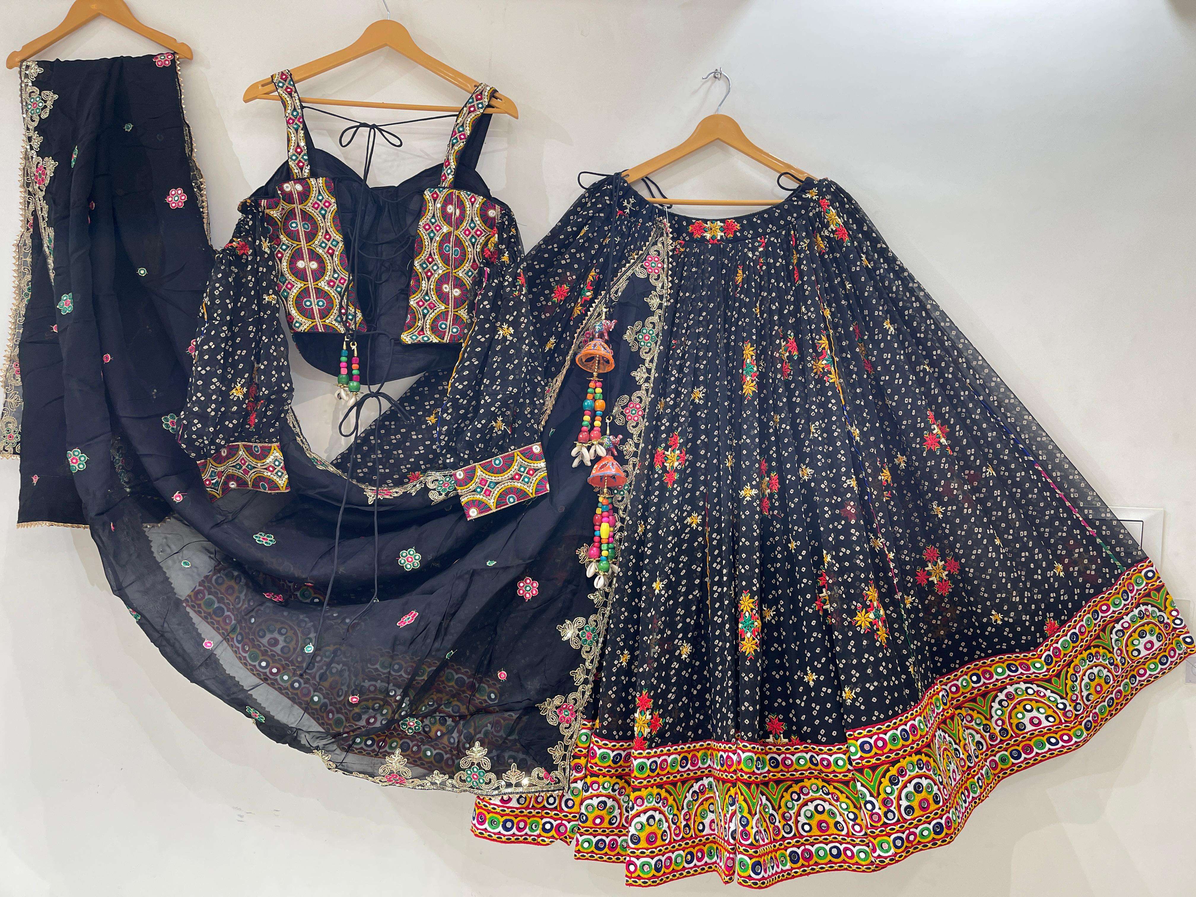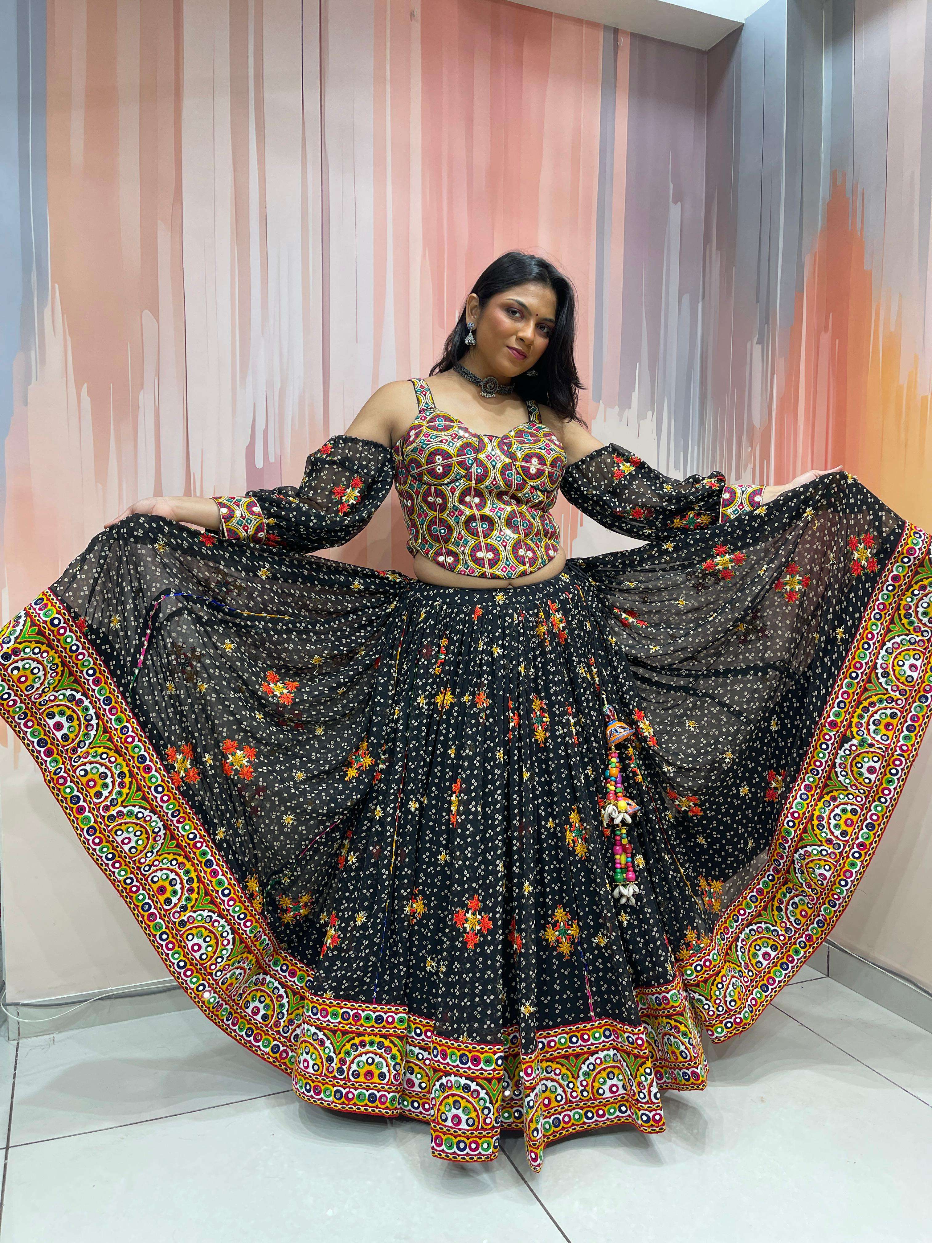 *Skirt/bottom*: *Soft Chiffon Small floral mix & match dotted Printed Colour full 8-9 mtrs flair with heavy kutchi mirror work borders gives perfect look to lehenga* *Length 40/41”* *Upto 42-44” waist*