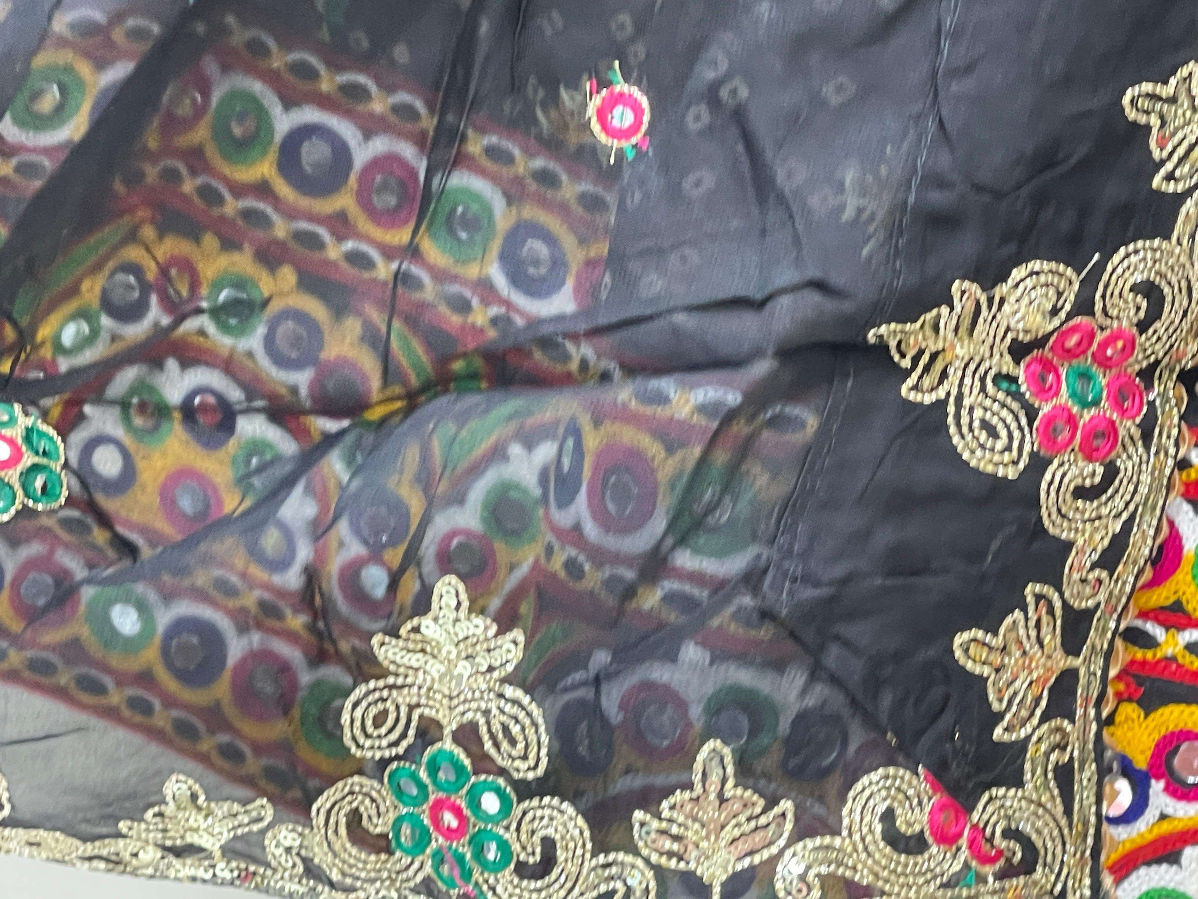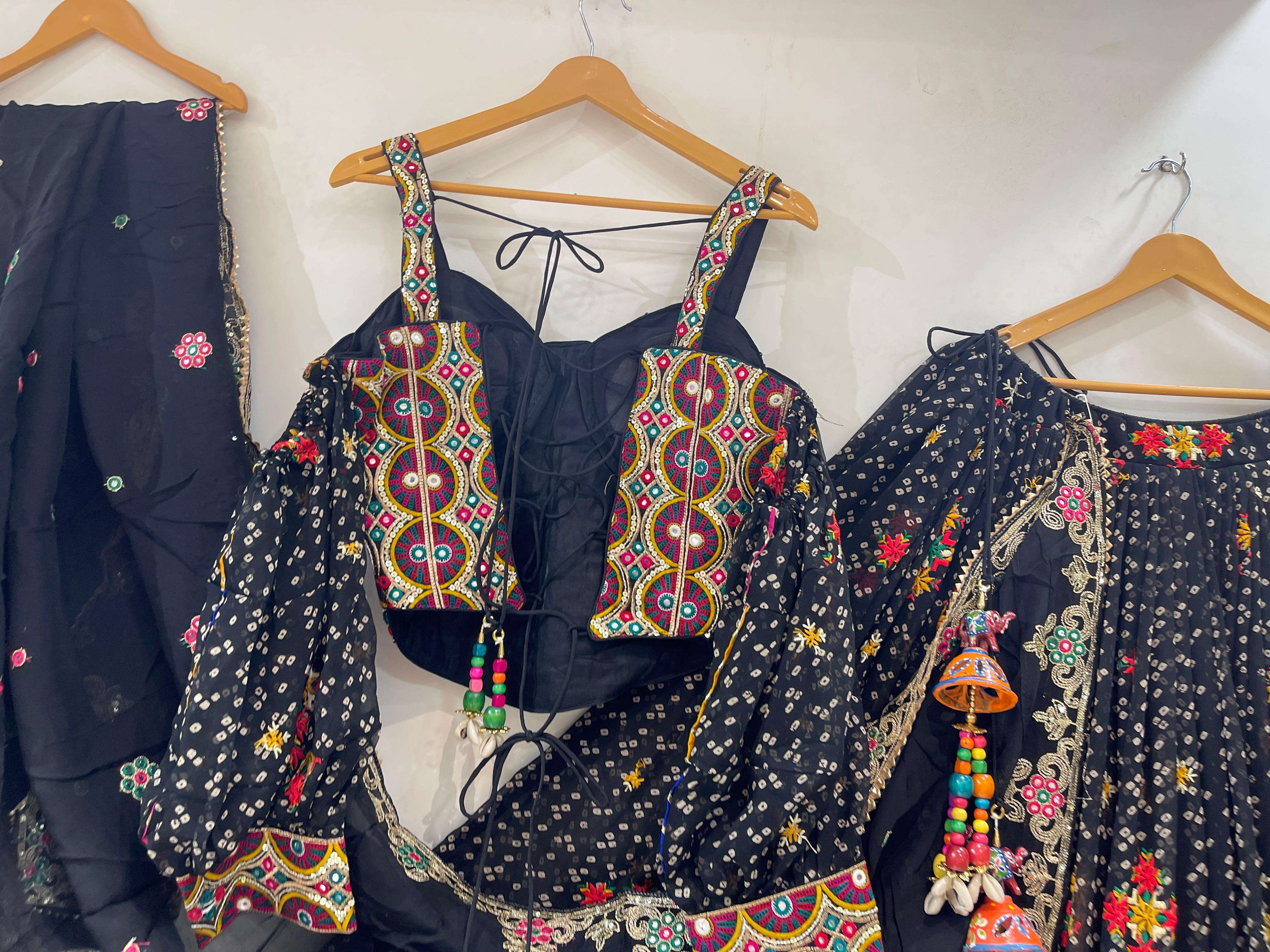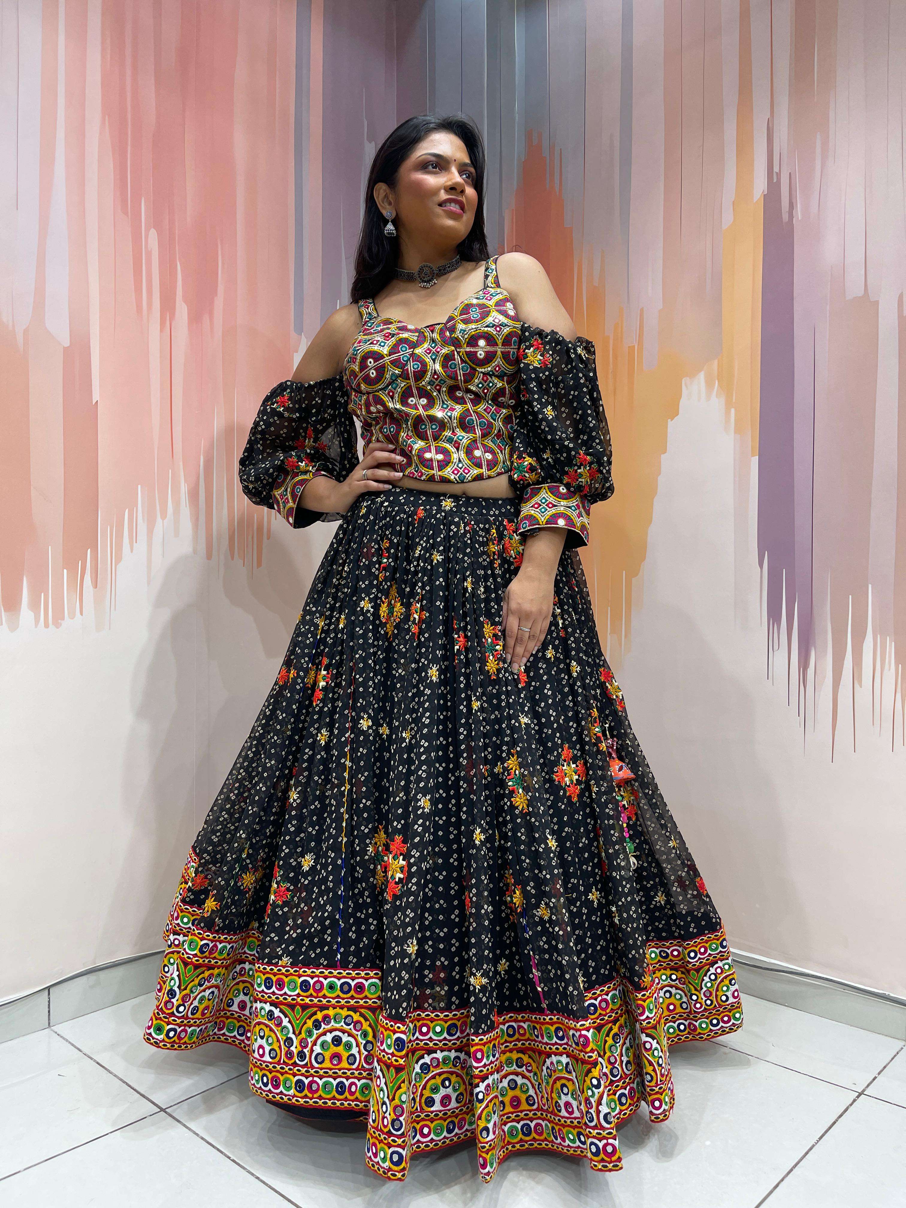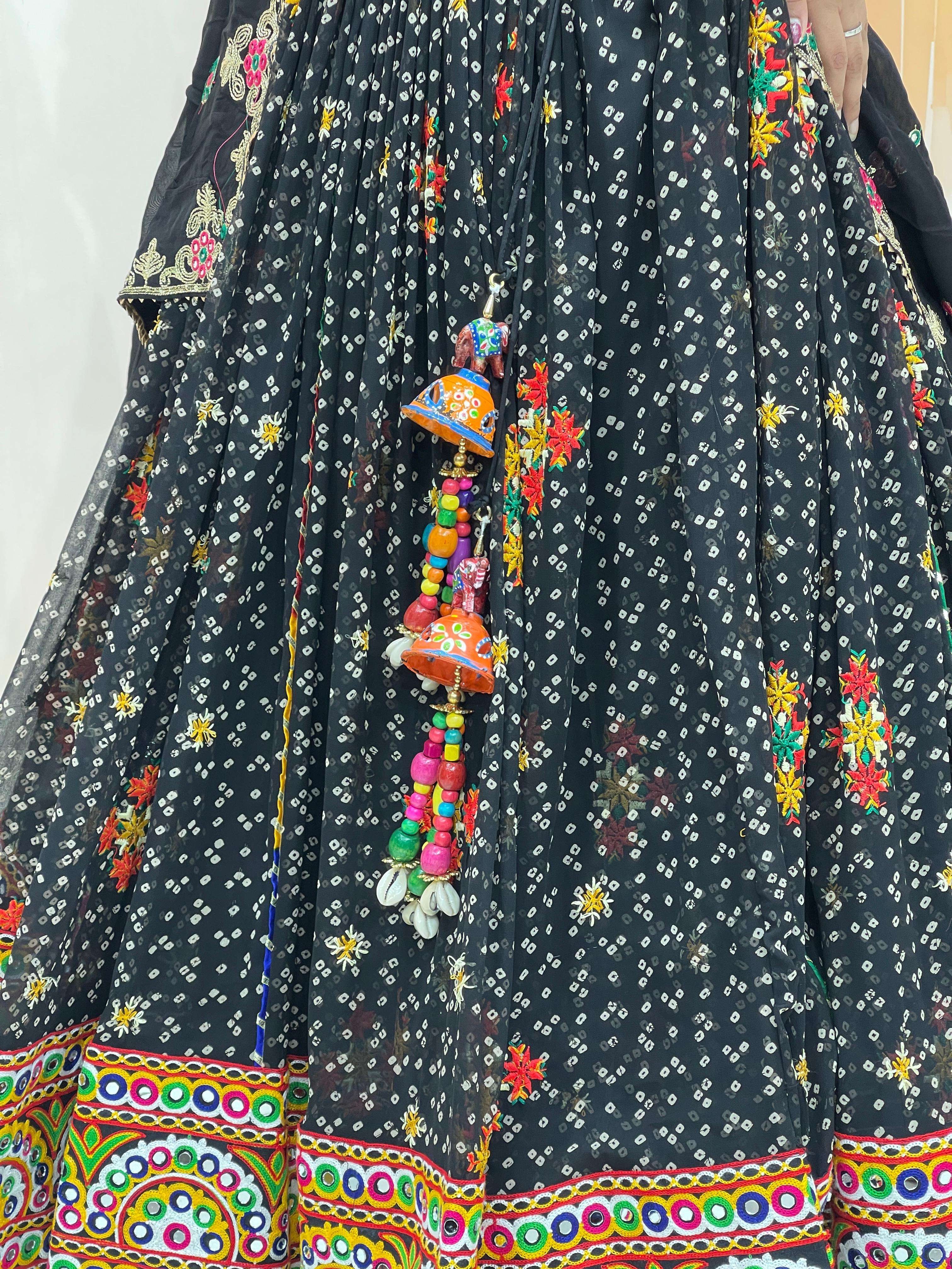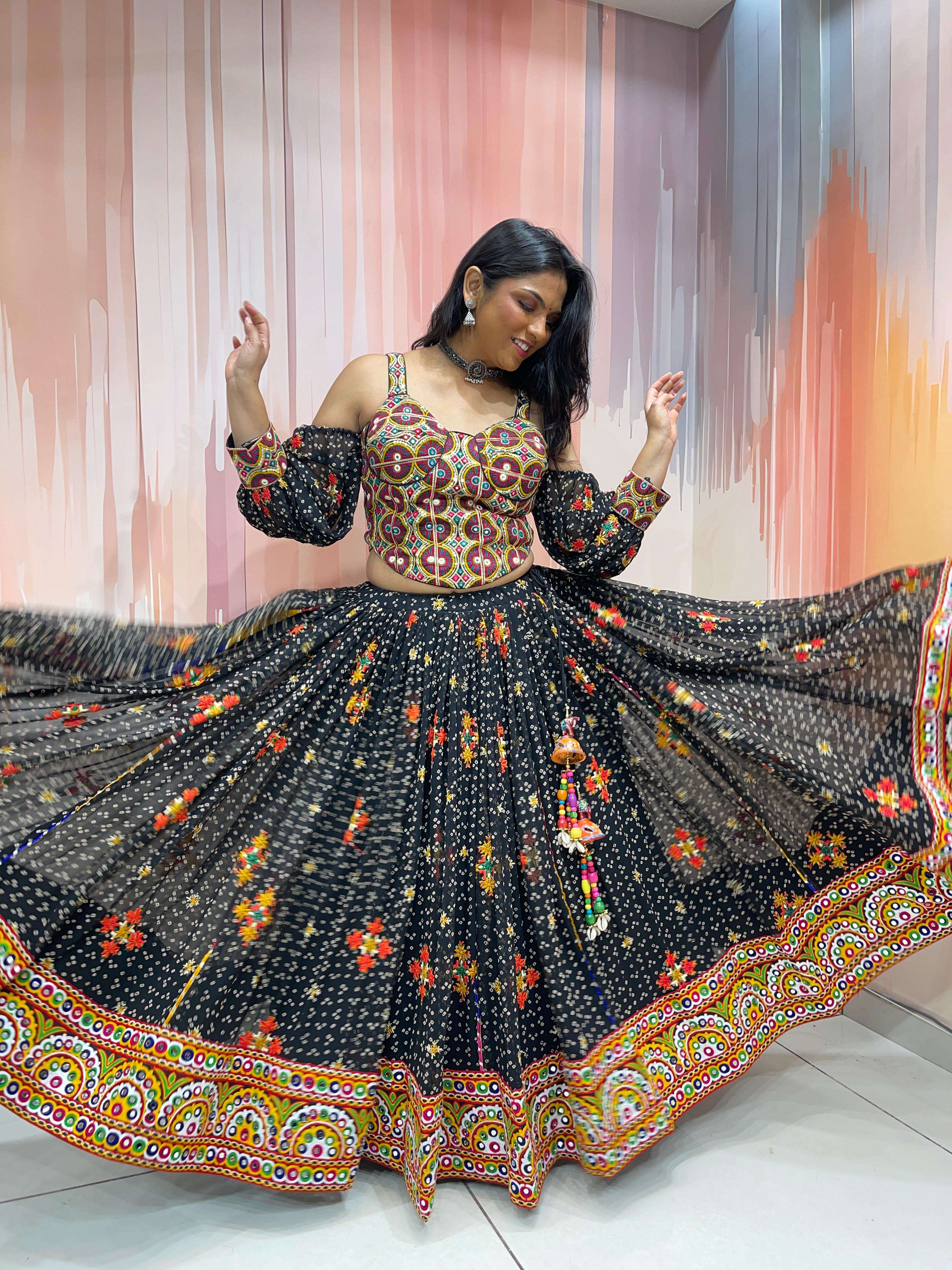 *Skirt/bottom*: *Soft Chiffon Small floral mix & match dotted Printed Colour full 8-9 mtrs flair with heavy kutchi mirror work borders gives perfect look to lehenga* *Length 40/41”* *Upto 42-44” waist*