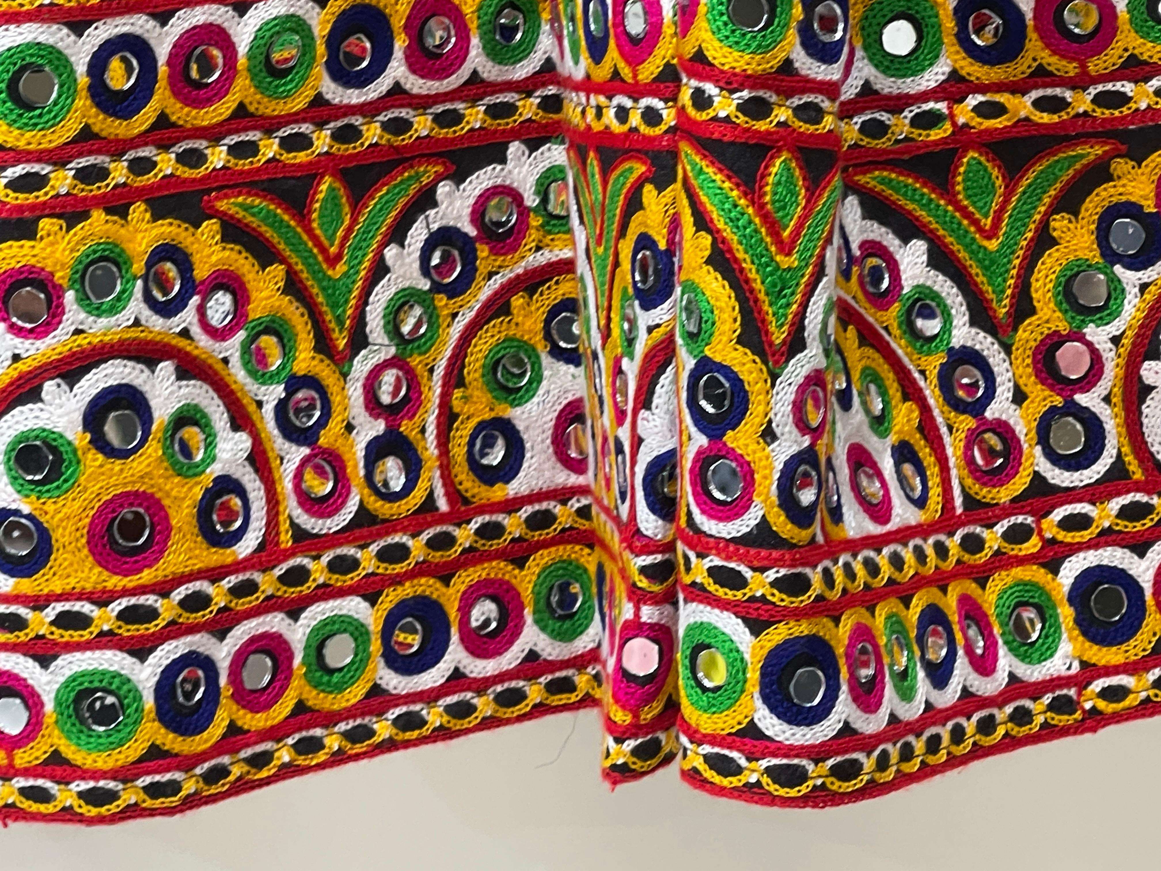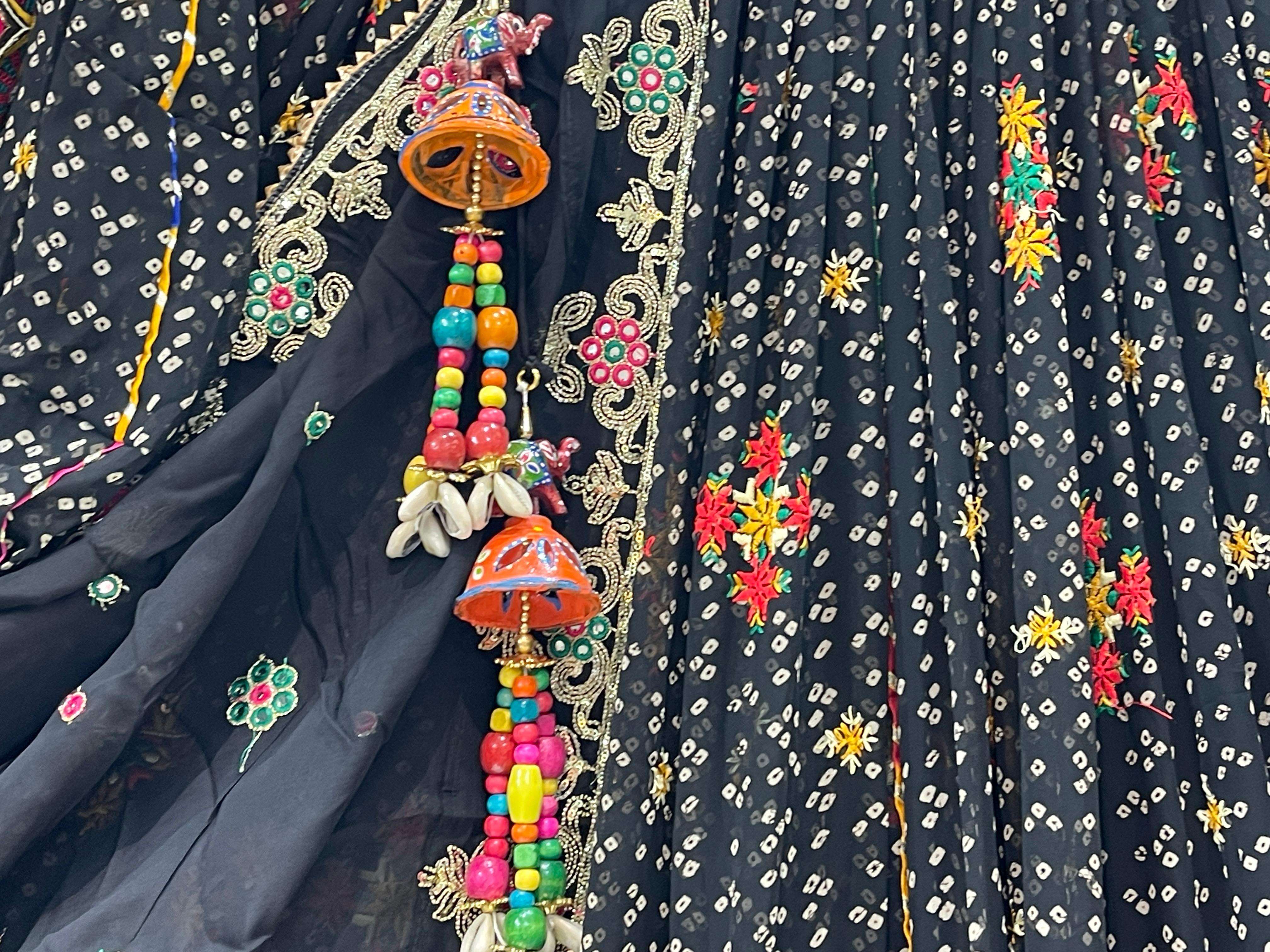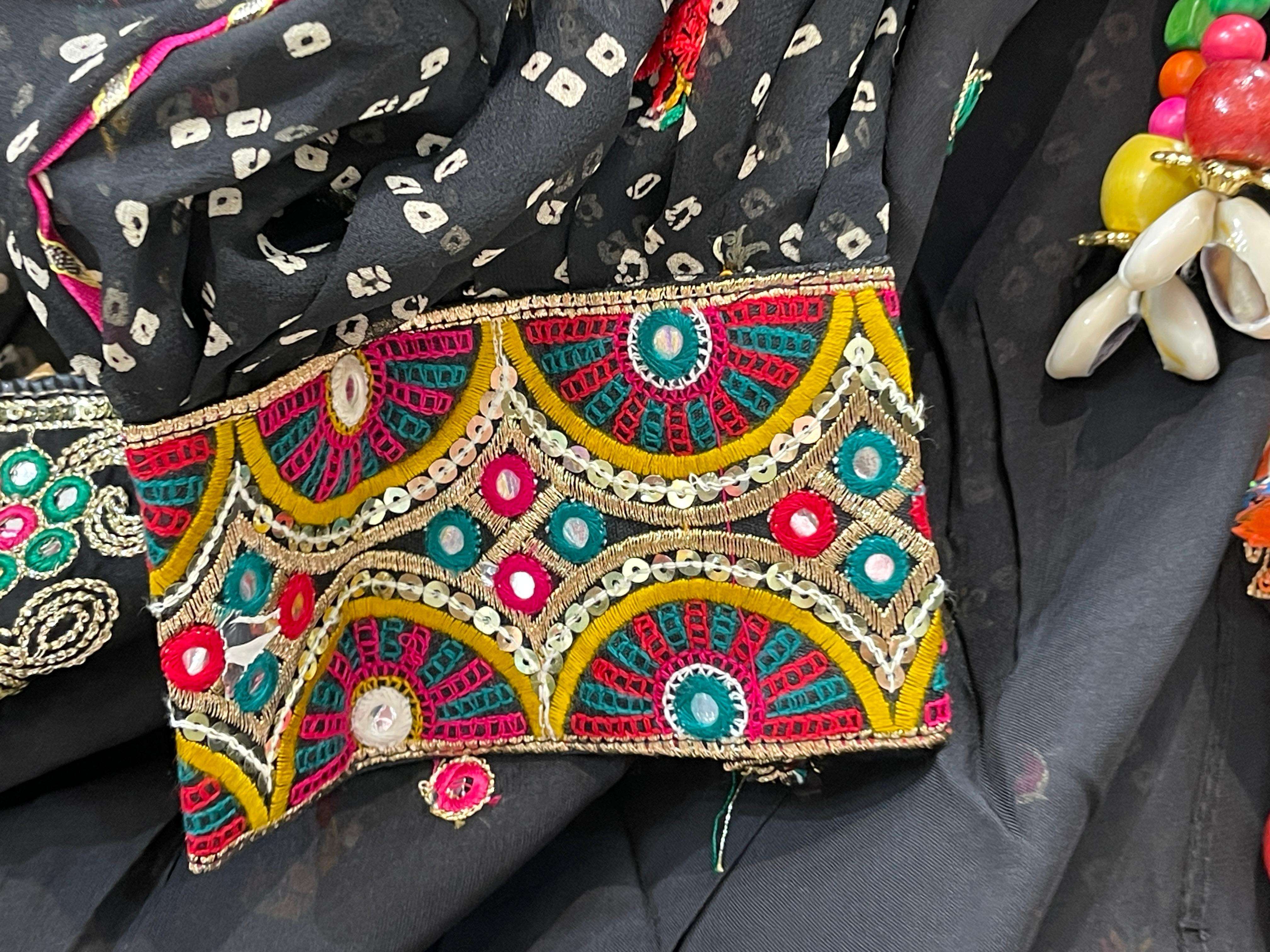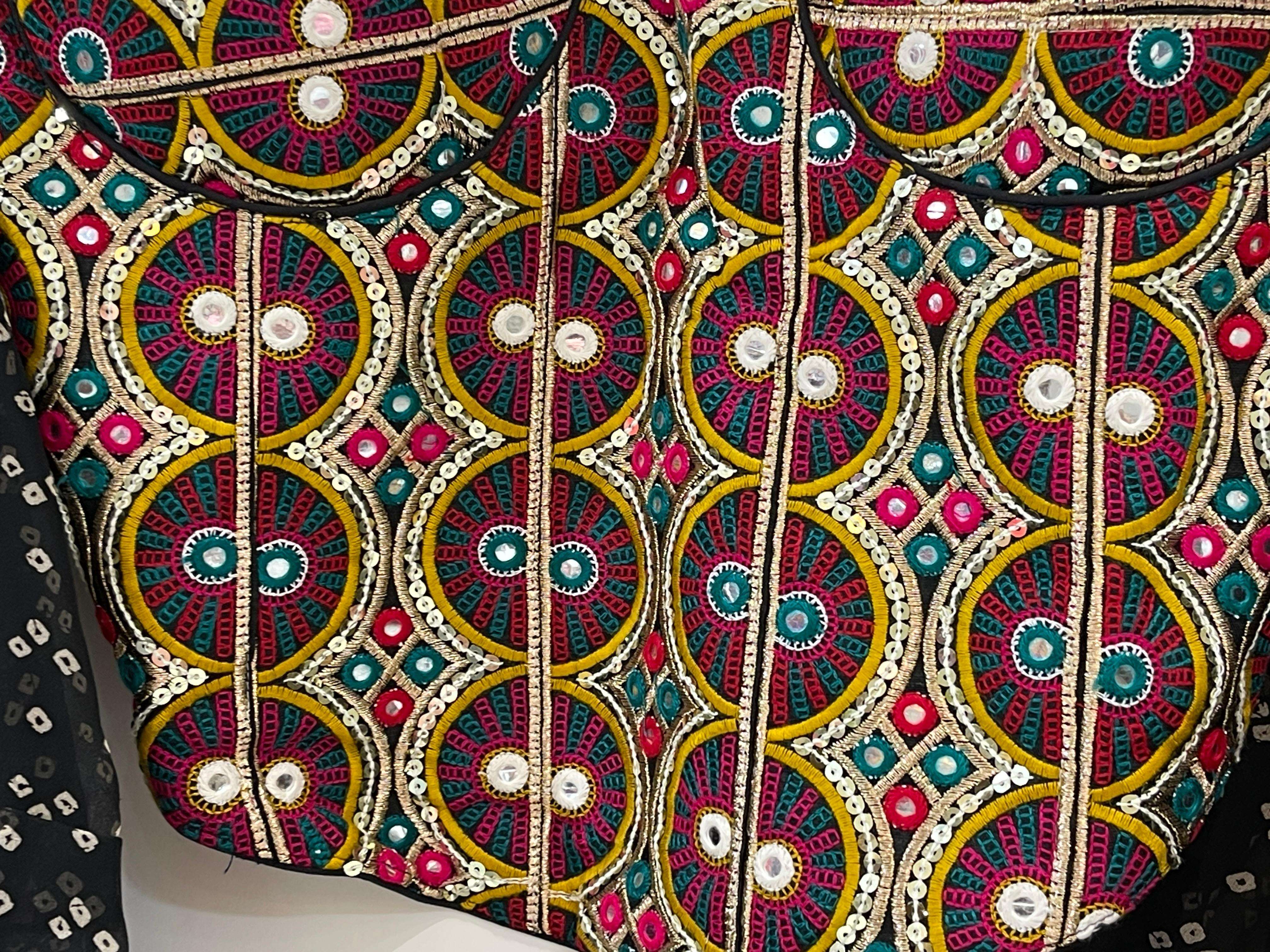 *Skirt/bottom*: *Soft Chiffon Small floral mix & match dotted Printed Colour full 8-9 mtrs flair with heavy kutchi mirror work borders gives perfect look to lehenga* *Length 40/41”* *Upto 42-44” waist*