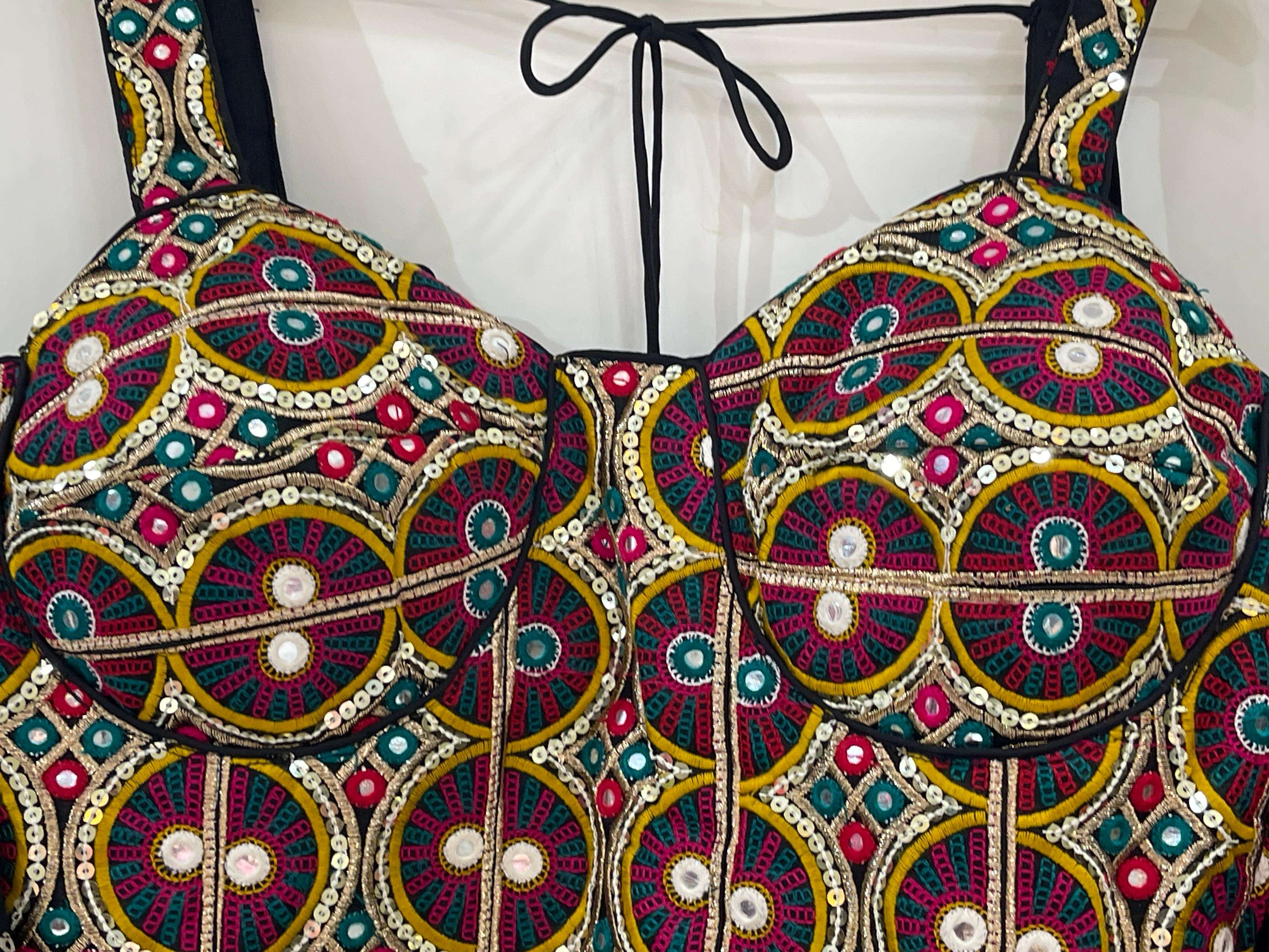 *Blouse*: *Designer Croset embroidered Work Off shoulder Ballon Puff sleeves mirror work heavy thread embroidery designer 🪡 work blouse 40” plus margin 4” for Size (margin up to 44”)*