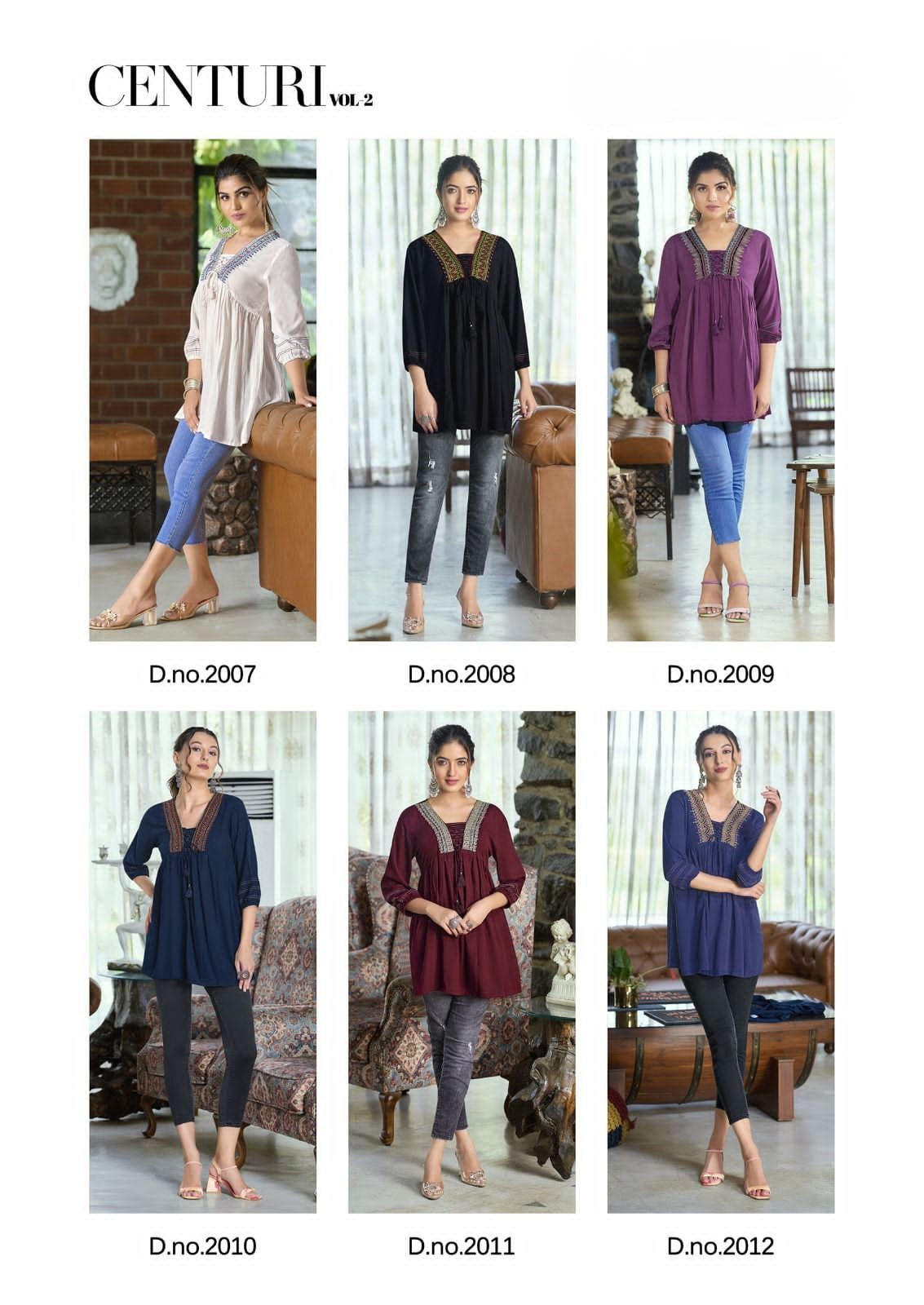 Buy Online Centuri Vol 2 Rayon Fancy Work Short Kurti 6 Pcs of Full Catalogue at Wholesale Price. Looking for Centuri Vol 2 Rayon Fancy Work Short Kurti Full Catalouge at Best Price? Buy Now Centuri Vol 2 Rayon Fancy Work Short Kurti at Wholesale Rate of Rs 0 with Total 6 Pcs from authroized dealer and supplier of Brand. Cost of Each piece is just only Rs 0 which is very low and affordable price to resale the product in your retail store ,This is Surat based Wholesale Supplier & Dealer of Brand. Click on Brand name to Know more about Brand's products.Call or Whatsapp on 9898838984 for booking or enquiry