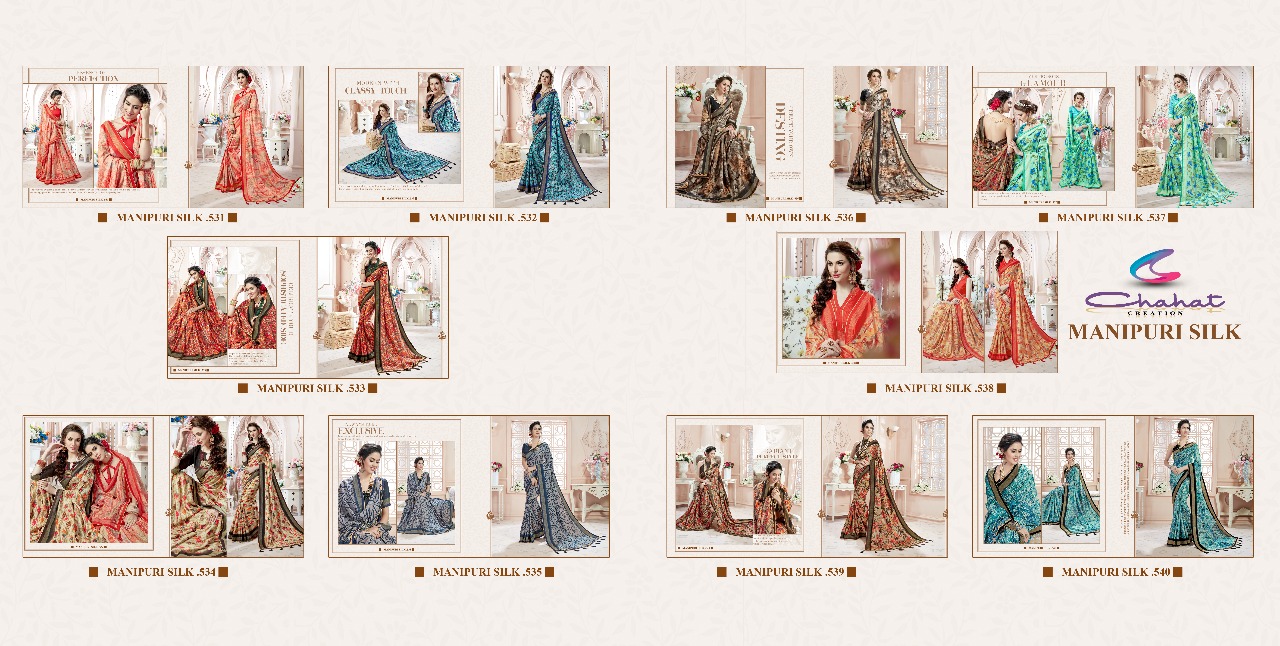 Buy Online Chahet Manipuri Silk 531 Series Silk Printed Saree Catlog Wholesale Dealer Surat 10 Pcs of Full Catalogue at Wholesale Price. Looking for Chahet Manipuri Silk 531 Series Silk Printed Saree Catlog Wholesale Dealer Surat Full Catalouge at Best Price? Buy Now Chahet Manipuri Silk 531 Series Silk Printed Saree Catlog Wholesale Dealer Surat at Wholesale Rate of Rs 6850 with Total 10 Pcs from authroized dealer and supplier of CHAHAT CREATION Brand. Cost of Each piece is just only Rs 685 which is very low and affordable price to resale the product in your retail store ,This is Surat based Wholesale Supplier & Dealer of CHAHAT CREATION Brand. Click on Brand name to Know more about CHAHAT CREATION Brand's products.Call or Whatsapp on 9898838984 for booking or enquiry
