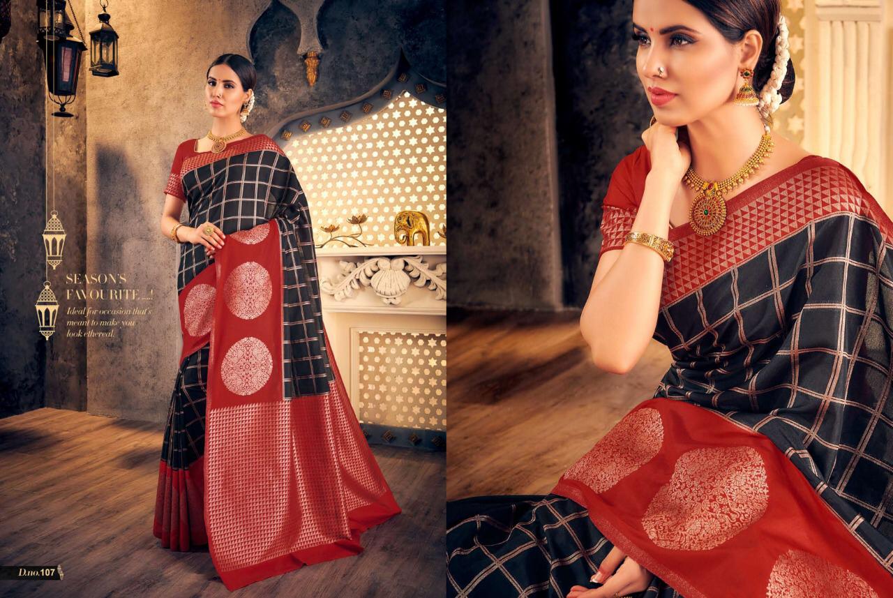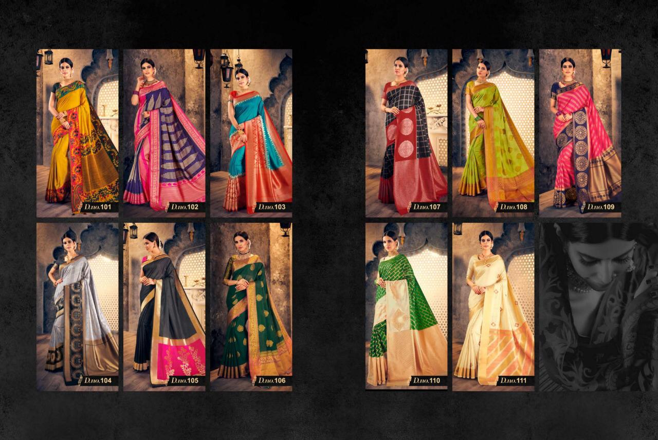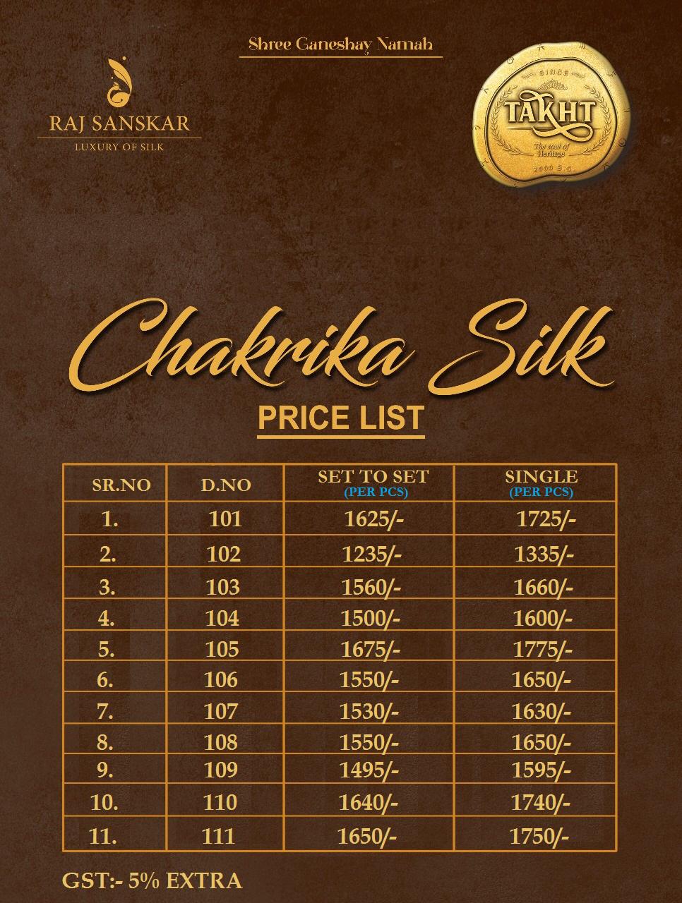 Brand - Raj Sanskar . Catlog name - CHAKRIKA SILK 101 to 111 series GST 5 Percent Extra. Delivery 3-4 days Rate list atteched in pics Set and loose available |