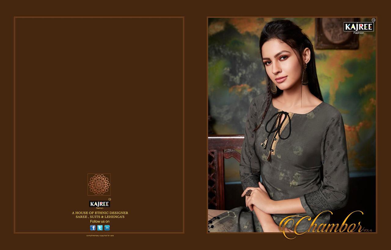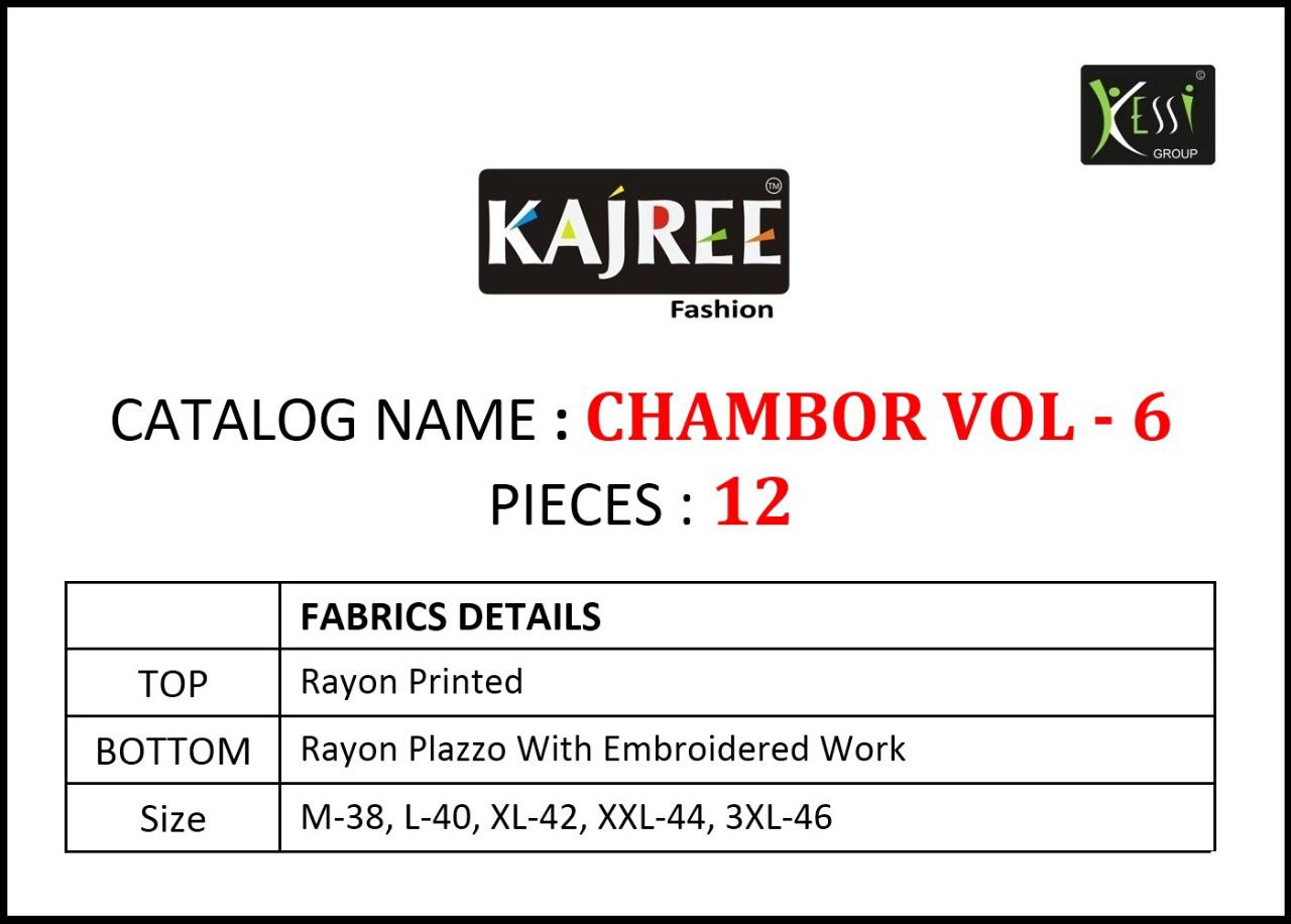 Buy Online Chambor Vol 6 By Kajree Reyon Printed Kurtis With Plazzo Wholesale Supplier Surat 12 Pcs of Full Catalogue at Wholesale Price. Looking for Chambor Vol 6 By Kajree Reyon Printed Kurtis With Plazzo Wholesale Supplier Surat Full Catalouge at Best Price? Buy Now Chambor Vol 6 By Kajree Reyon Printed Kurtis With Plazzo Wholesale Supplier Surat at Wholesale Rate of Rs 8700 with Total 12 Pcs from authroized dealer and supplier of Brand. Cost of Each piece is just only Rs 725 which is very low and affordable price to resale the product in your retail store ,This is Surat based Wholesale Supplier & Dealer of Brand. Click on Brand name to Know more about Brand's products.Call or Whatsapp on 9898838984 for booking or enquiry
