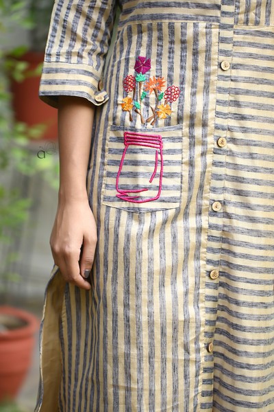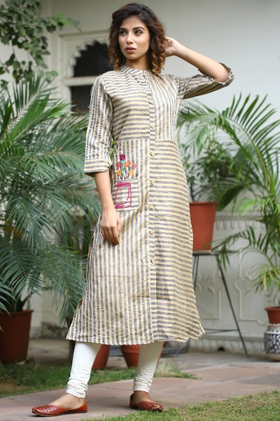 READY TO SHIP SINGLES AND MULTIPLES AVAILABLE Chanderi A-line stripes kurti with hand embrodiery Length - 50 inches Size - m xl xxl Single Price - 725 + gst Delivery in 2 days after ordering.... |