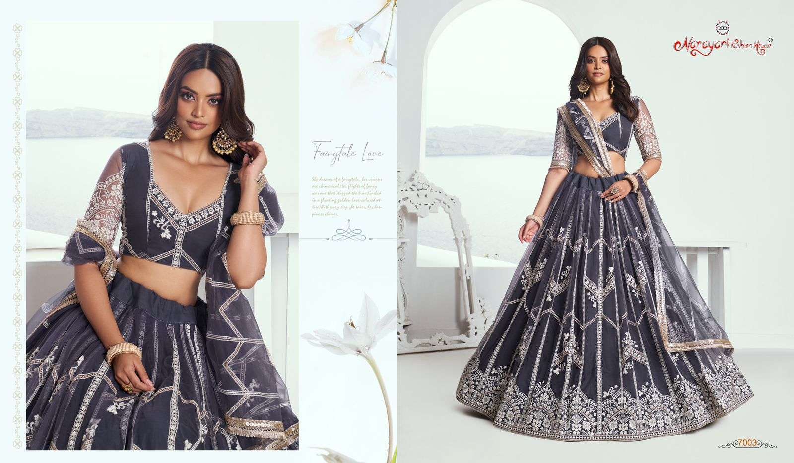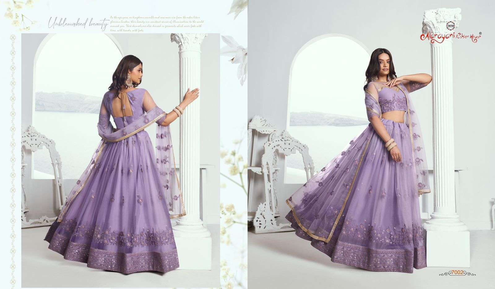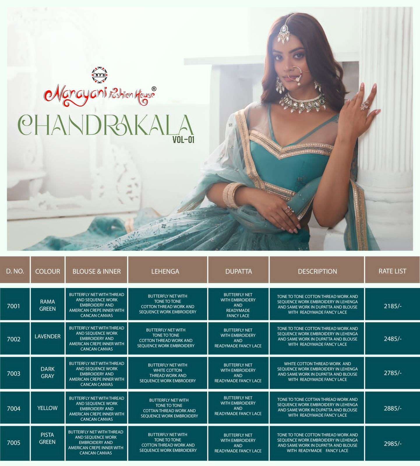 Narayani Fashion House Launch New Lehenga Catalogue Series BRAND NAME – *NARAYANI FASHION* CATALOG NAME – *CHANDRAKALA VOL-01* SERIES – 7001 TO 7005 D.NO 7004- Inproduction, Rest All available Fabric Details - send you on details photo. Work : Designer Thread work, Zari work and Sequence work Embroidery. Weight : 2 K.g. Lehenga size : Upto 42 Inch waist. Choli size : Make Upto 44 inch Bust. Dupatta : 2.50 meter. Lehenga Flair : 3 meter. Full inner with cancan canvas available Size : Semisttiched. RATE : Mention In Pricelist GST 12% EXTRA