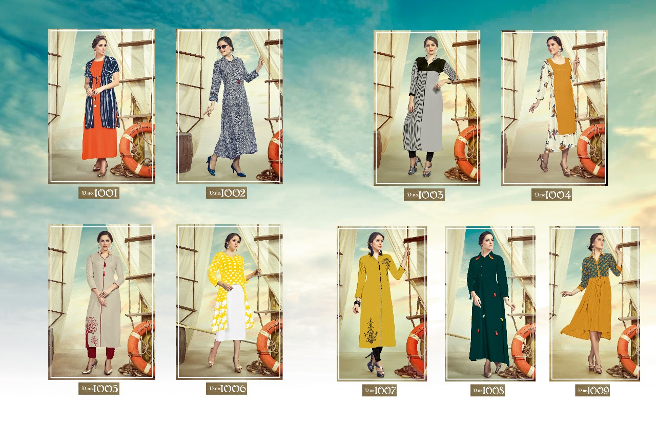 Buy Online Channel 9 Corona 1001 Series Reyon Print Kurti Dealer Surat 9 Pcs of Full Catalogue at Wholesale Price. Looking for Channel 9 Corona 1001 Series Reyon Print Kurti Dealer Surat Full Catalouge at Best Price? Buy Now Channel 9 Corona 1001 Series Reyon Print Kurti Dealer Surat at Wholesale Rate of Rs 4725 with Total 9 Pcs from authroized dealer and supplier of CHENNEL 9 Brand. Cost of Each piece is just only Rs 525 which is very low and affordable price to resale the product in your retail store ,This is Surat based Wholesale Supplier & Dealer of CHENNEL 9 Brand. Click on Brand name to Know more about CHENNEL 9 Brand's products.Call or Whatsapp on 9898838984 for booking or enquiry