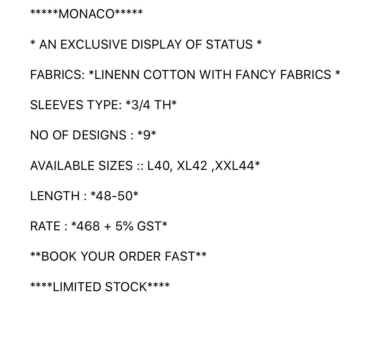 Brand - Chanel -9. Catlog name - MONACO. Size - L & XL . Set to set . GST 5 Percent Extra. Delivery- 26-06-18. |
