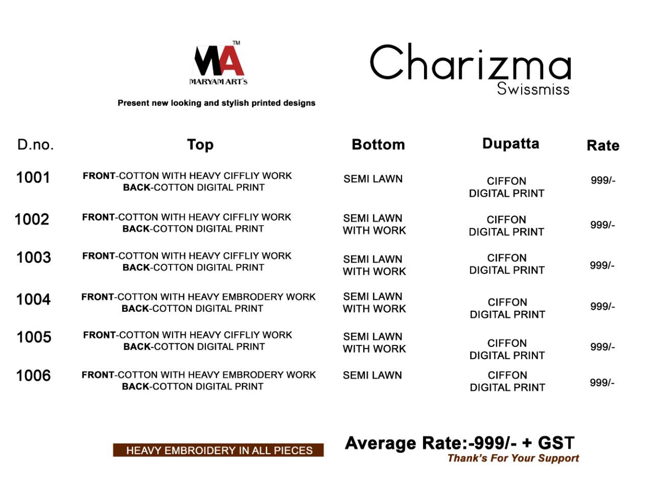 Buy Online Charizma Swissmiss By Maryam Art Pakistani Suits Wholesale Supplier Gujarat 6 Pcs of Full Catalogue at Wholesale Price. Looking for Charizma Swissmiss By Maryam Art Pakistani Suits Wholesale Supplier Gujarat Full Catalouge at Best Price? Buy Now Charizma Swissmiss By Maryam Art Pakistani Suits Wholesale Supplier Gujarat at Wholesale Rate of Rs 5994 with Total 6 Pcs from authroized dealer and supplier of Brand. Cost of Each piece is just only Rs 999 which is very low and affordable price to resale the product in your retail store ,This is Surat based Wholesale Supplier & Dealer of Brand. Click on Brand name to Know more about Brand's products.Call or Whatsapp on 9898838984 for booking or enquiry