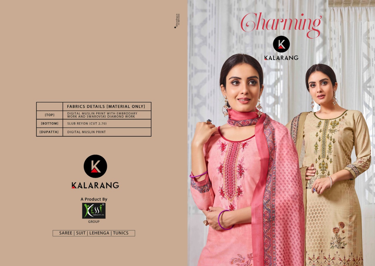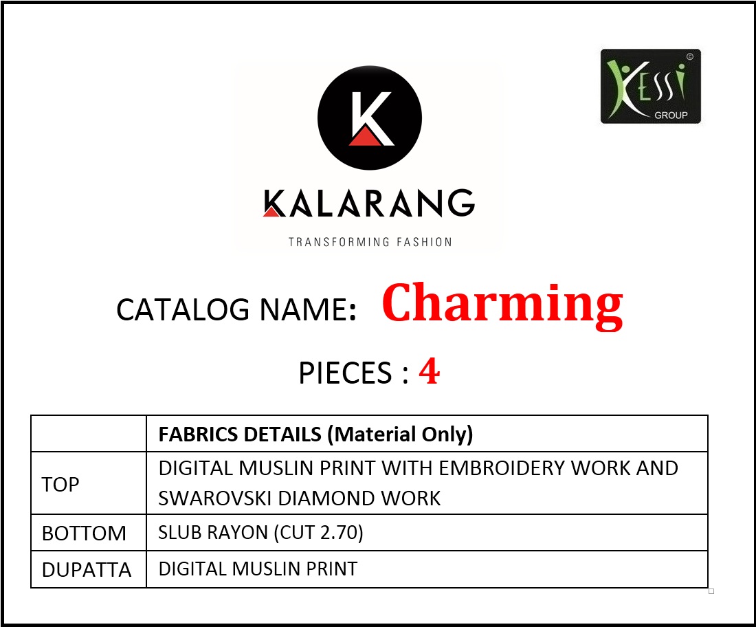 Buy Online Charming By Kalarang Musline Worked Suits Wholesale Supplier Nd Trader India 4 Pcs of Full Catalogue at Wholesale Price. Looking for Charming By Kalarang Musline Worked Suits Wholesale Supplier Nd Trader India Full Catalouge at Best Price? Buy Now Charming By Kalarang Musline Worked Suits Wholesale Supplier Nd Trader India at Wholesale Rate of Rs 3580 with Total 4 Pcs from authroized dealer and supplier of KALARANG Brand. Cost of Each piece is just only Rs 895 which is very low and affordable price to resale the product in your retail store ,This is Surat based Wholesale Supplier & Dealer of KALARANG Brand. Click on Brand name to Know more about KALARANG Brand's products.Call or Whatsapp on 9898838984 for booking or enquiry