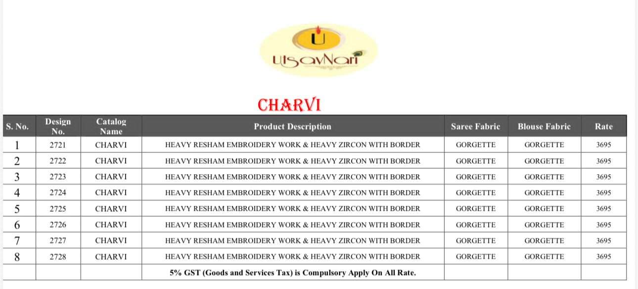 Buy Online CHARVI by Utsav nari fashion saree collection manufacturer Surat 8 Pcs of Full Catalogue at Wholesale Price. Looking for CHARVI by Utsav nari fashion saree collection manufacturer Surat Full Catalouge at Best Price? Buy Now CHARVI by Utsav nari fashion saree collection manufacturer Surat at Wholesale Rate of Rs 29560 with Total 8 Pcs from authroized dealer and supplier of UTSAV NARI Brand. Cost of Each piece is just only Rs 3695 which is very low and affordable price to resale the product in your retail store ,This is Surat based Wholesale Supplier & Dealer of UTSAV NARI Brand. Click on Brand name to Know more about UTSAV NARI Brand's products.Call or Whatsapp on 9898838984 for booking or enquiry