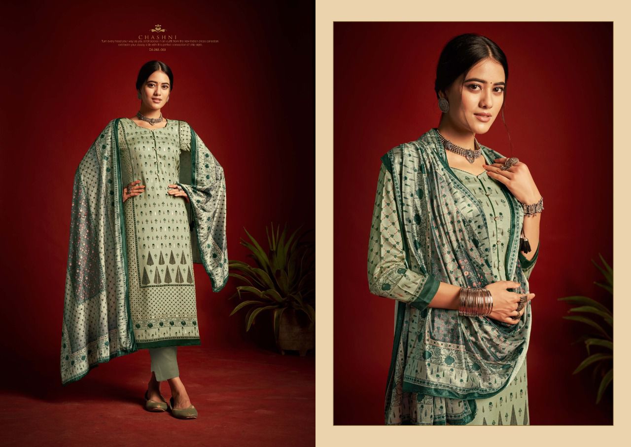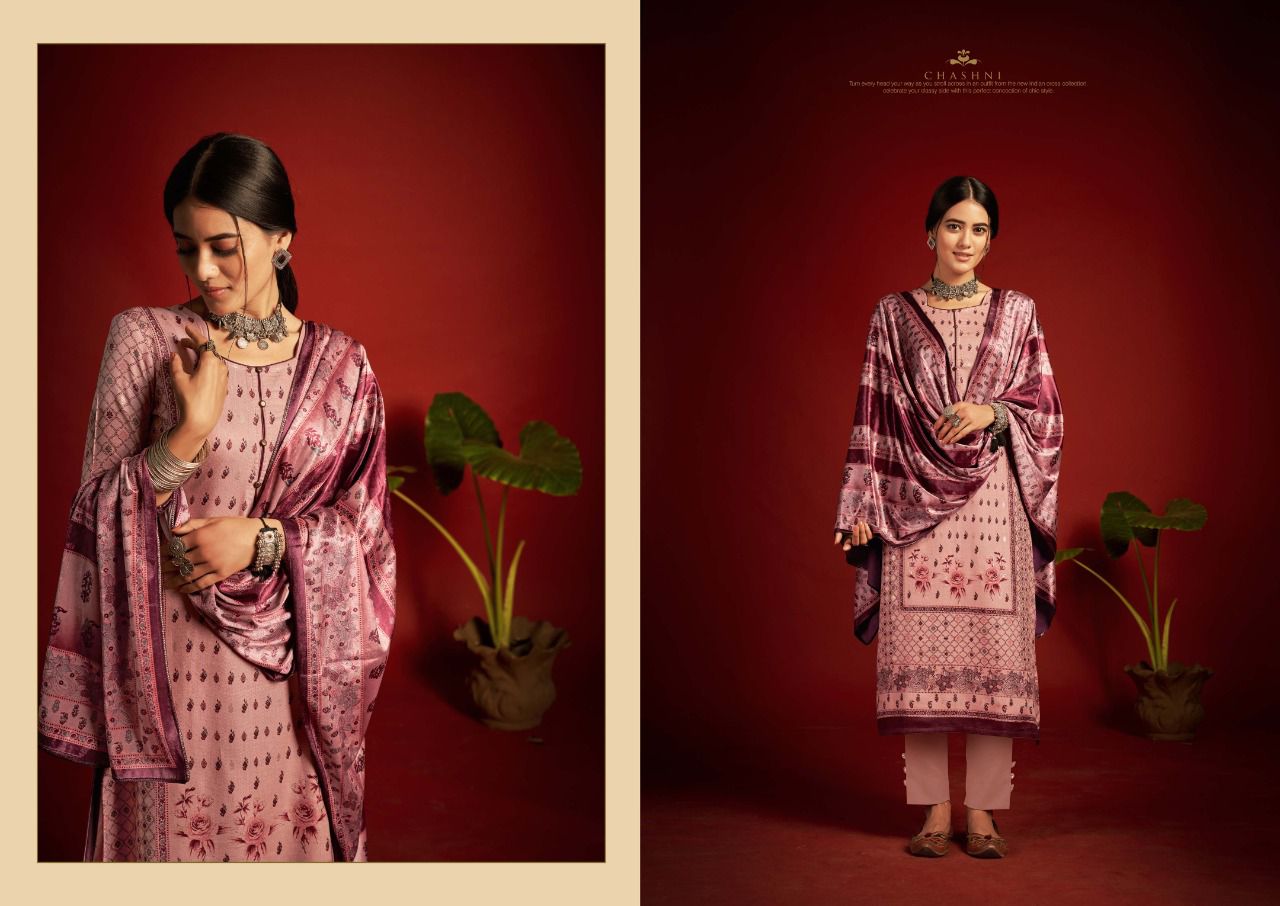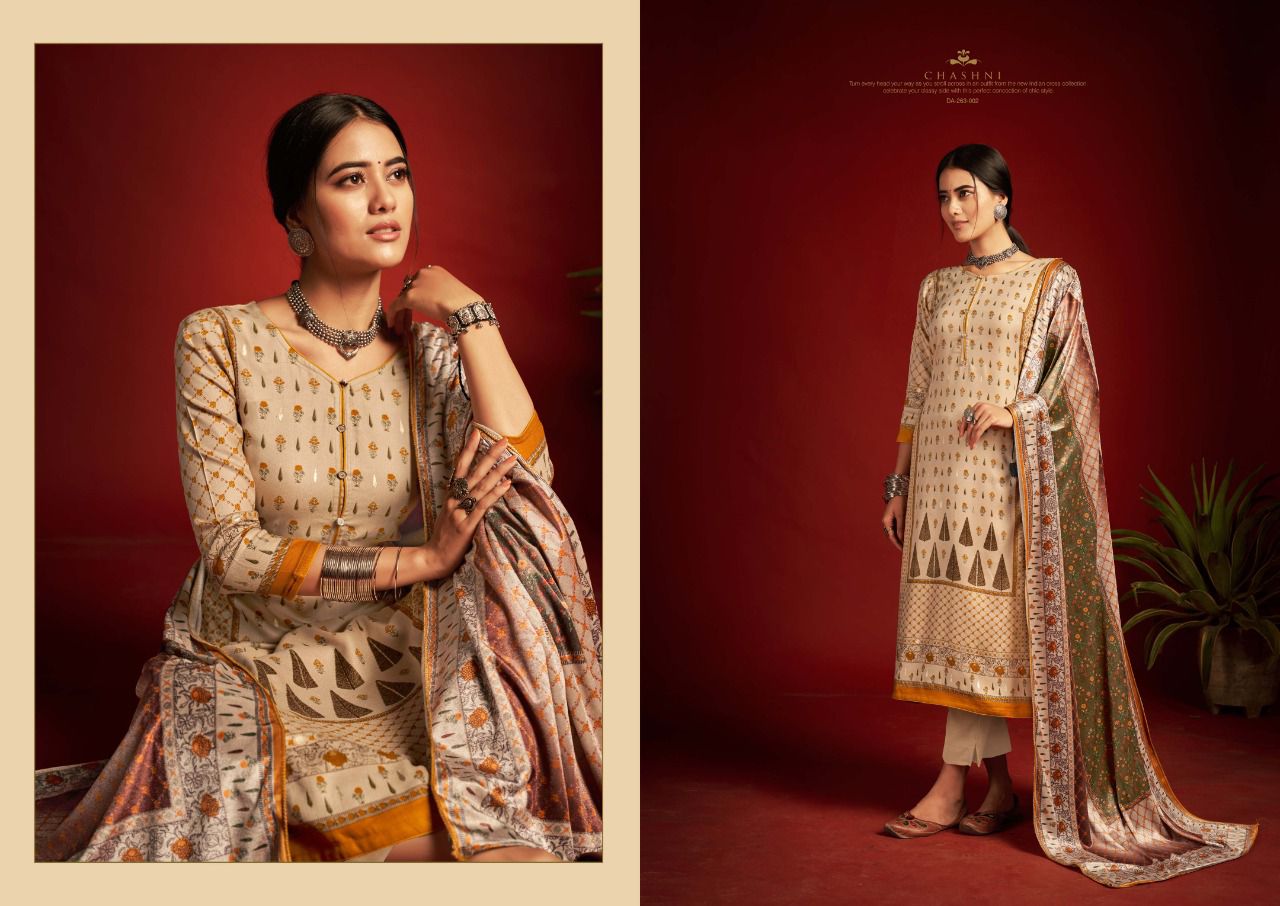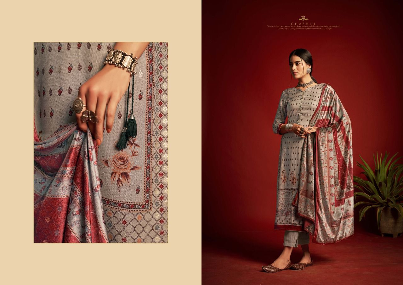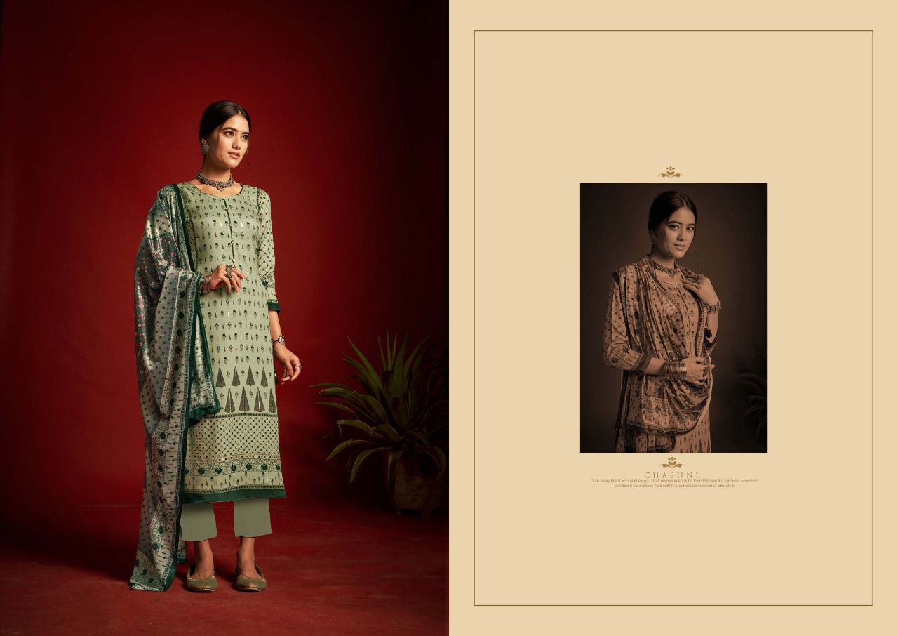 ???SARGAM ??? A PREMIUM COLLETION OF WOOLEN SUITS. ?**CHASHNI**? ? *Fabrics details*? ?*Top:- PURE VISCOSE PASHMINA DIGITAL DESIGNER PRINTS WITH FOIL WORK ??*Dupatta: - PURE VELVET DIGITAL PRINT ?*Bottom: -PURE PASHMINA DYED ?*Price:- ?1125/-Ex Set to set ?*Designes:-8 Pcs* ?BY :- *SARGAM GROUP* |