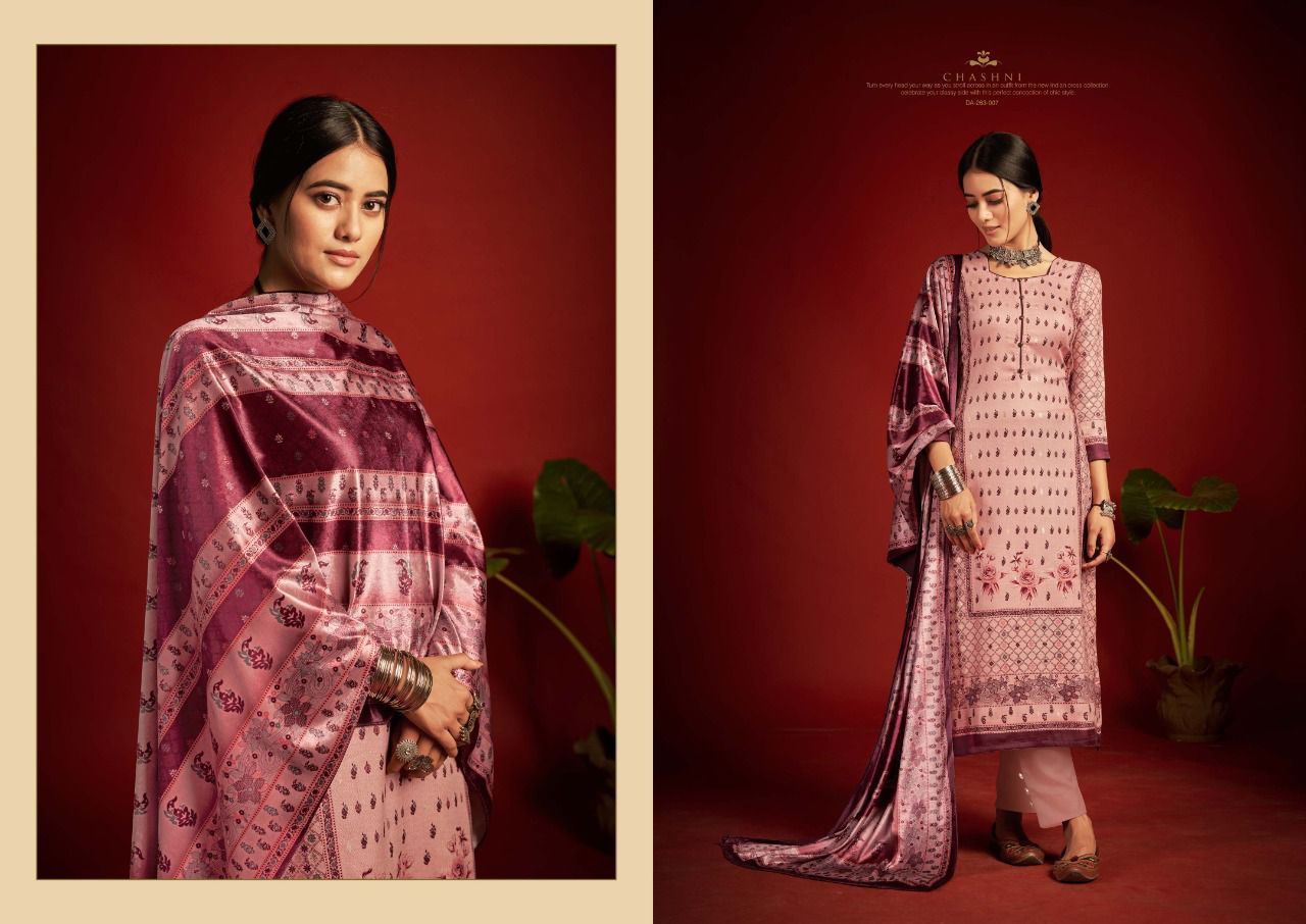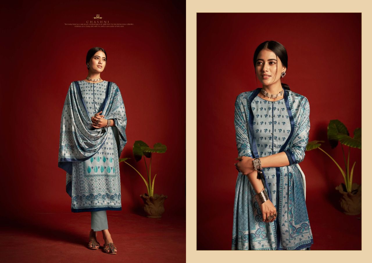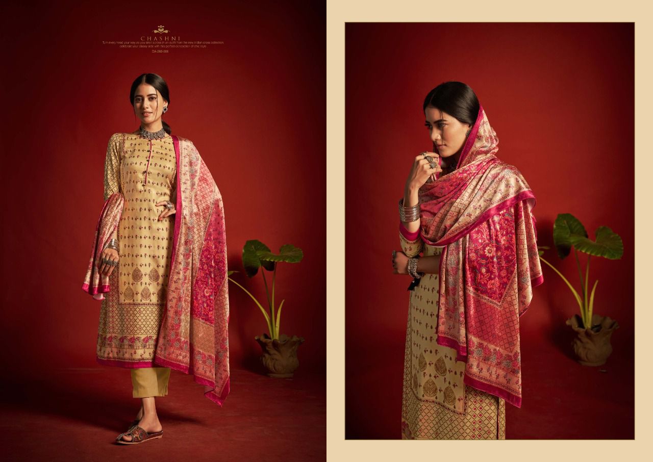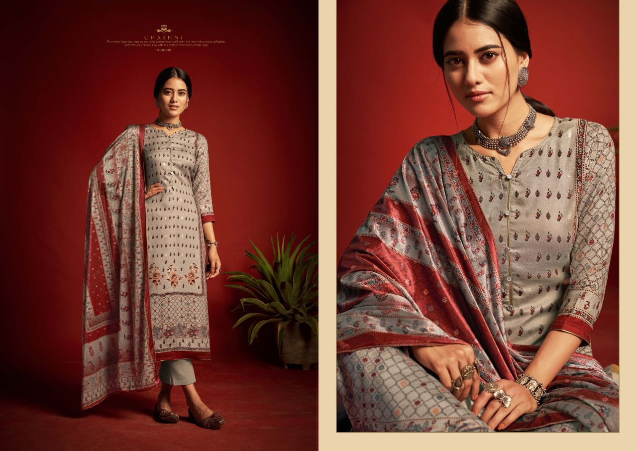 ???SARGAM ??? A PREMIUM COLLETION OF WOOLEN SUITS. ?**CHASHNI**? ? *Fabrics details*? ?*Top:- PURE VISCOSE PASHMINA DIGITAL DESIGNER PRINTS WITH FOIL WORK ??*Dupatta: - PURE VELVET DIGITAL PRINT ?*Bottom: -PURE PASHMINA DYED ?*Price:- ?1125/-Ex Set to set ?*Designes:-8 Pcs* ?BY :- *SARGAM GROUP* |