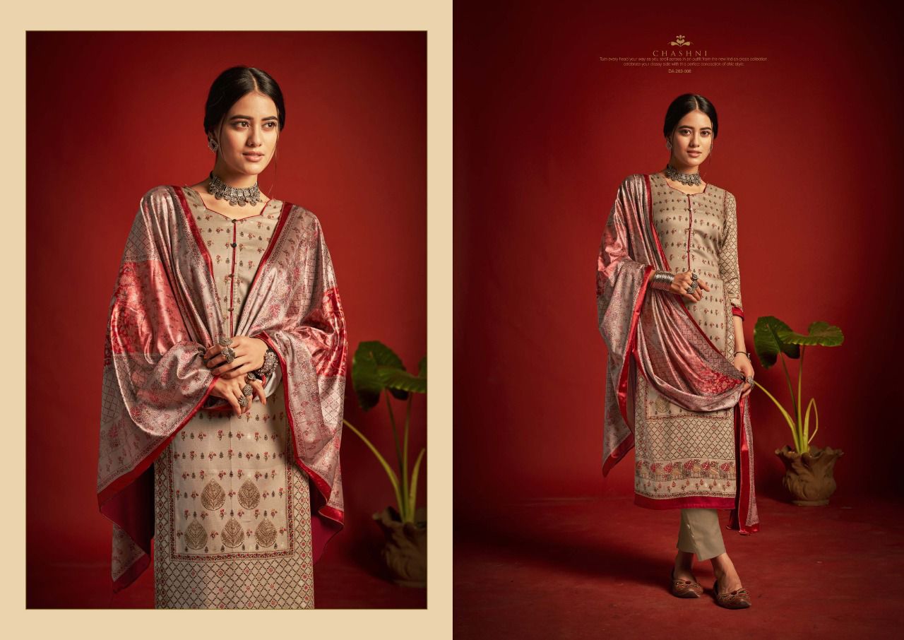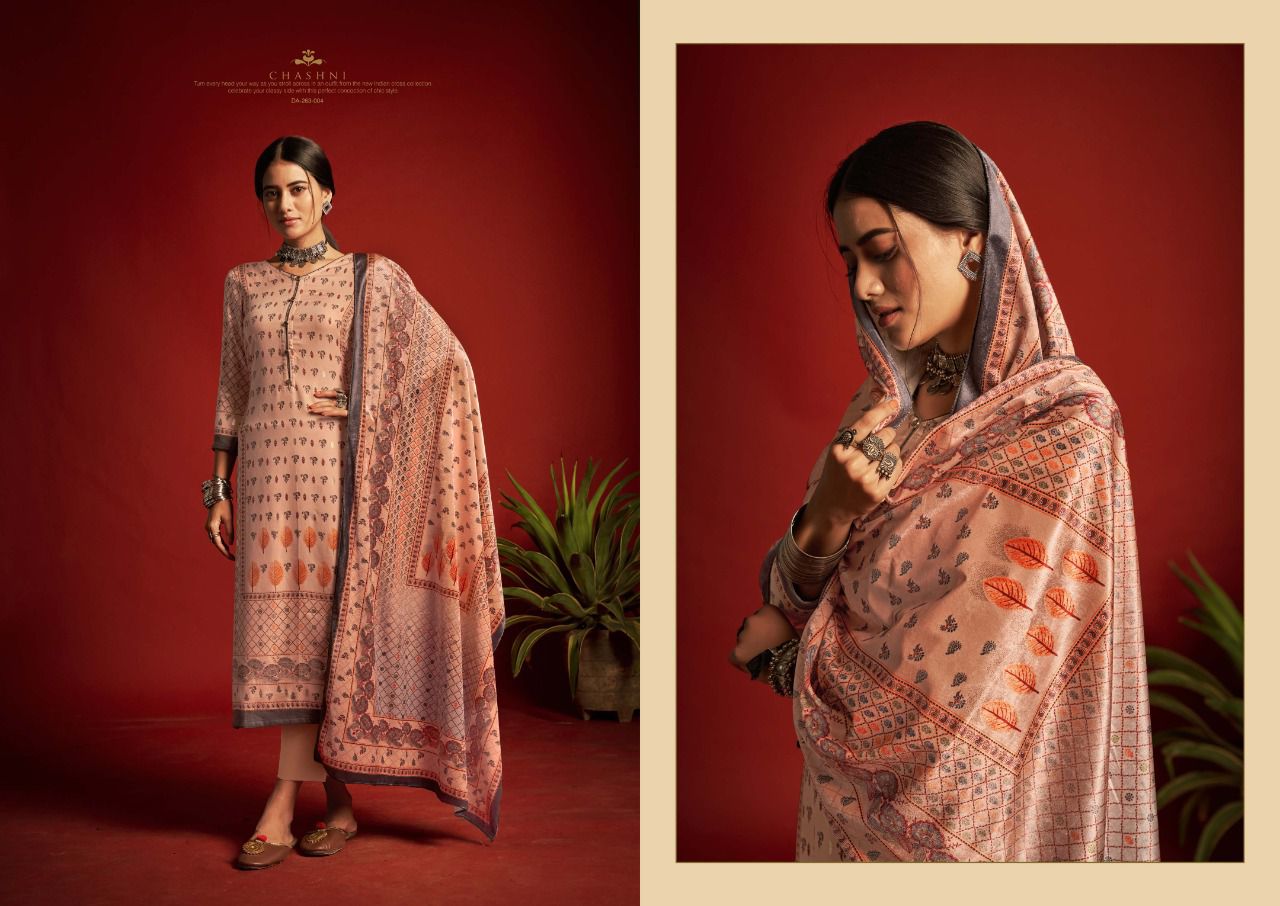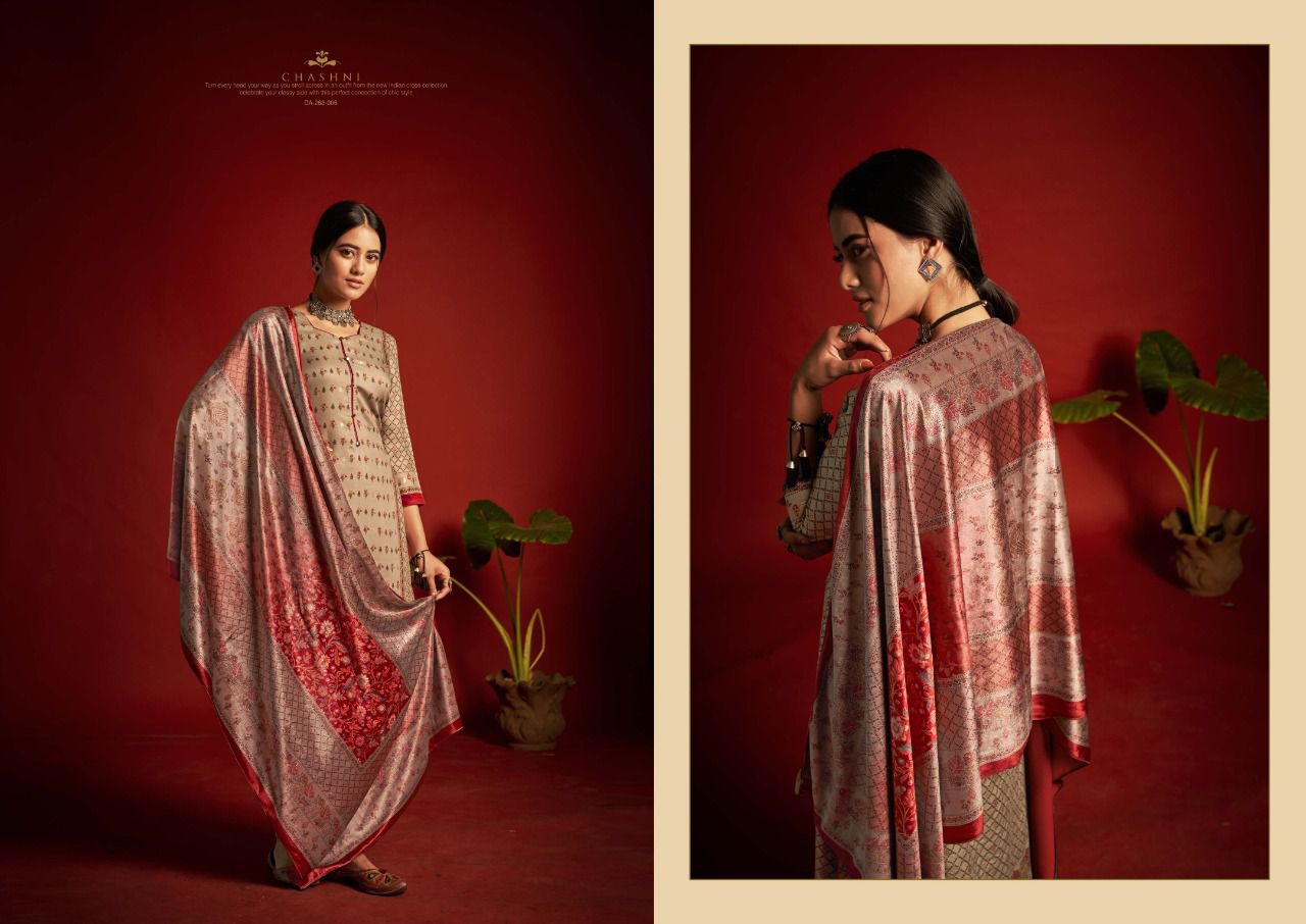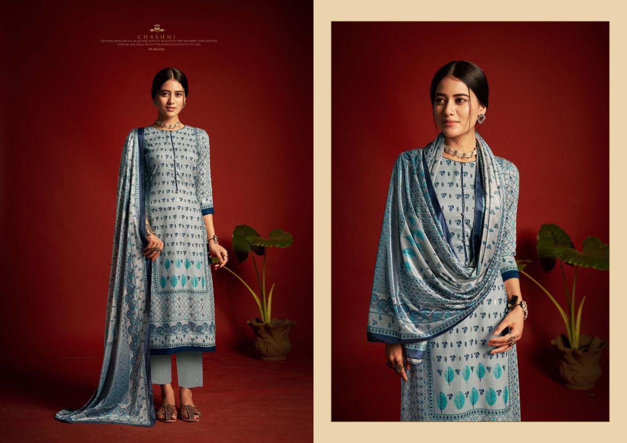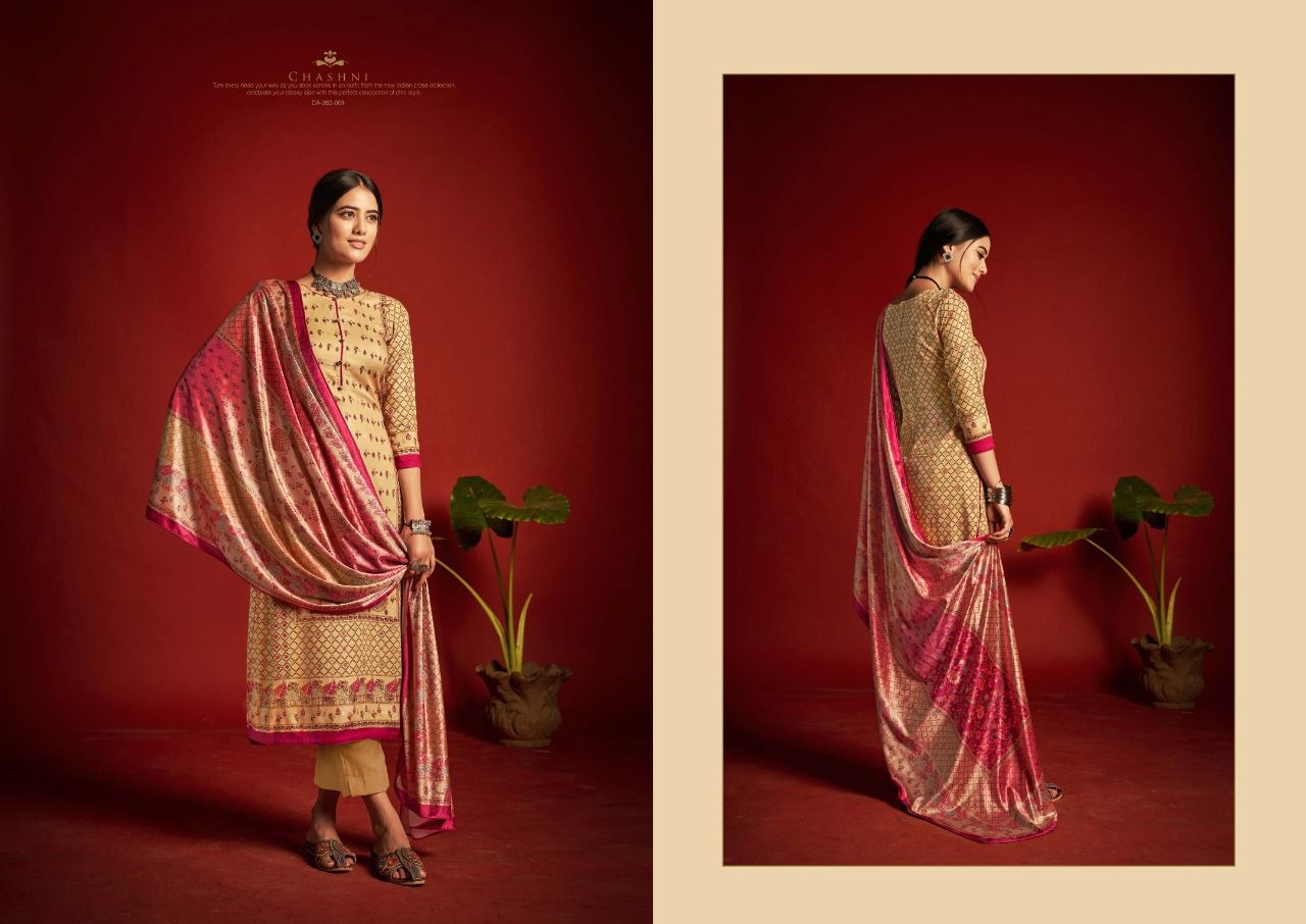 ???SARGAM ??? A PREMIUM COLLETION OF WOOLEN SUITS. ?**CHASHNI**? ? *Fabrics details*? ?*Top:- PURE VISCOSE PASHMINA DIGITAL DESIGNER PRINTS WITH FOIL WORK ??*Dupatta: - PURE VELVET DIGITAL PRINT ?*Bottom: -PURE PASHMINA DYED ?*Price:- ?1125/-Ex Set to set ?*Designes:-8 Pcs* ?BY :- *SARGAM GROUP* |