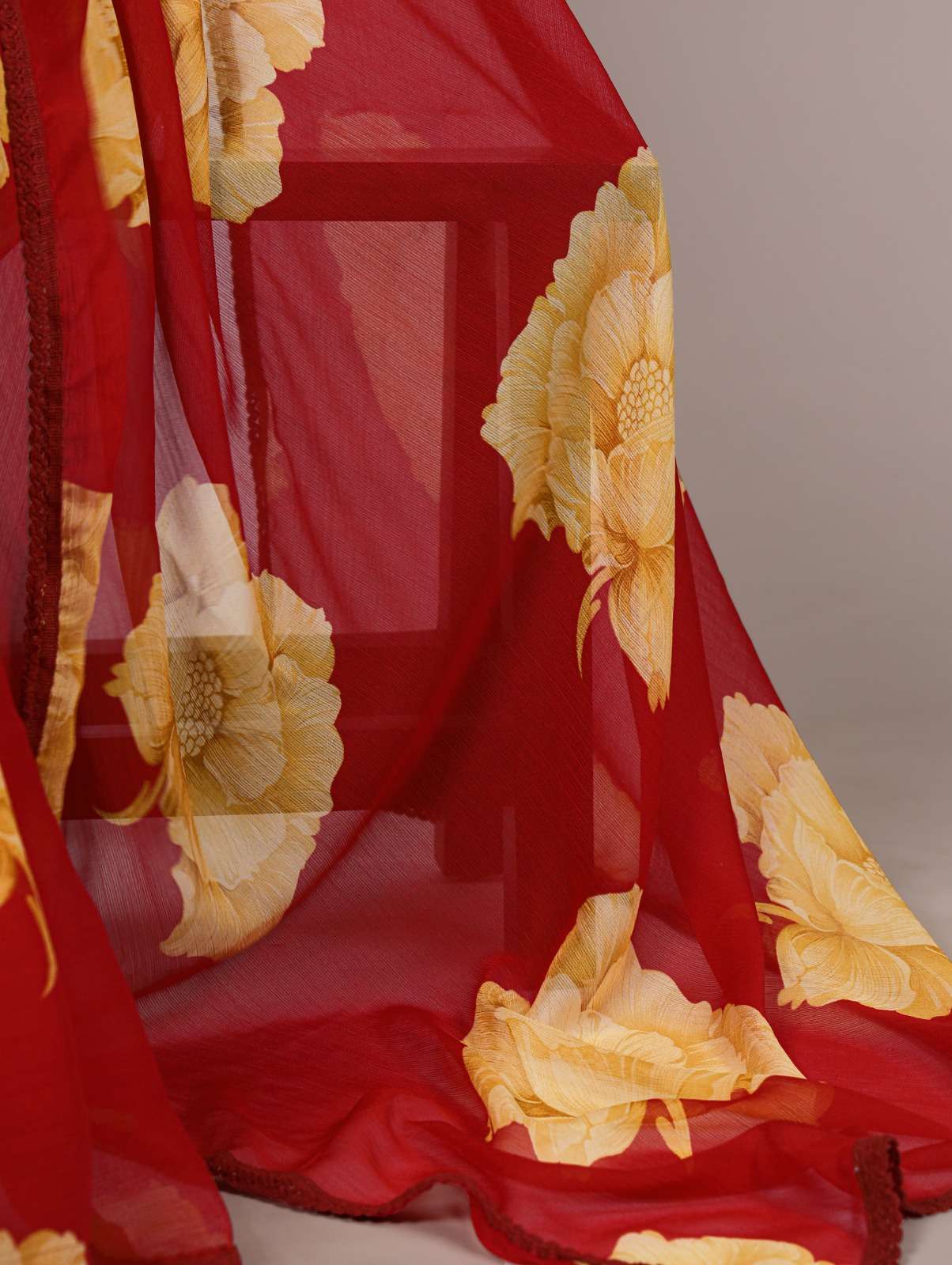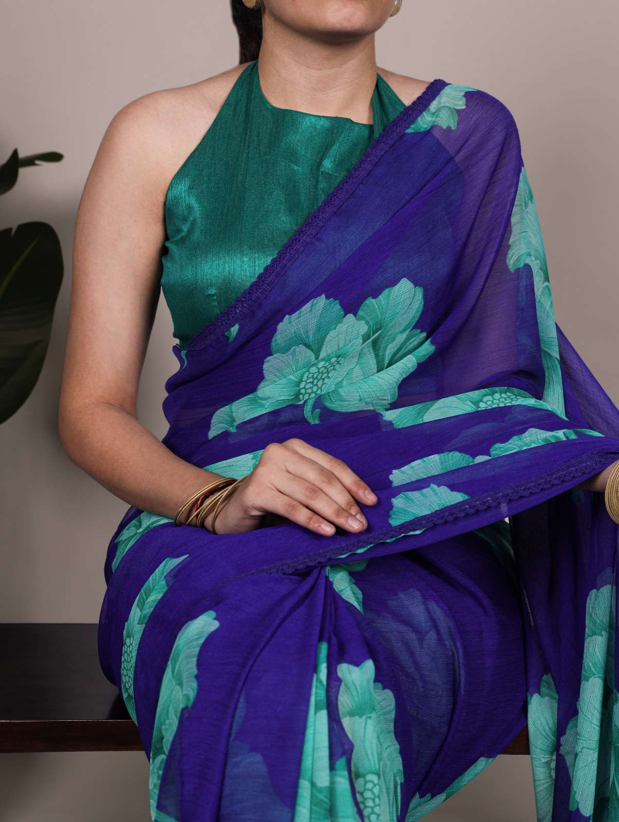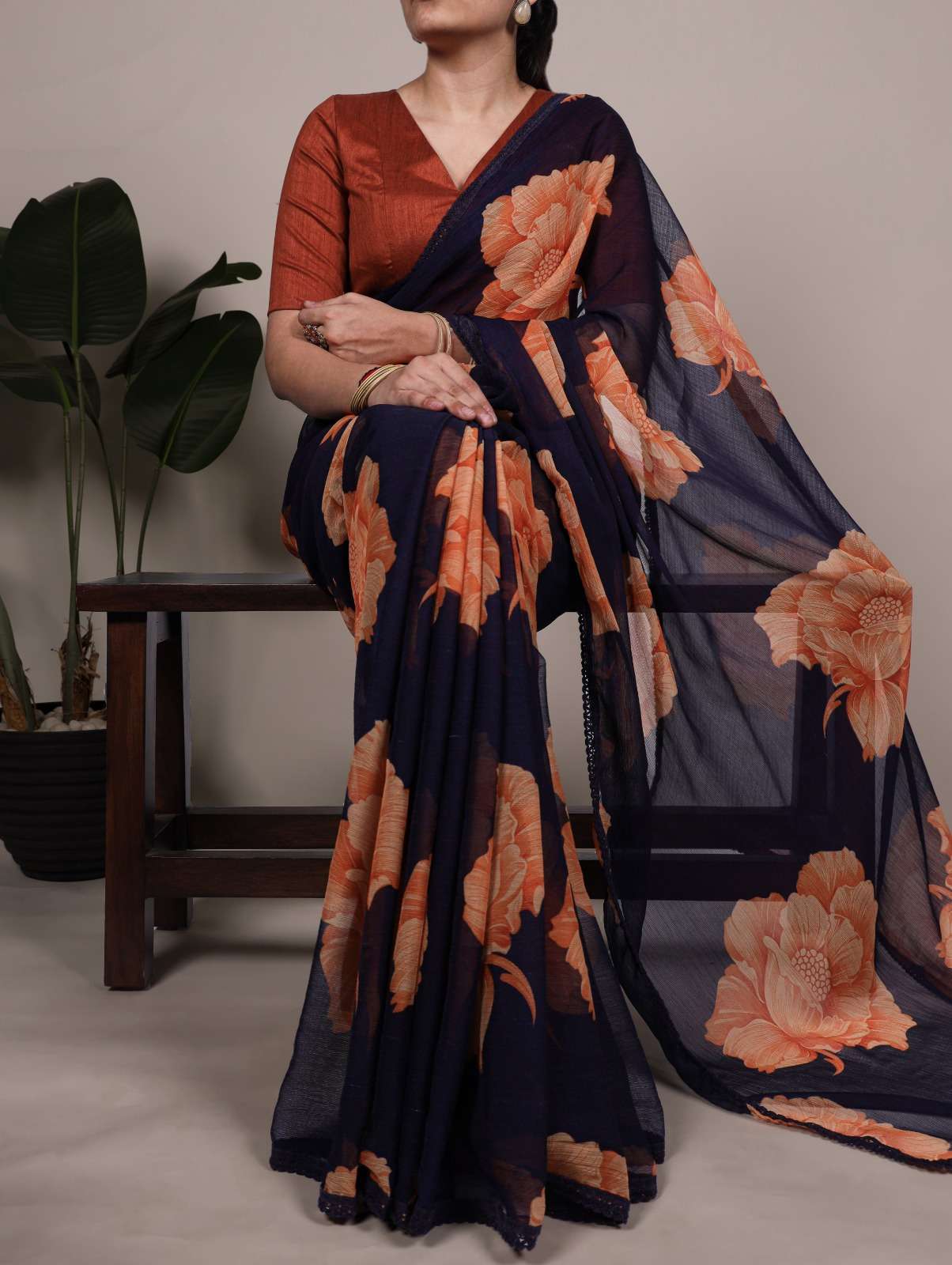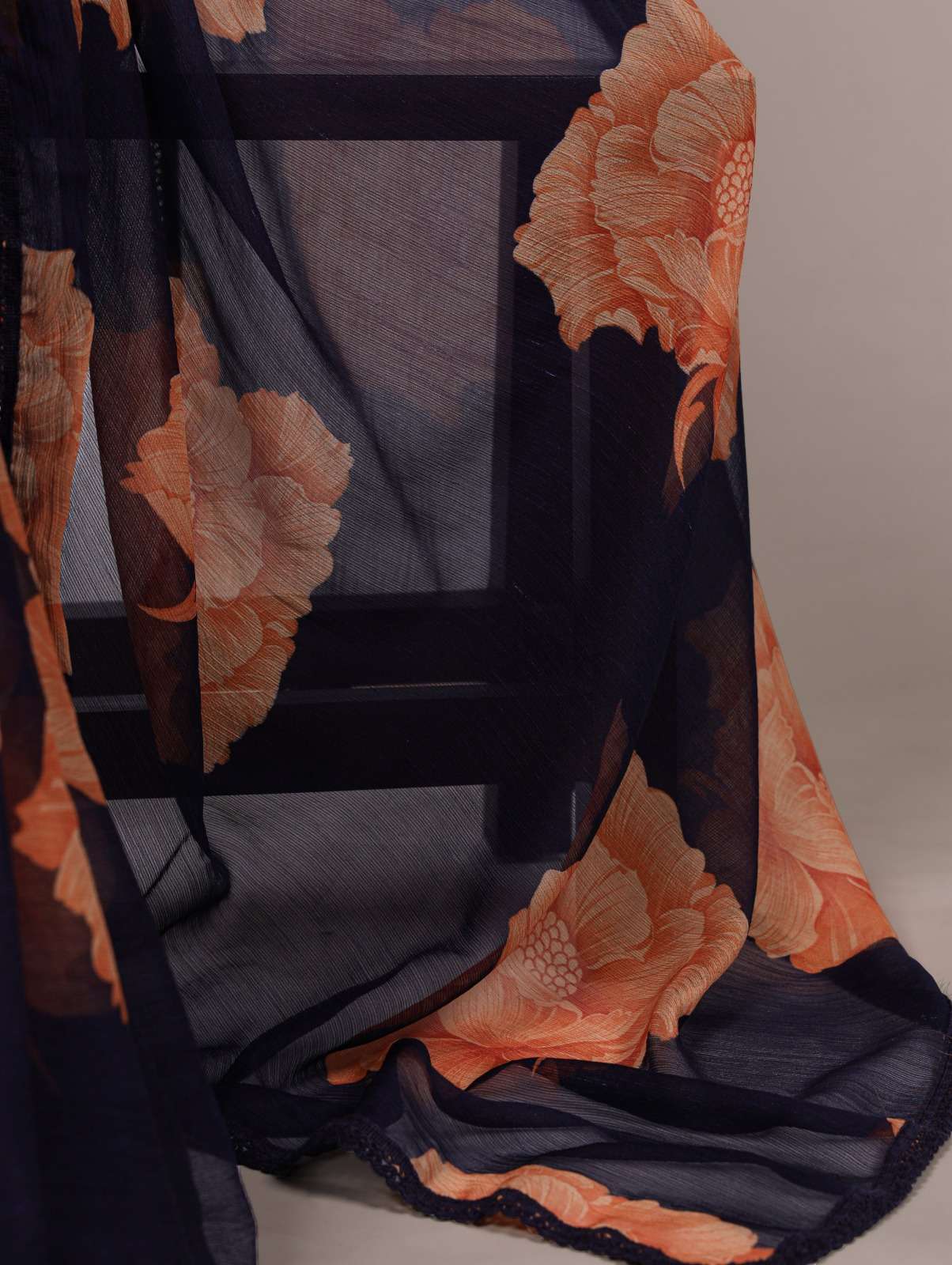 The perfect harmony of airy chiffon and blooming florals. 🌸 *Saree* Saree Fabric : Chiffon Saree work : Floral Print With Lace Border Saree length : 5.5 meter