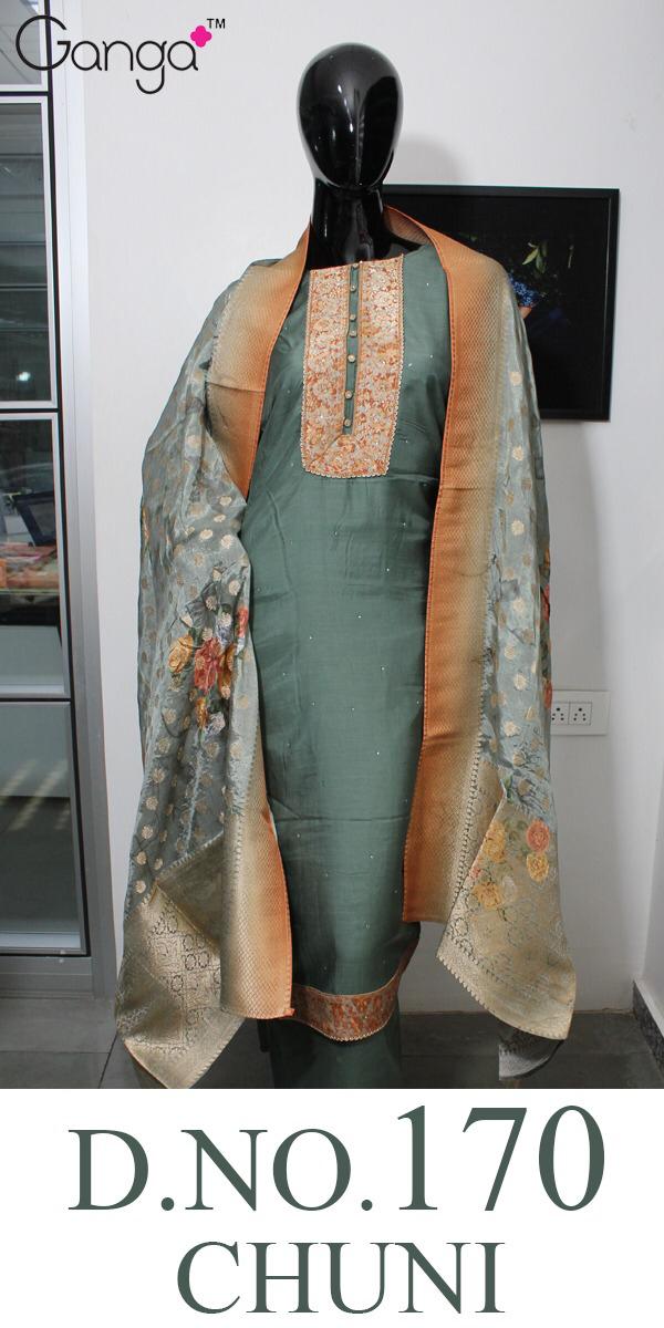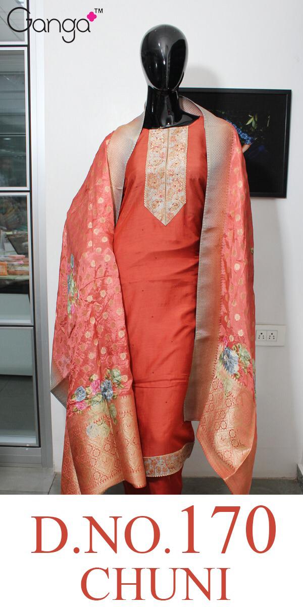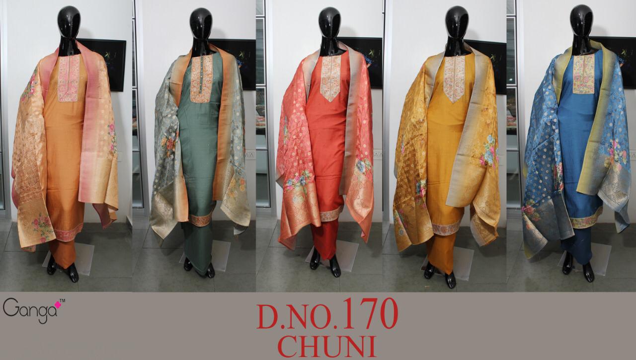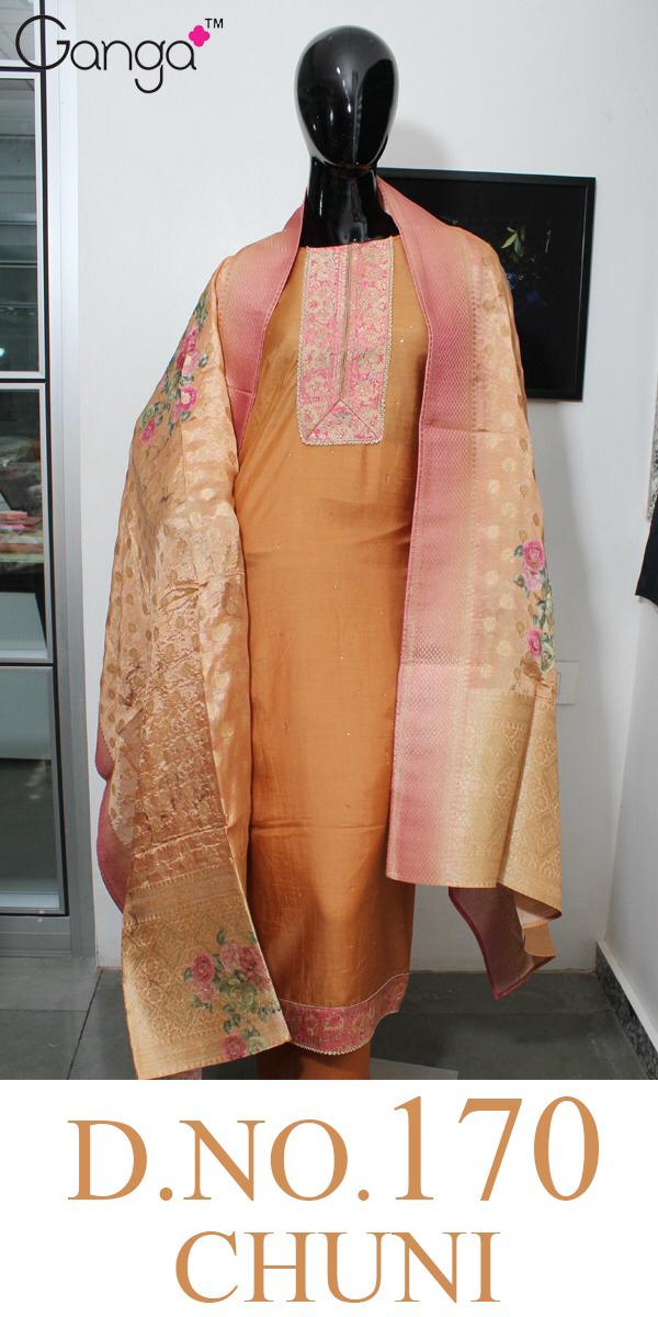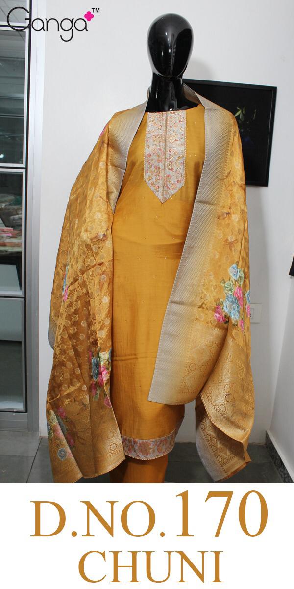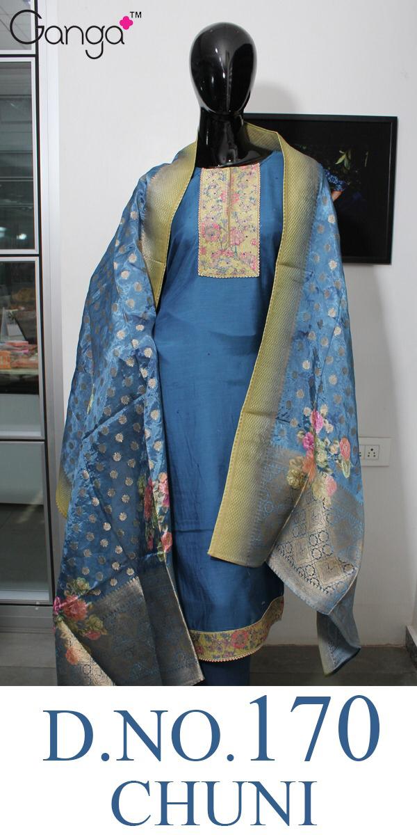 Buy Online Chuni 170 By Ganga Silk Embroidered Suits Wholesale Supplier Gujarat 5 Pcs of Full Catalogue at Wholesale Price. Looking for Chuni 170 By Ganga Silk Embroidered Suits Wholesale Supplier Gujarat Full Catalouge at Best Price? Buy Now Chuni 170 By Ganga Silk Embroidered Suits Wholesale Supplier Gujarat at Wholesale Rate of Rs 10875 with Total 5 Pcs from authroized dealer and supplier of GANGA Brand. Cost of Each piece is just only Rs 2175 which is very low and affordable price to resale the product in your retail store ,This is Surat based Wholesale Supplier & Dealer of GANGA Brand. Click on Brand name to Know more about GANGA Brand's products.Call or Whatsapp on 9898838984 for booking or enquiry