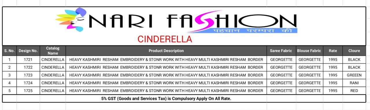 Buy Online Cinderella By Nari Fashion 1721 To 1725 Georgette Designer Party Wear Sarees Wholesale Supplier India 5 Pcs of Full Catalogue at Wholesale Price. Looking for Cinderella By Nari Fashion 1721 To 1725 Georgette Designer Party Wear Sarees Wholesale Supplier India Full Catalouge at Best Price? Buy Now Cinderella By Nari Fashion 1721 To 1725 Georgette Designer Party Wear Sarees Wholesale Supplier India at Wholesale Rate of Rs 9975 with Total 5 Pcs from authroized dealer and supplier of Nari Fashion Brand. Cost of Each piece is just only Rs 1995 which is very low and affordable price to resale the product in your retail store ,This is Surat based Wholesale Supplier & Dealer of Nari Fashion Brand. Click on Brand name to Know more about Nari Fashion Brand's products.Call or Whatsapp on 9898838984 for booking or enquiry