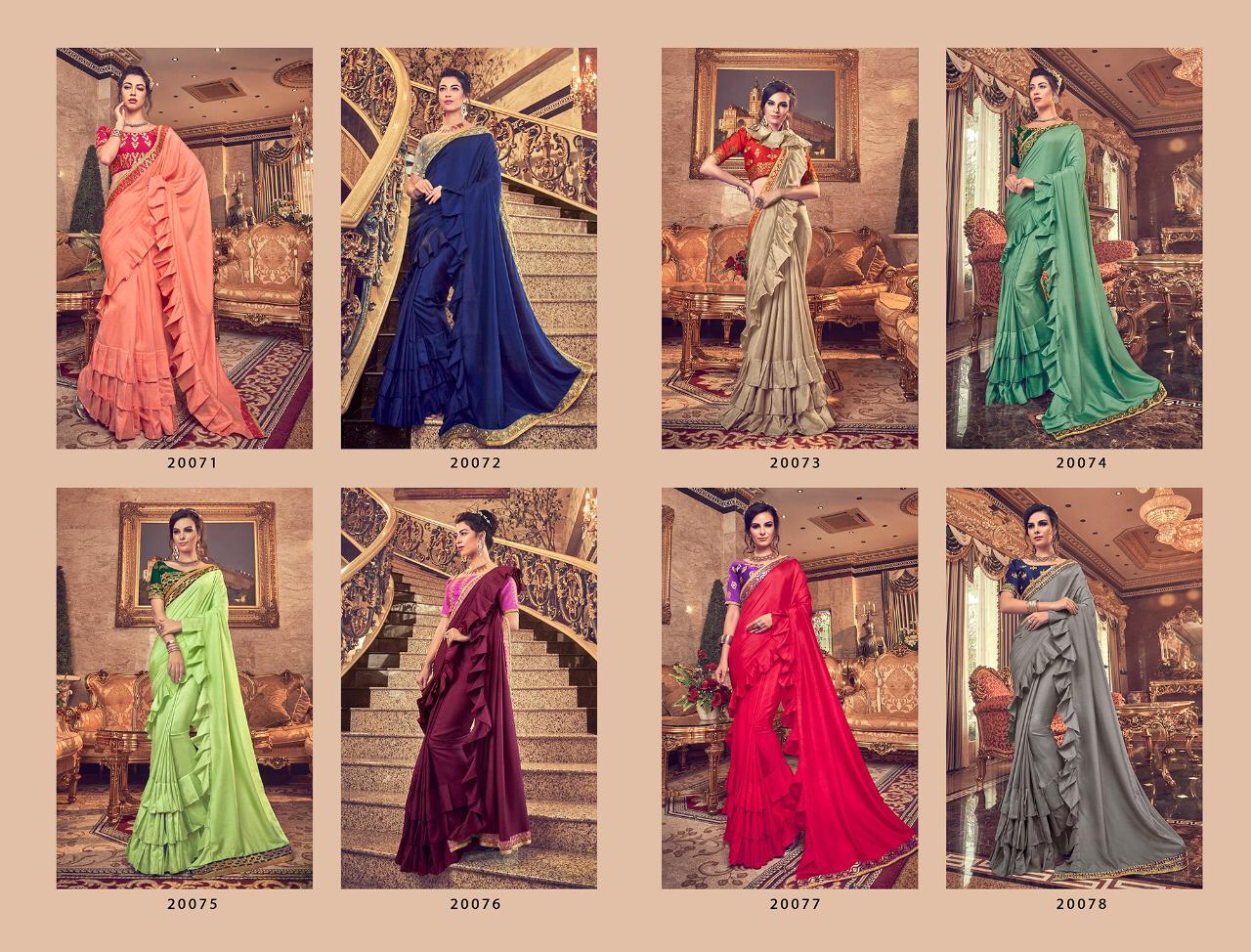 Buy Online Cindrella By Shangrila 20071 Series Designer Dola Silk Party Wear Frill Saree Collection Wholesaler Surat 8 Pcs of Full Catalogue at Wholesale Price. Looking for Cindrella By Shangrila 20071 Series Designer Dola Silk Party Wear Frill Saree Collection Wholesaler Surat Full Catalouge at Best Price? Buy Now Cindrella By Shangrila 20071 Series Designer Dola Silk Party Wear Frill Saree Collection Wholesaler Surat at Wholesale Rate of Rs 7960 with Total 8 Pcs from authroized dealer and supplier of SHANGRILA Brand. Cost of Each piece is just only Rs 995 which is very low and affordable price to resale the product in your retail store ,This is Surat based Wholesale Supplier & Dealer of SHANGRILA Brand. Click on Brand name to Know more about SHANGRILA Brand's products.Call or Whatsapp on 9898838984 for booking or enquiry
