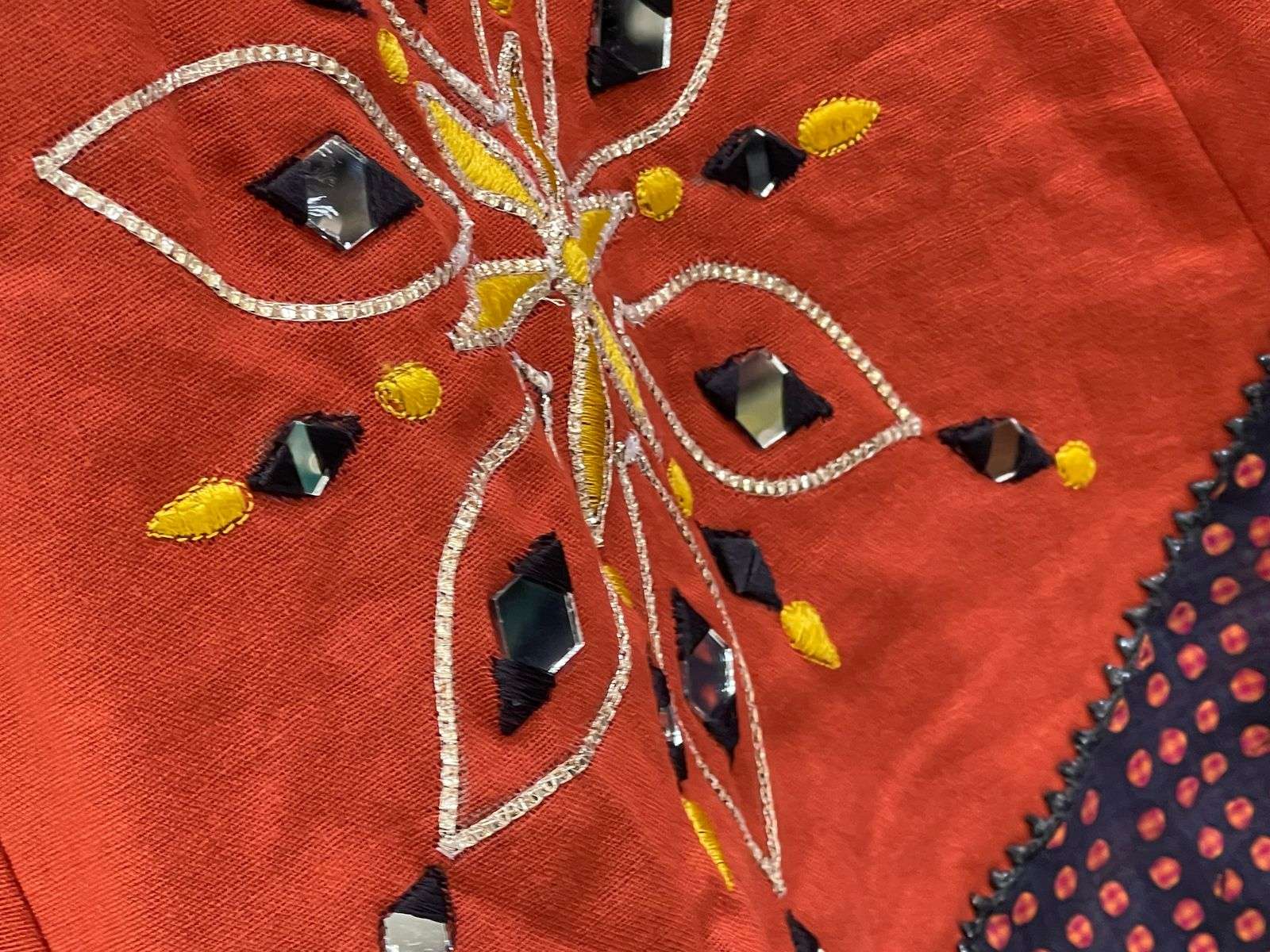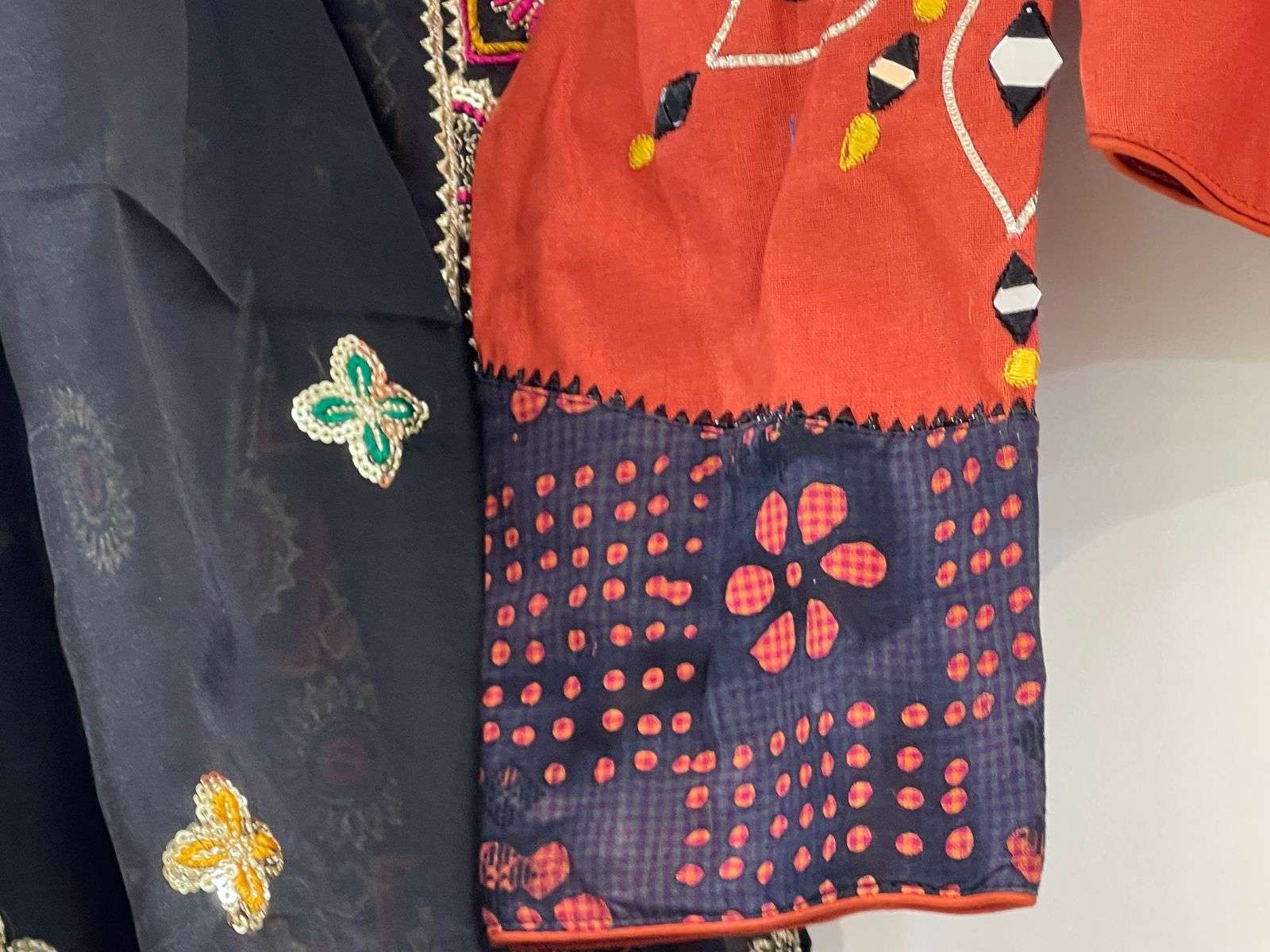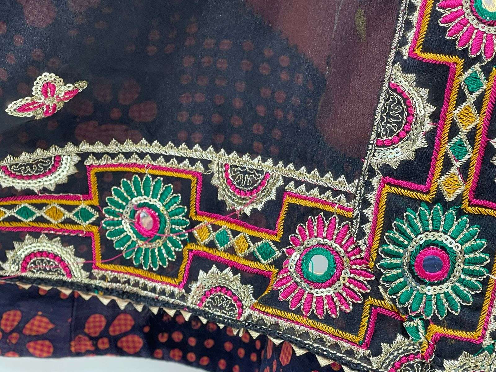 *Blouse*: *Designer Cotton Flex print & manual👋 thread embroidered mirror work Best quality full long sleeves 🪡 work blouse with matching latkan 38” size plus margin 2” for Size L*