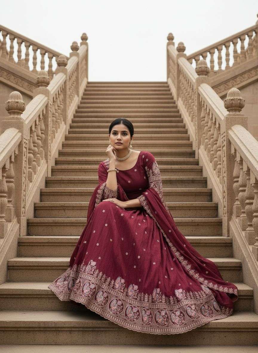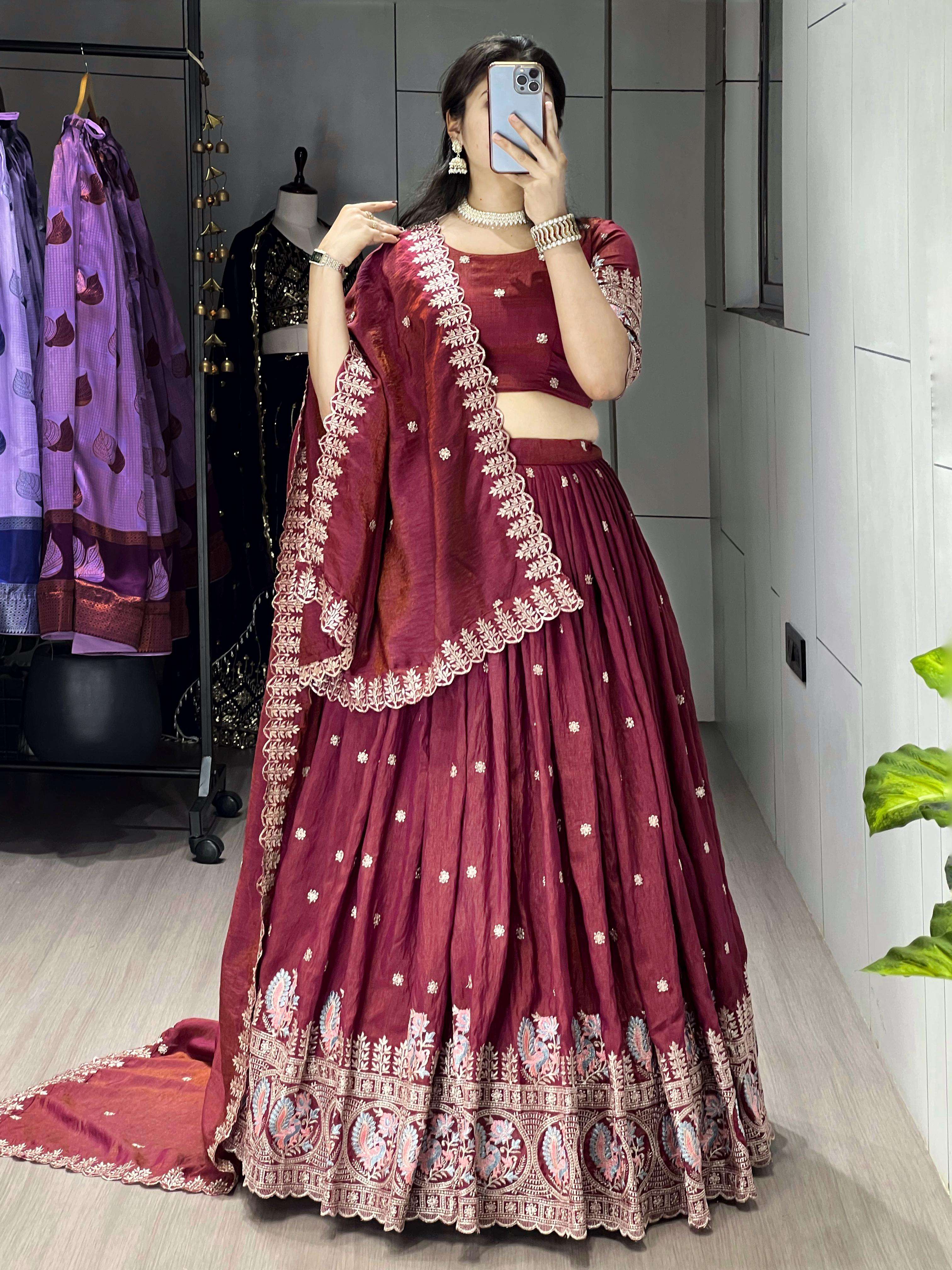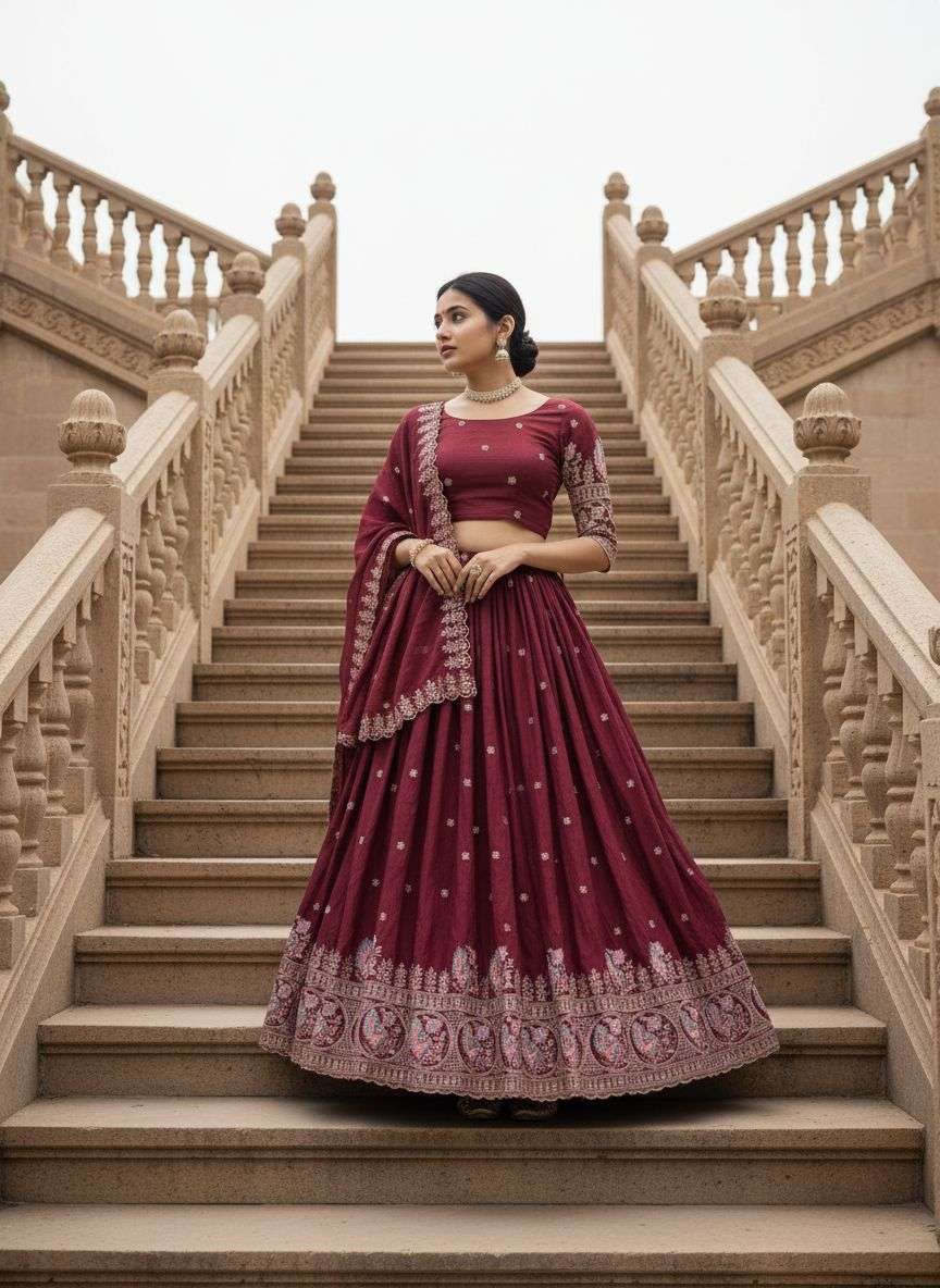 👉🏻Dazzle in our embroidered burgundy lehenga, Crafted in Natural Chinon Finish Vichitra Fabric, beautifully adorned with intricate Multicolored thread work for a regal festive look. Perfect for weddings and special occasions, this designer lehenga blends luxury, tradition, and timeless elegance.✨👜