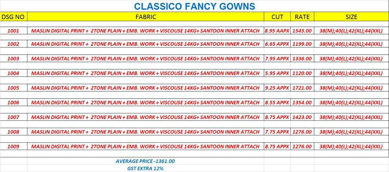 Buy Online Classico Fancy Gowns By Tunic Masline Digital Printed Party Wear Gowns Wholesale Supplier Surat 9 Pcs of Full Catalogue at Wholesale Price. Looking for Classico Fancy Gowns By Tunic Masline Digital Printed Party Wear Gowns Wholesale Supplier Surat Full Catalouge at Best Price? Buy Now Classico Fancy Gowns By Tunic Masline Digital Printed Party Wear Gowns Wholesale Supplier Surat at Wholesale Rate of Rs 12249 with Total 9 Pcs from authroized dealer and supplier of BRAND'S Brand. Cost of Each piece is just only Rs 1361 which is very low and affordable price to resale the product in your retail store ,This is Surat based Wholesale Supplier & Dealer of BRAND'S Brand. Click on Brand name to Know more about BRAND'S Brand's products.Call or Whatsapp on 9898838984 for booking or enquiry