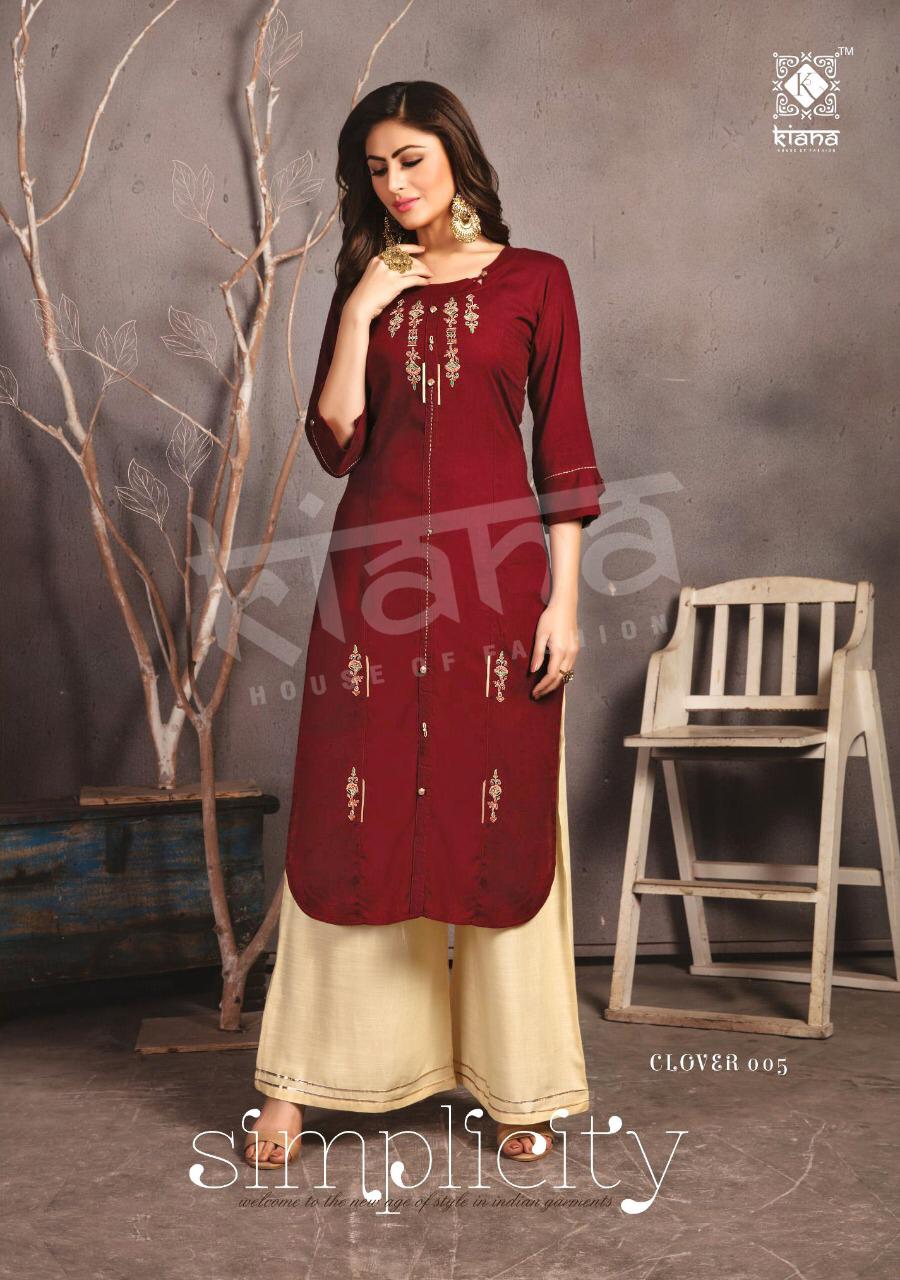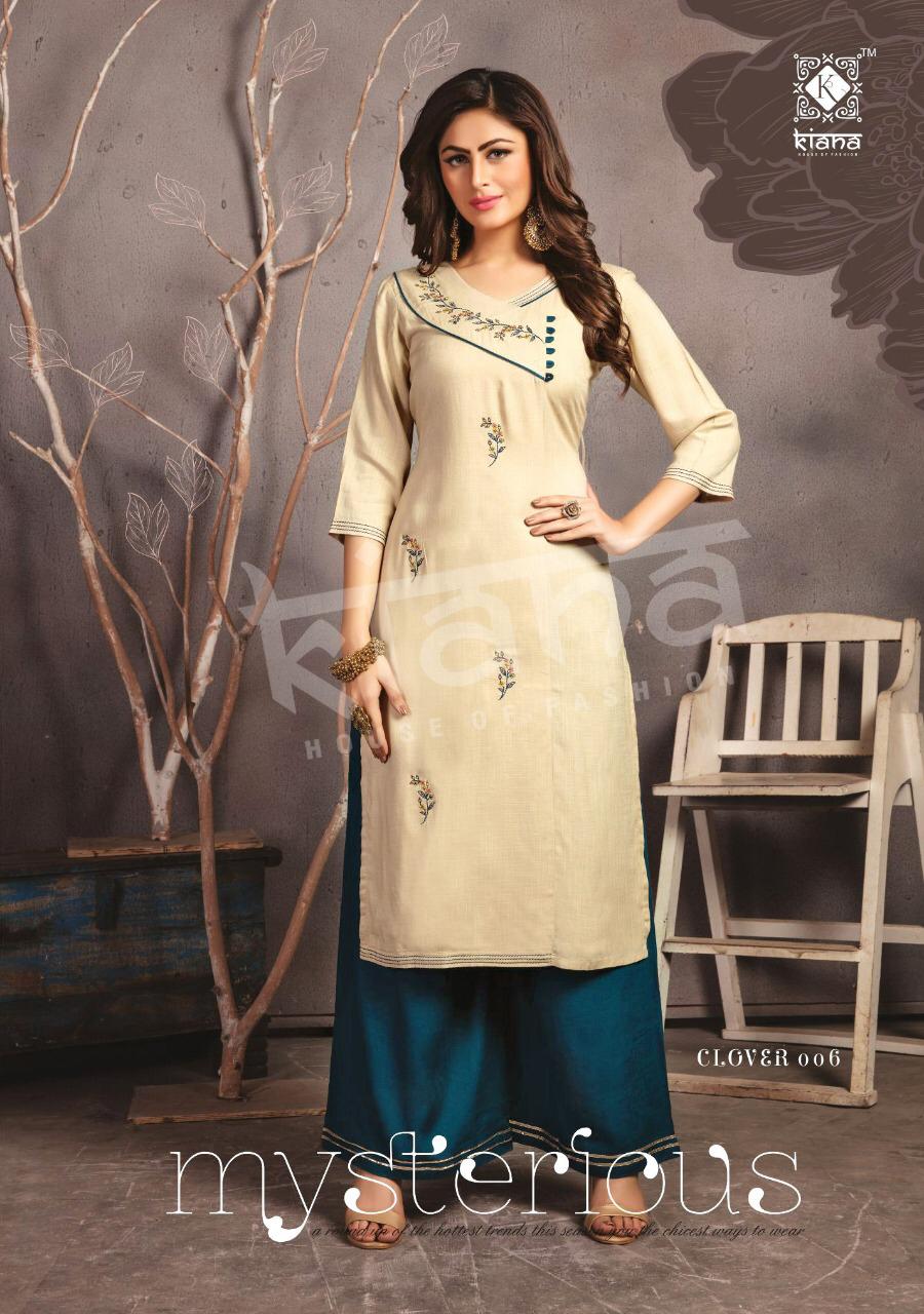 The Test of Premium Collection *?Kiana?* *house of fashion* CLOVER by kiana house of fashion kurties wholesaler surat Catalogue Name- 7 New series *?CLOVER ?* ?Details *?Fabrics* :- 14kg Reyon slub and , Hevy work , 2 pices Plzo set *?Size* :- M(19) L(20) XL(21) XXL(22) 3xxl(23) *? Length* :-46 top *?Designs* :- 8pcs *Price 799+gst full catlog* |