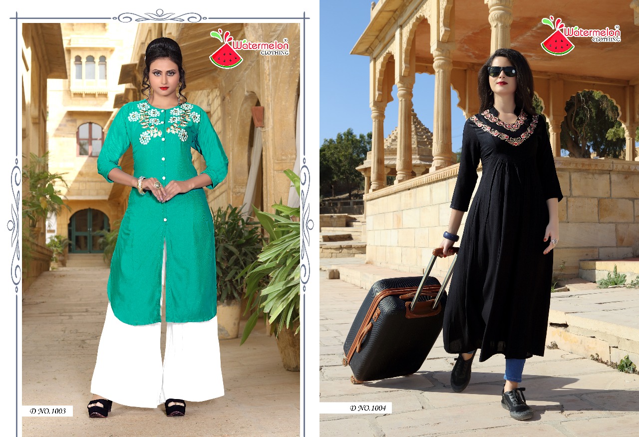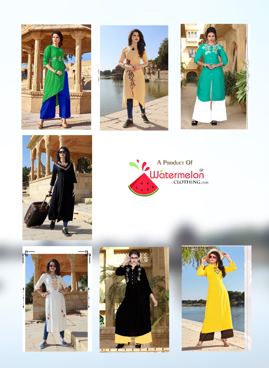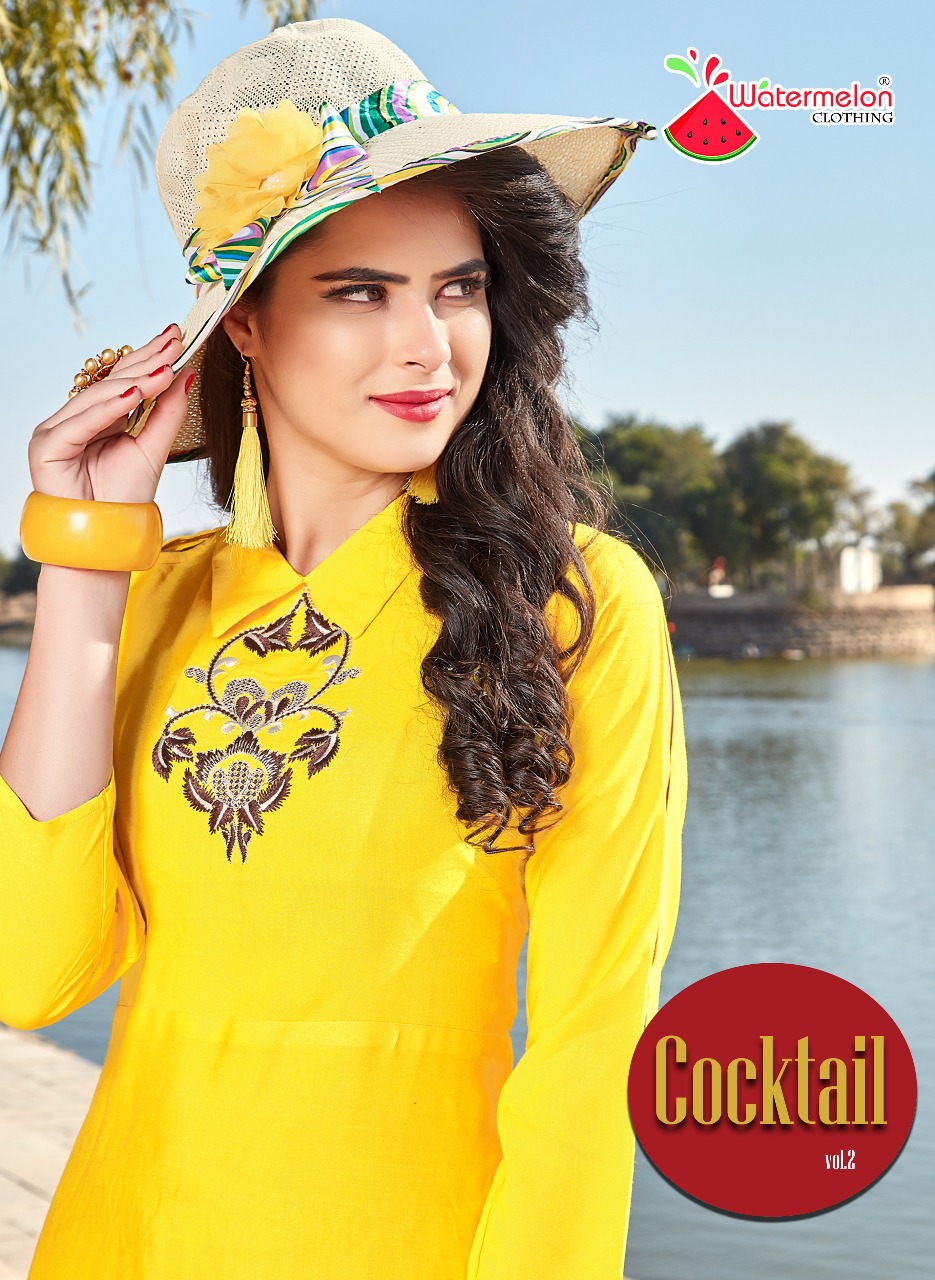 Buy Online Cocktail Vol 2 By Watermelon 1001 Series Fancy Reyon Kurti Collection Wholesale Dealer Surat 7 Pcs of Full Catalogue at Wholesale Price. Looking for Cocktail Vol 2 By Watermelon 1001 Series Fancy Reyon Kurti Collection Wholesale Dealer Surat Full Catalouge at Best Price? Buy Now Cocktail Vol 2 By Watermelon 1001 Series Fancy Reyon Kurti Collection Wholesale Dealer Surat at Wholesale Rate of Rs 3465 with Total 7 Pcs from authroized dealer and supplier of WATERMELON Brand. Cost of Each piece is just only Rs 495 which is very low and affordable price to resale the product in your retail store ,This is Surat based Wholesale Supplier & Dealer of WATERMELON Brand. Click on Brand name to Know more about WATERMELON Brand's products.Call or Whatsapp on 9898838984 for booking or enquiry